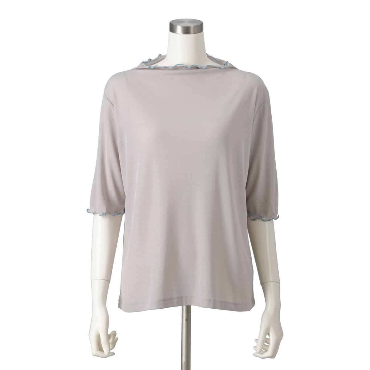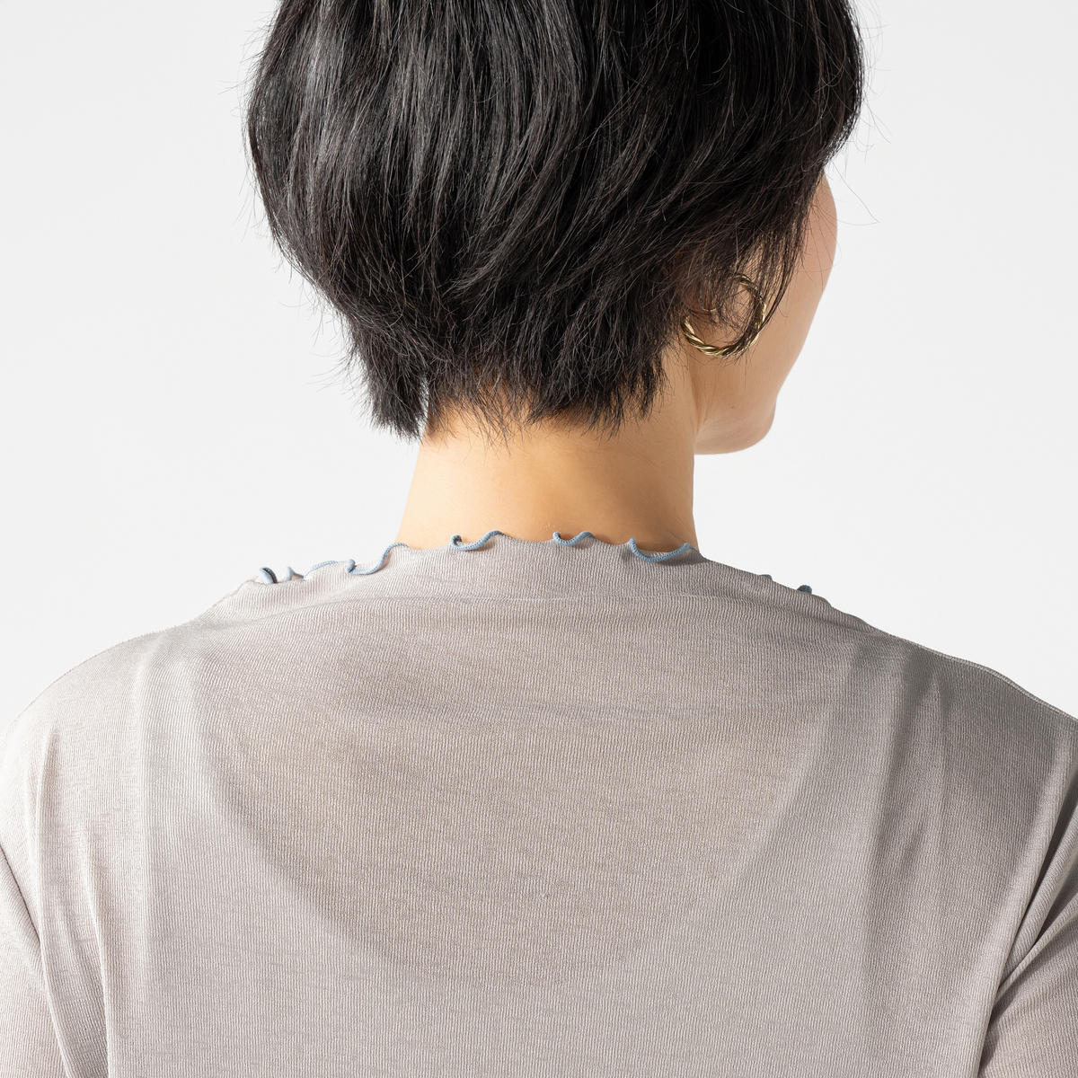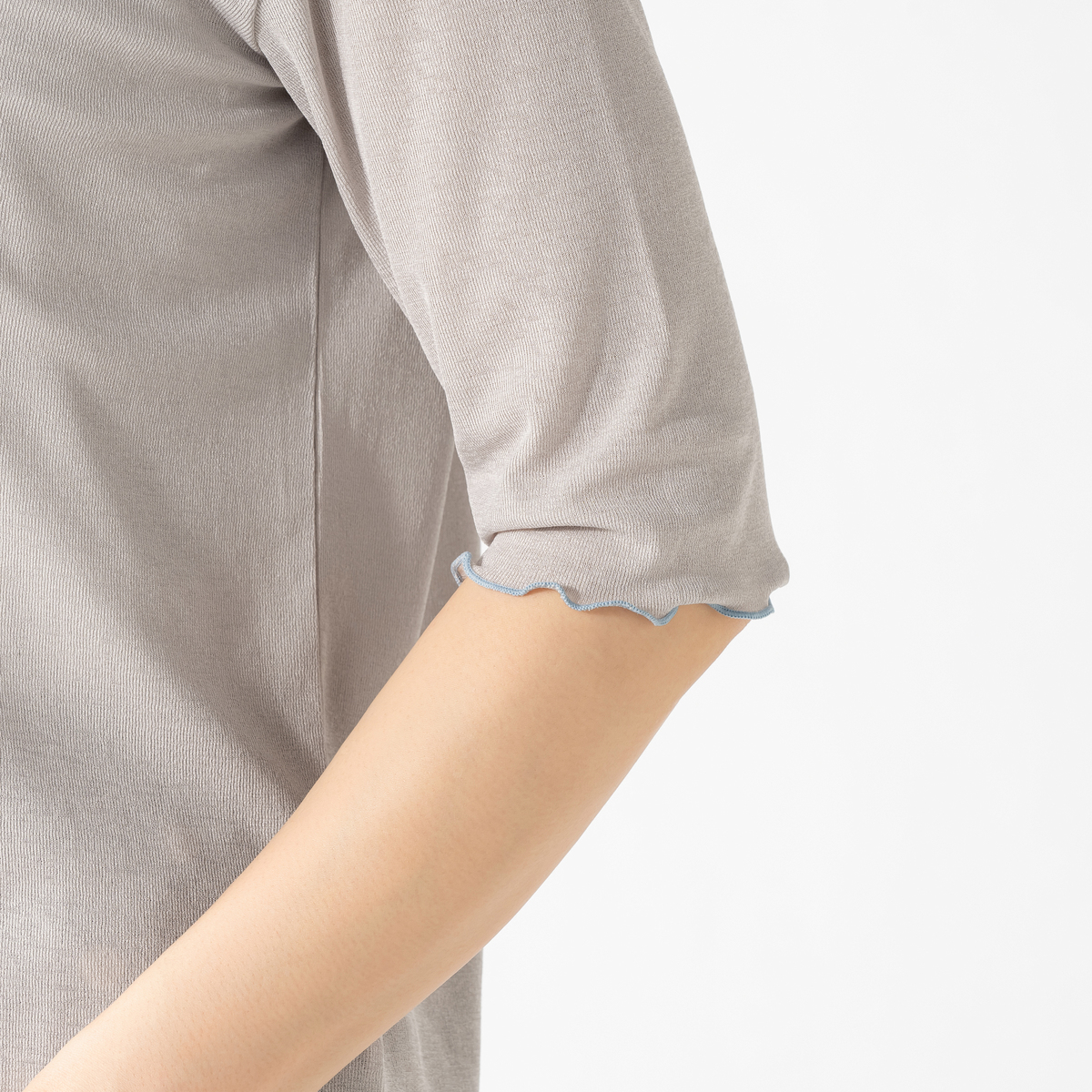 清涼感のあるシアースラブ素材が特徴のTシャツ。程よくゆとりを持たせた着心地と、コンパクトなシルエットにプチボトルネックを組合せました。配色メローをさりげないアクセントとして、キャミソールやジャンスカのインナーに使いやすい一枚です