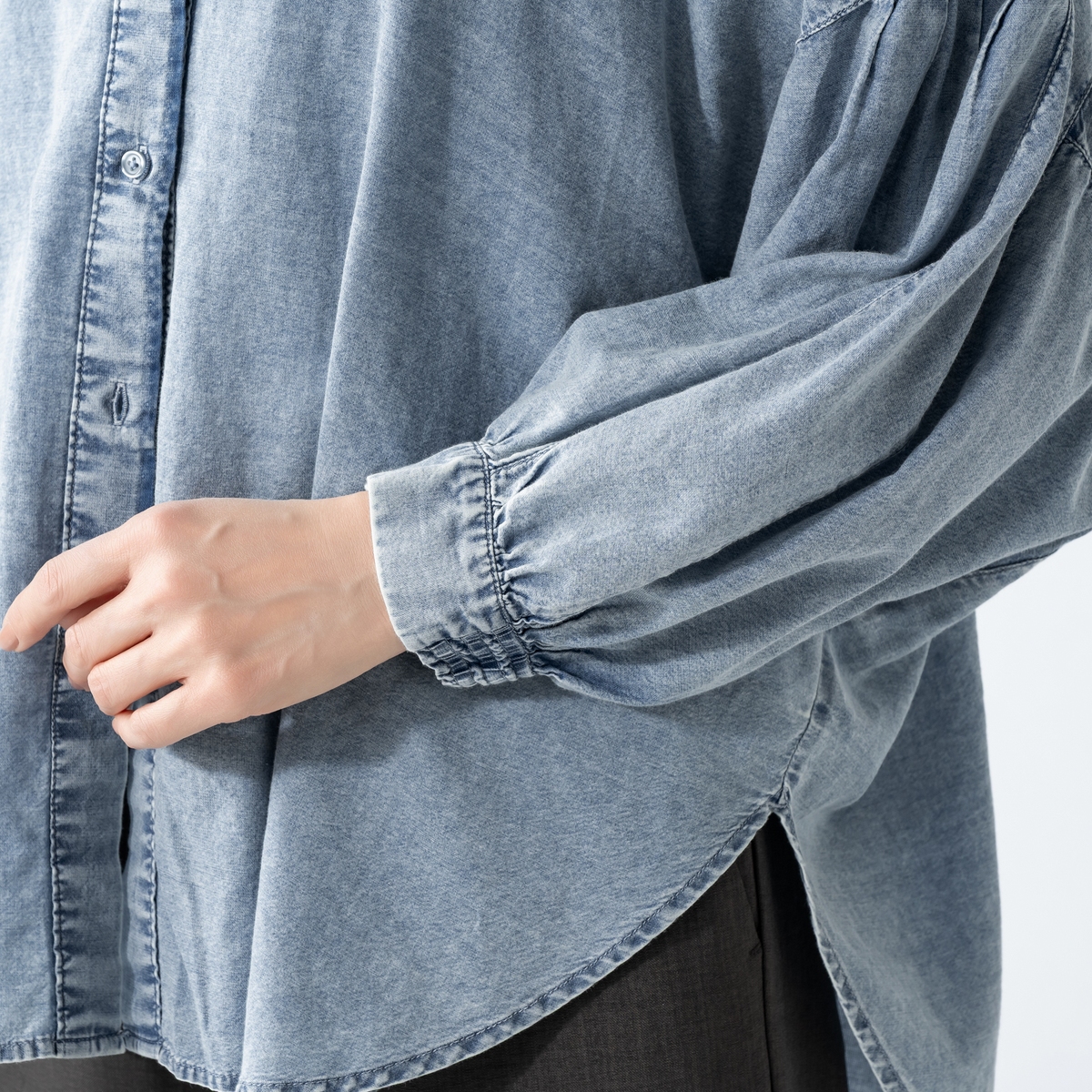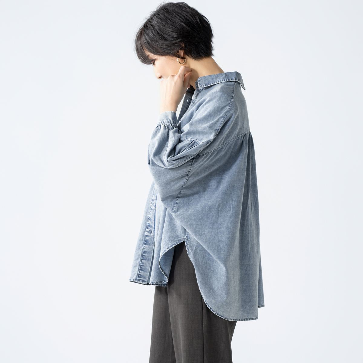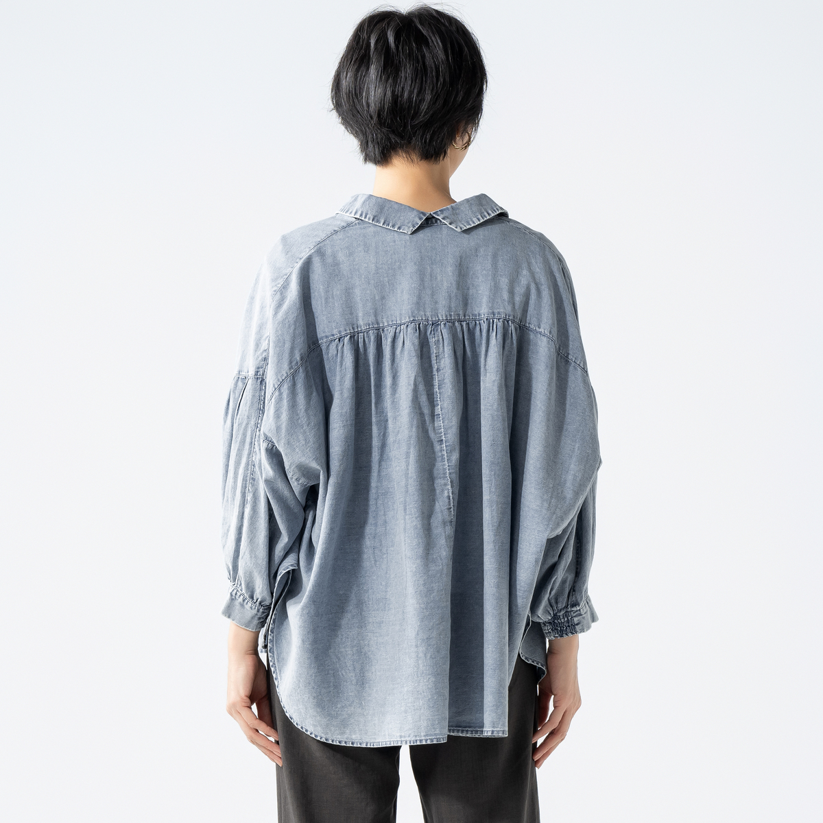 ケミカル加工を施したソフトデニム素材のシャツ。素材をたっぷり使ったドルマンシルエットで、全体にゆとりのあるサイズ感に仕上げました。羽織としても使いやすく、コーディネートの幅が広がります