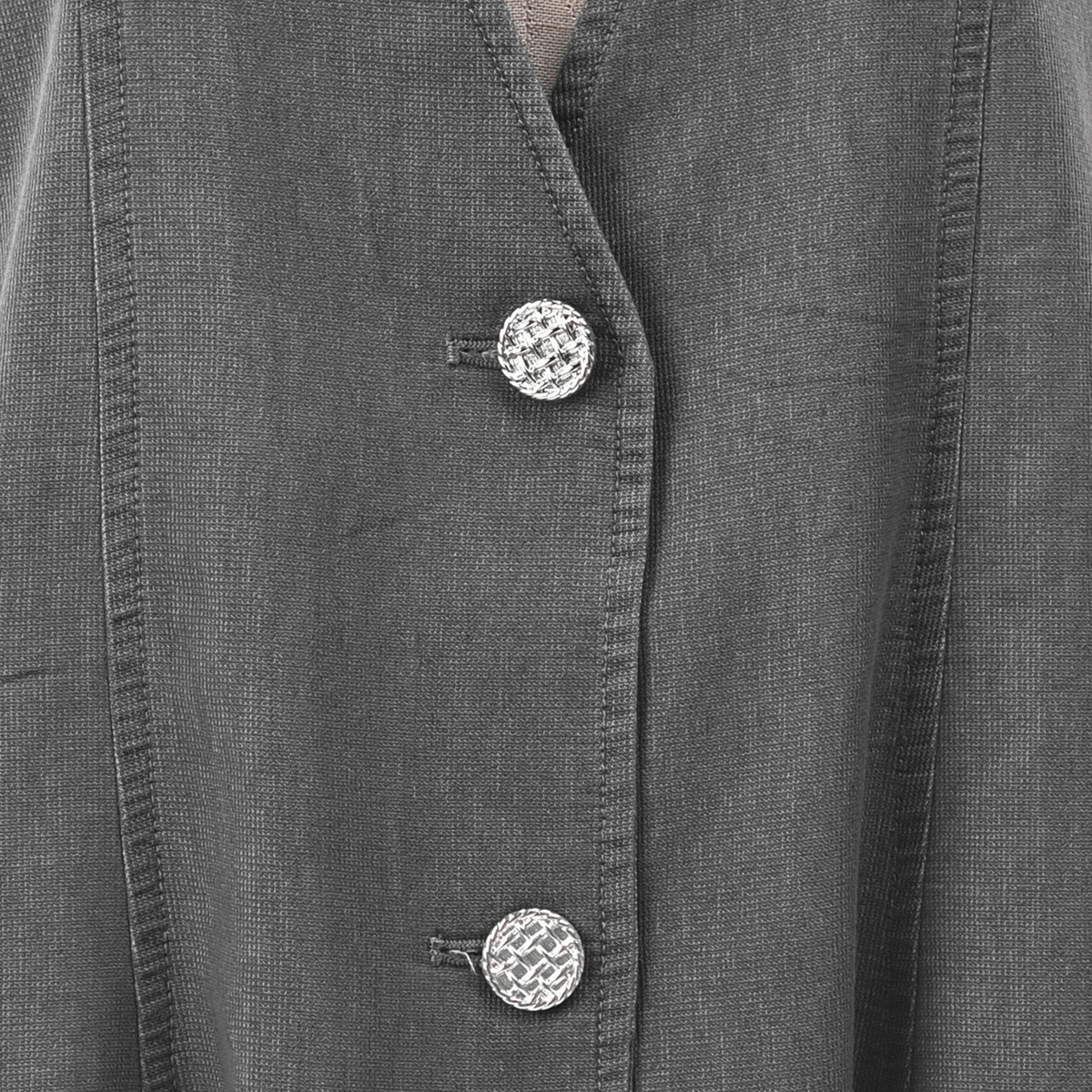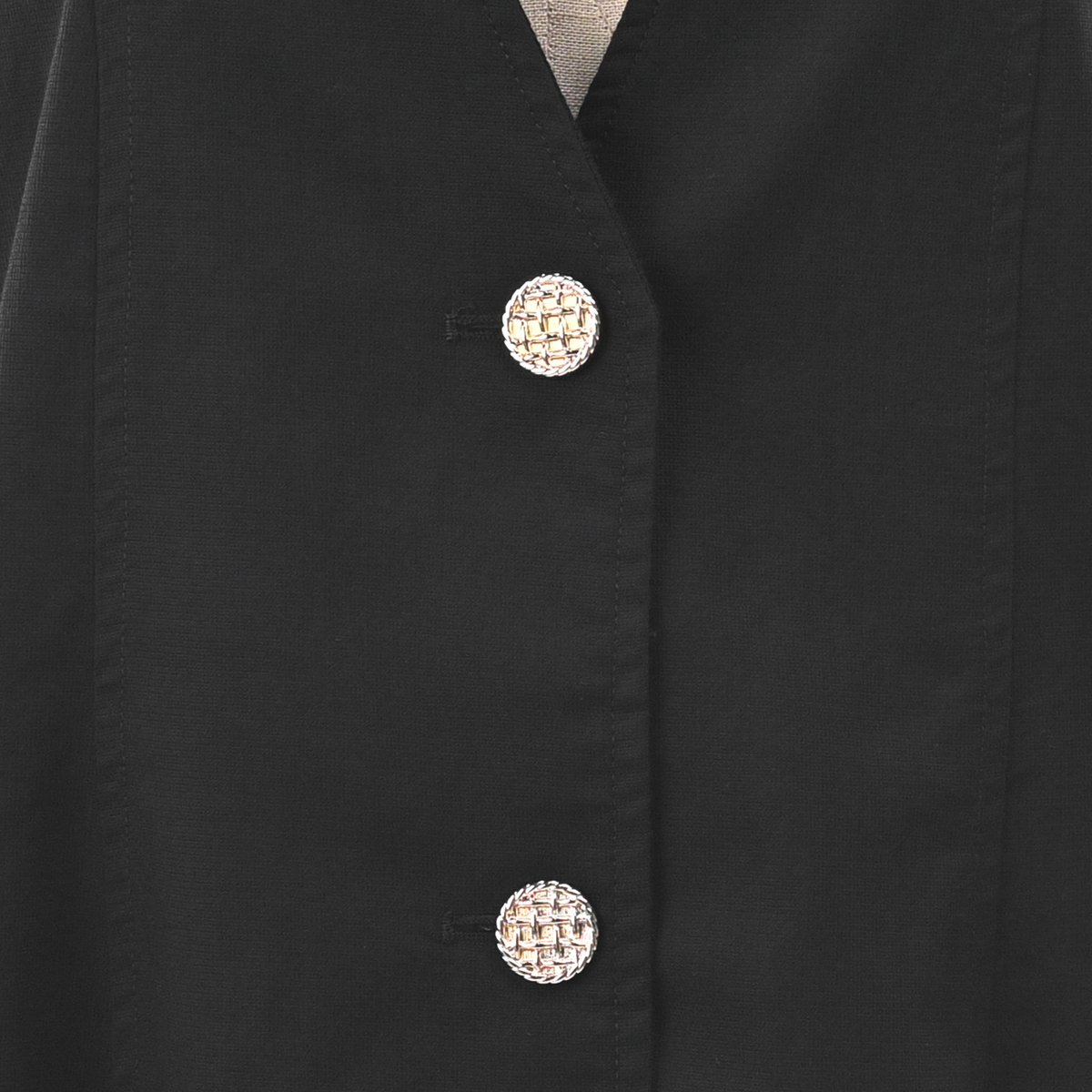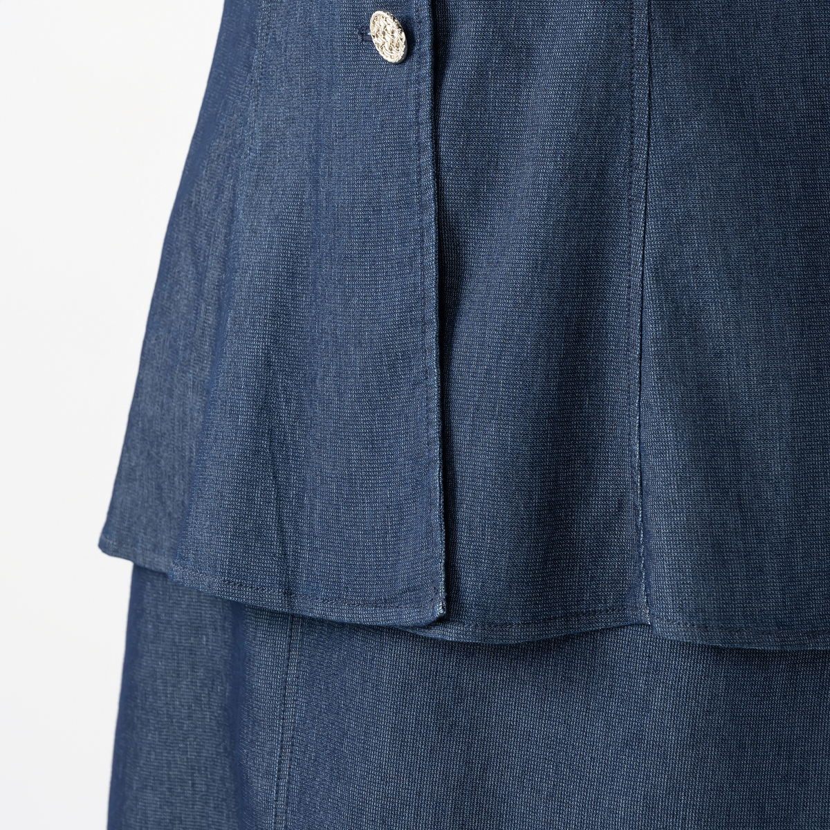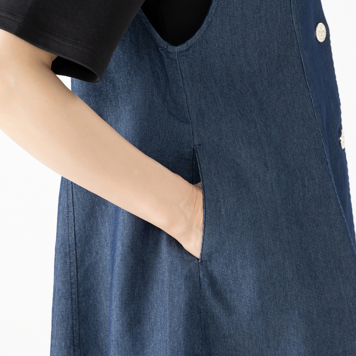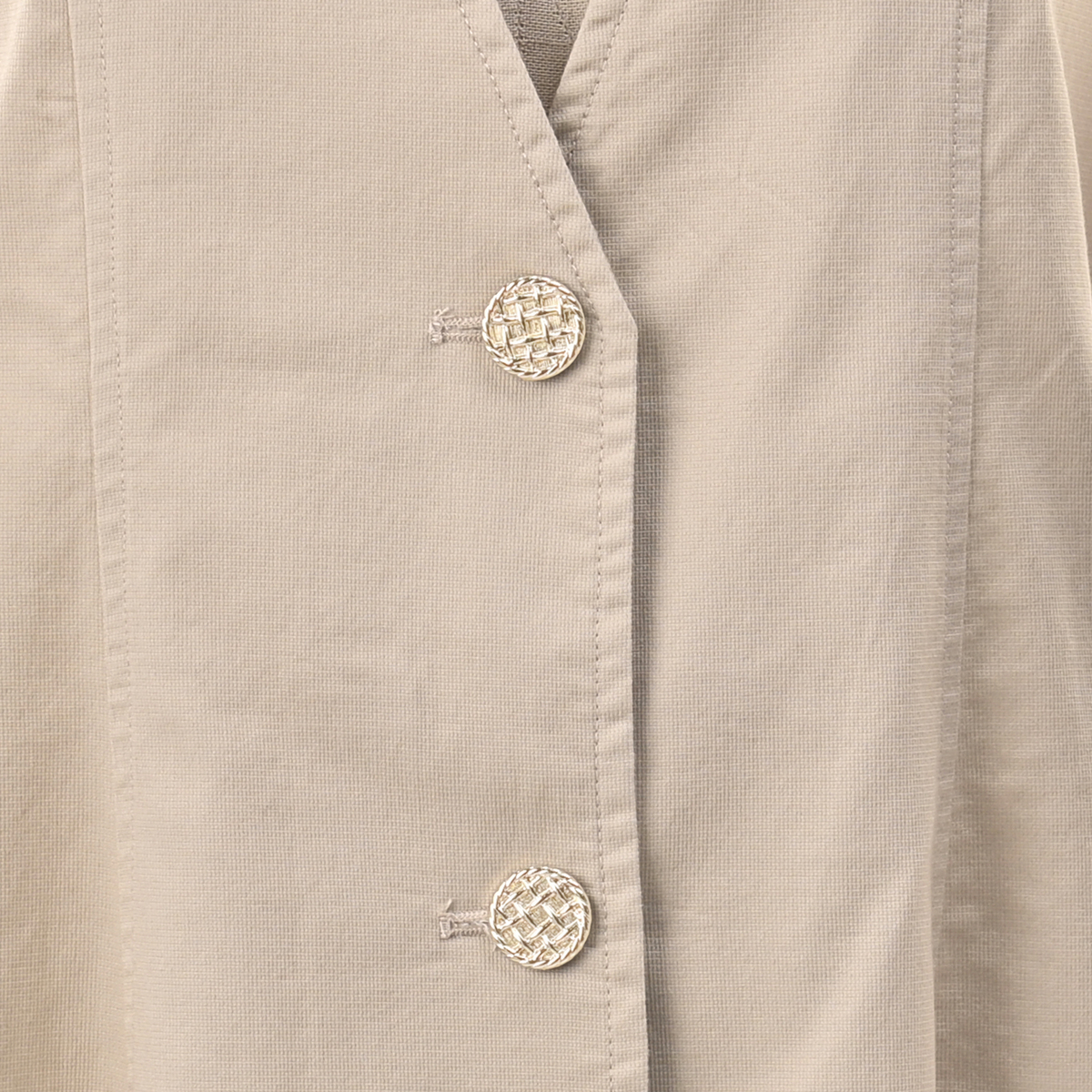 縫い目に沿って配置された両脇のシームポケットは、美しいシルエットを邪魔しないデザイン。縦のラインを引き立てるステッチや、フロントのゴールドカラーやシルバーカラーの足付きボタンがアクセントに。ボタンの裏側は、力ボタンで補強し丁寧に仕立てました