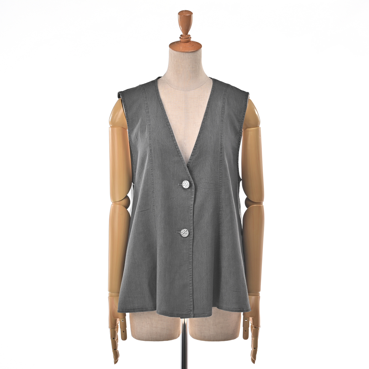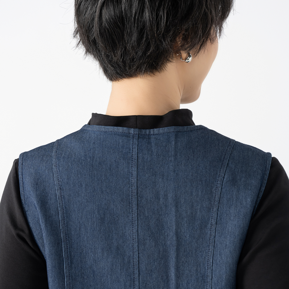ライトオンスの裏メッシュデニム素材を使用したジレ。通気性があり軽やかで、メッシュ独特の凹凸感がある綿混素材により、肌離れも良くサラサラの着心地です。肌に触れる面がメッシュ構造になっているため、ガーゼタッチの爽やかな肌触りです