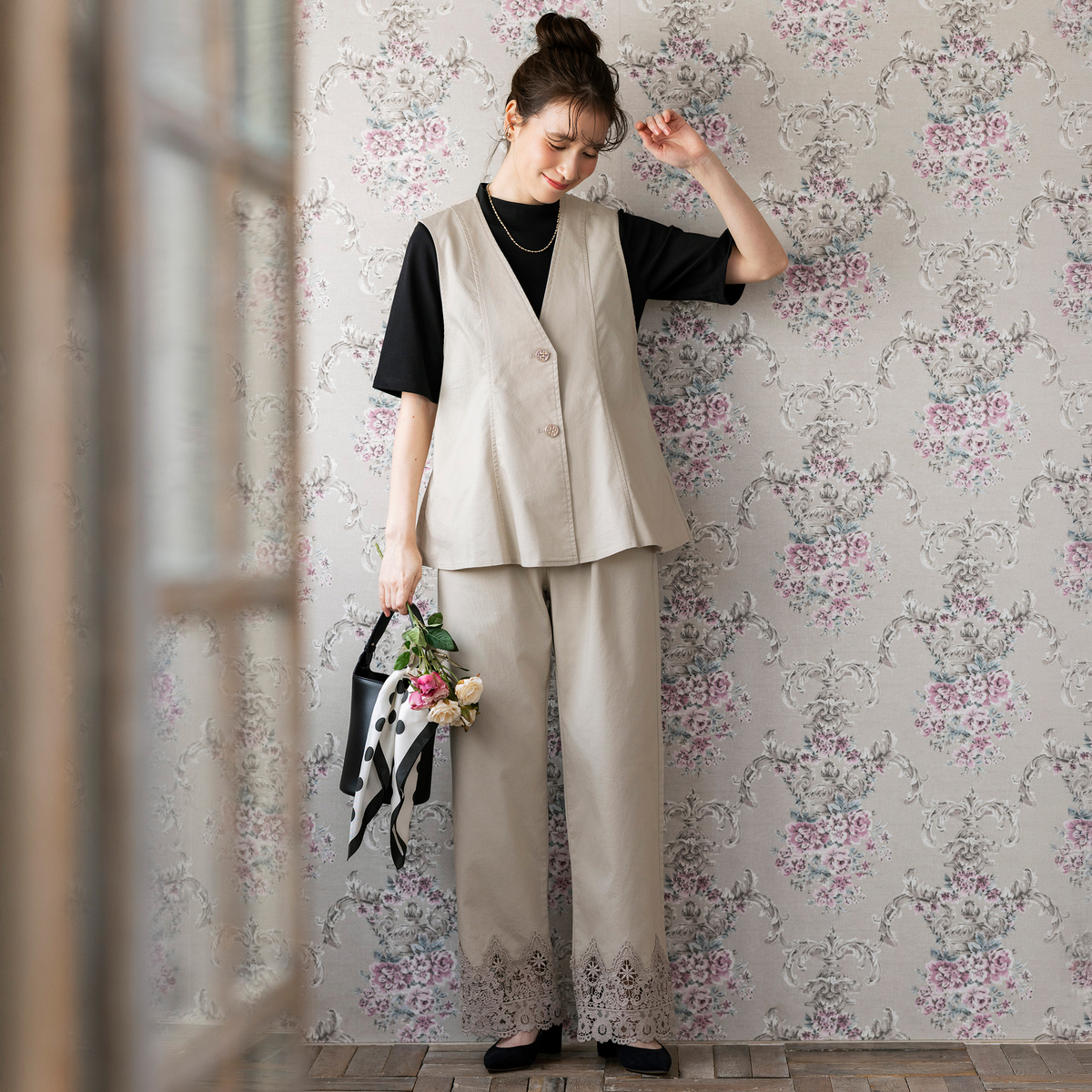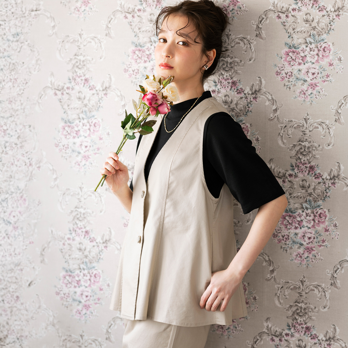 バランスを考えたプリンセスラインが身体のラインを拾いすぎず、すっきりとした立体的なシルエットに。裾に向かって優雅に広がるフレアデザインが、気になる腰周りをカバー。深めのVラインがお顔周りをすっきりと見せ、ブラウスやカットソーとの組合せもバランスよくまとまります