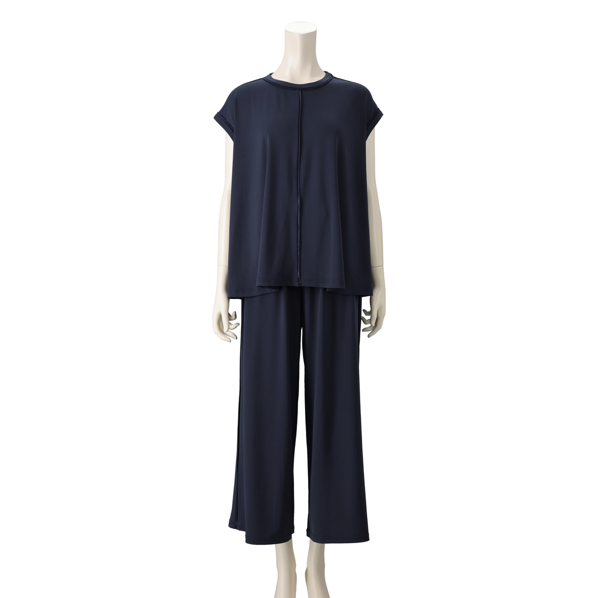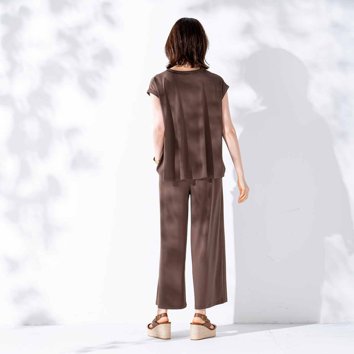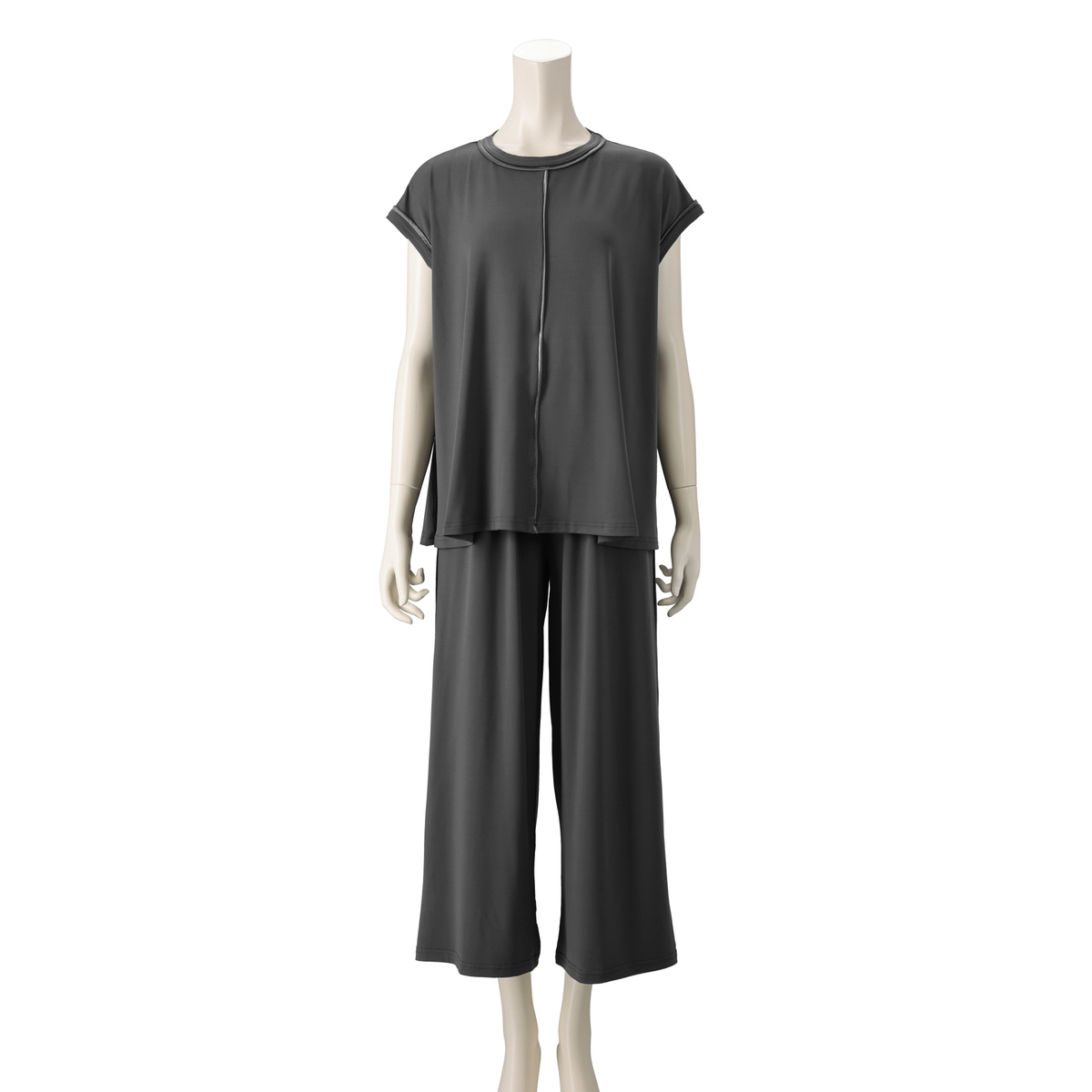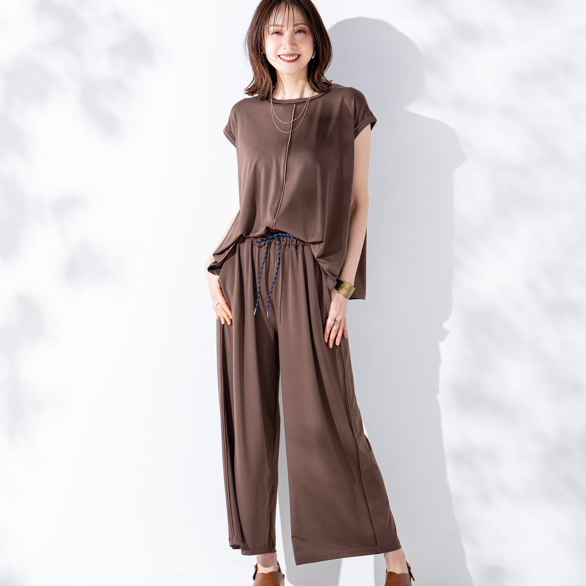 とろみ感のあるシルエットで仕上げたセットアップ。光沢のある素材を、プルオーバーは前身頃中心と襟、袖口に、パンツは脇線に施し、縦ラインをさりげなく強調。さらっとした風合いのポリエステルのベア天竺で洗濯機洗いができ、単品でもセットでも着回しで重宝します
