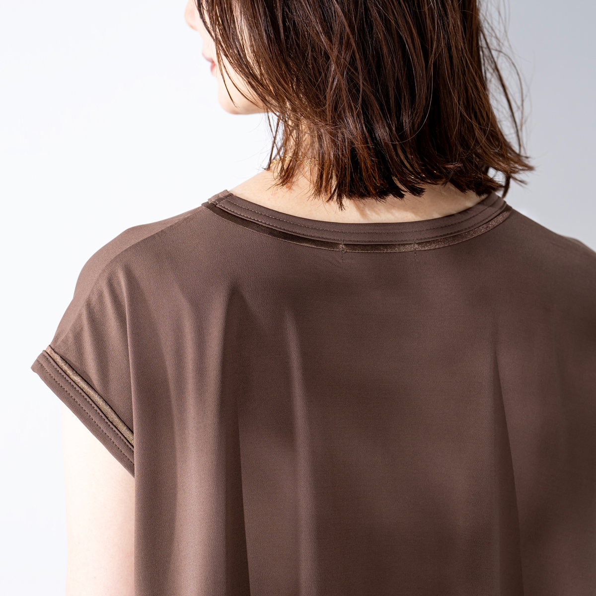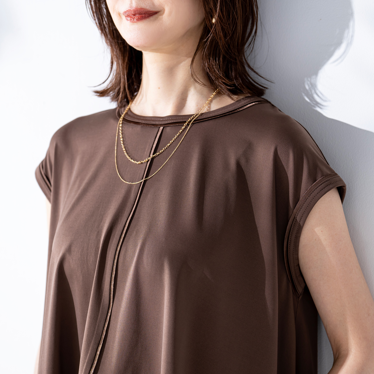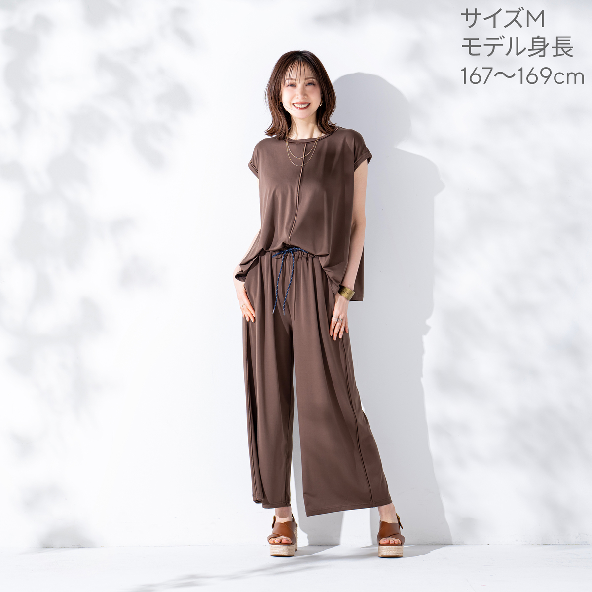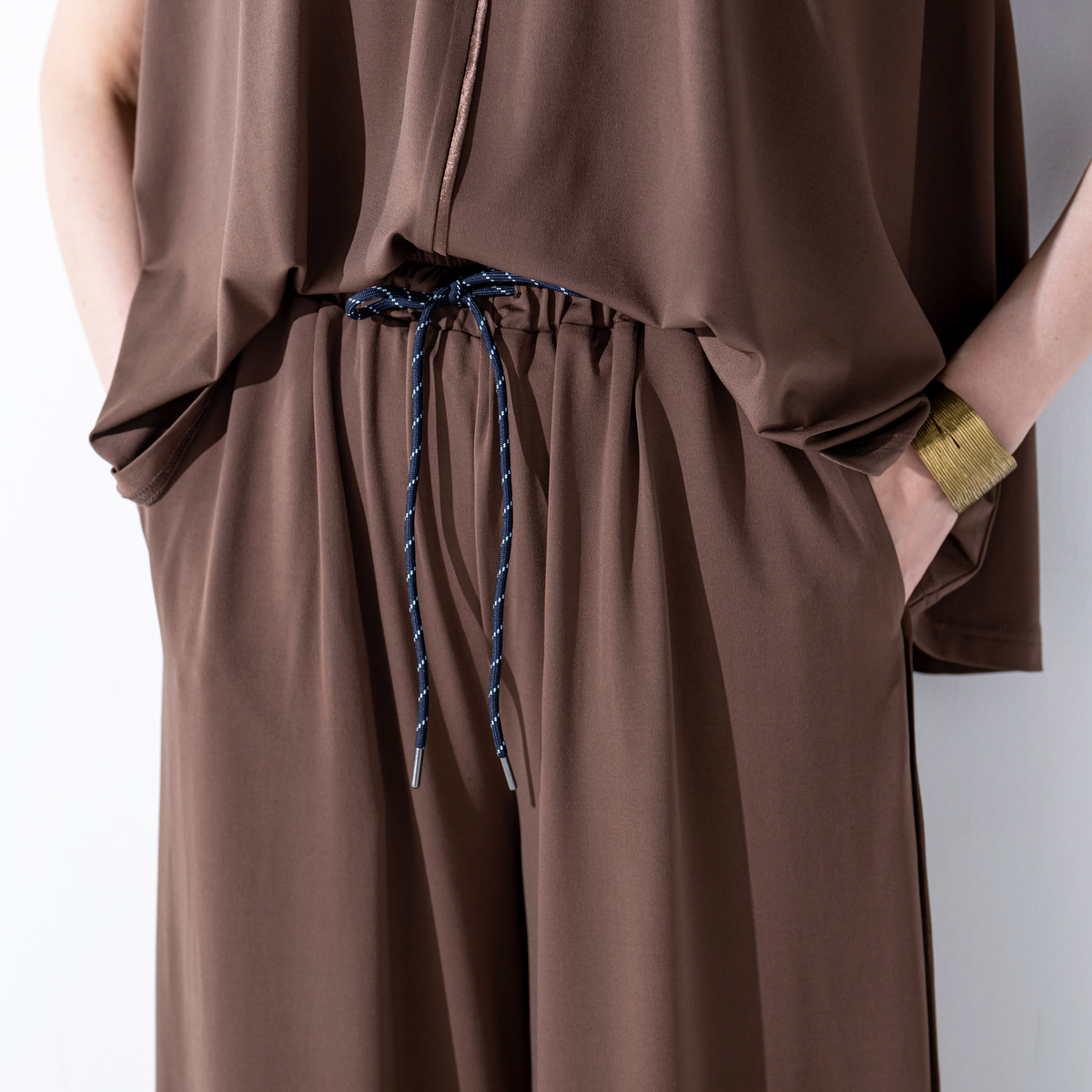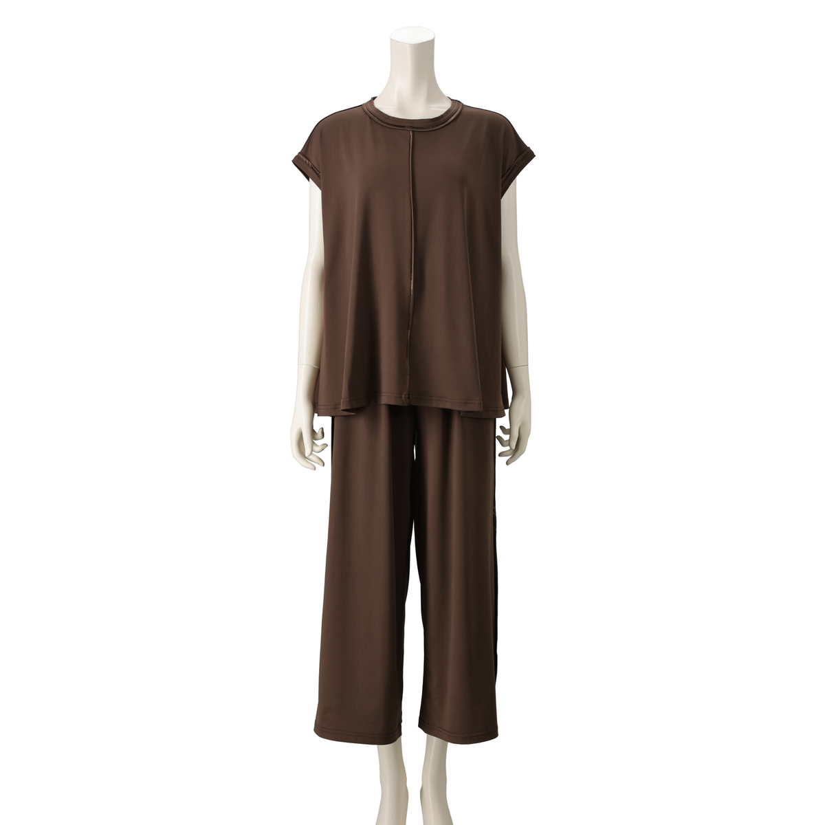 とろみ感のあるシルエットで仕上げたセットアップ。光沢のある素材を、プルオーバーは前身頃中心と襟、袖口に、パンツは脇線に施し、縦ラインをさりげなく強調。さらっとした風合いのポリエステルのベア天竺で洗濯機洗いができ、単品でもセットでも着回しで重宝します