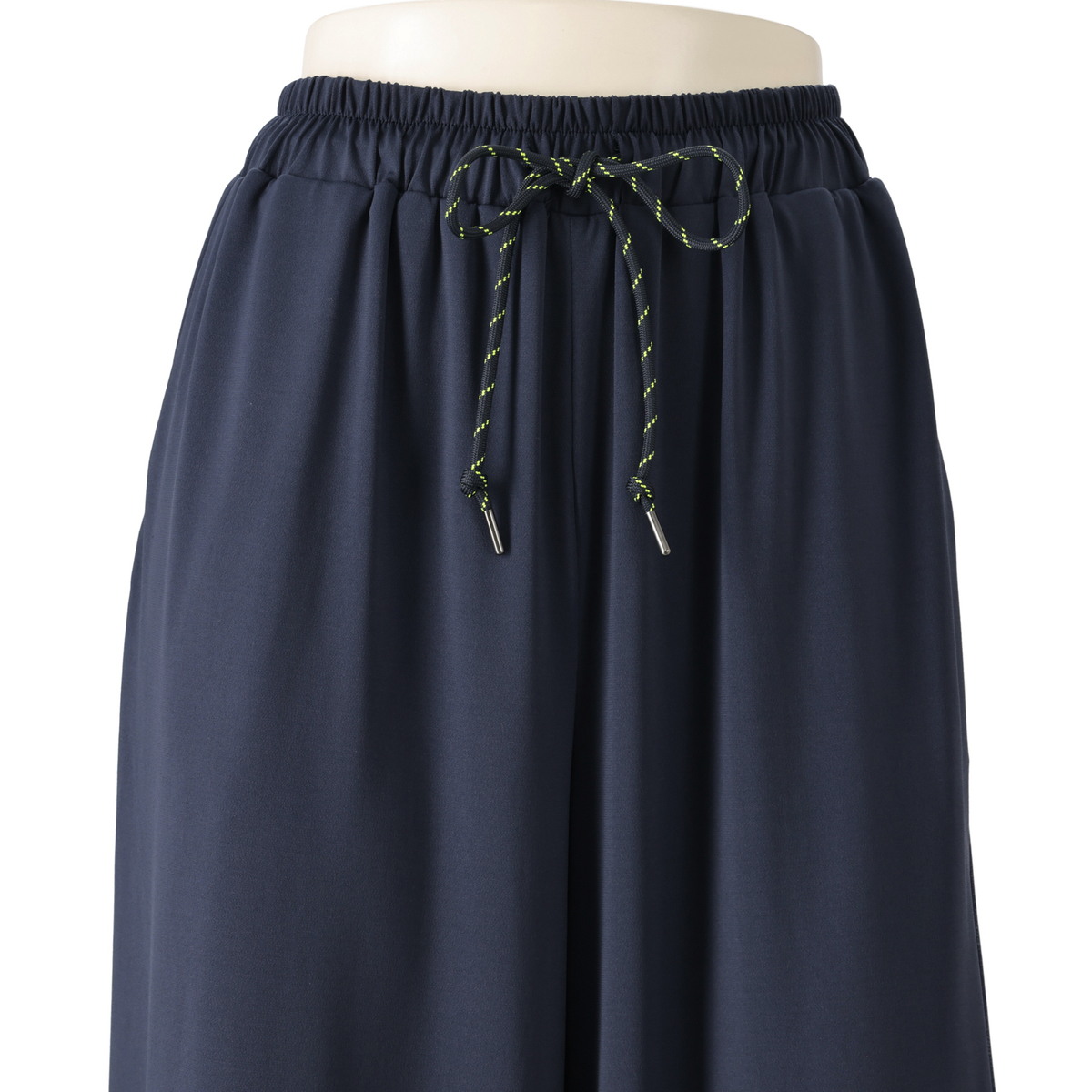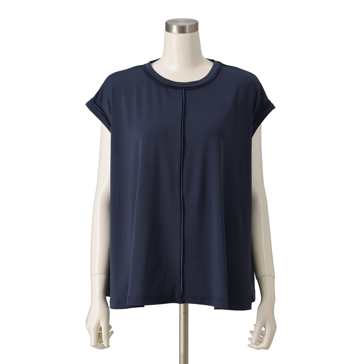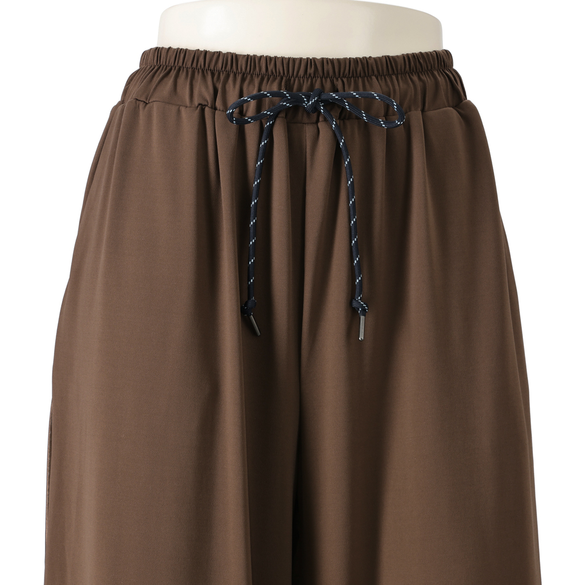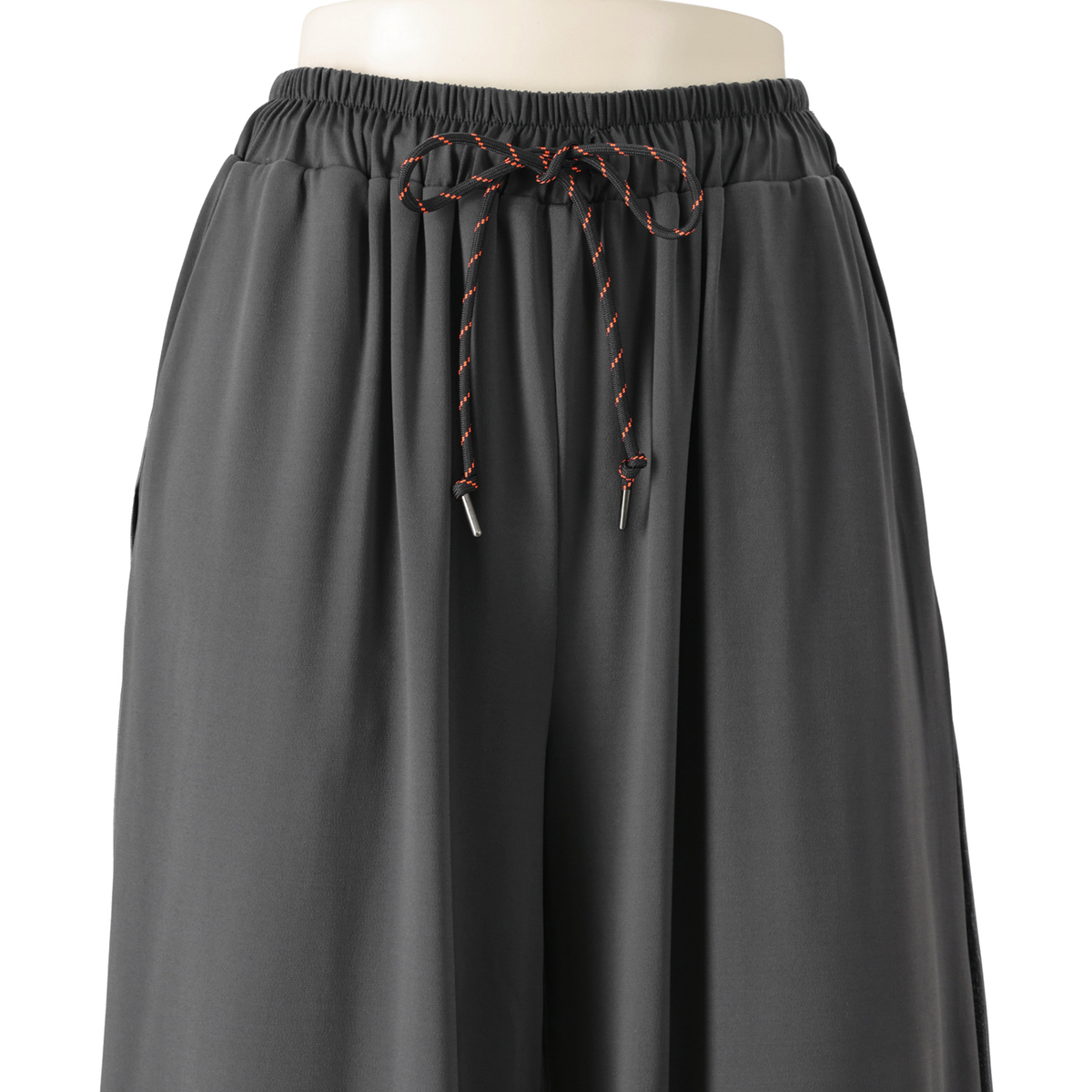 とろみ感のあるシルエットで仕上げたセットアップ。光沢のある素材を、プルオーバーは前身頃中心と襟、袖口に、パンツは脇線に施し、縦ラインをさりげなく強調。さらっとした風合いのポリエステルのベア天竺で洗濯機洗いができ、単品でもセットでも着回しで重宝します