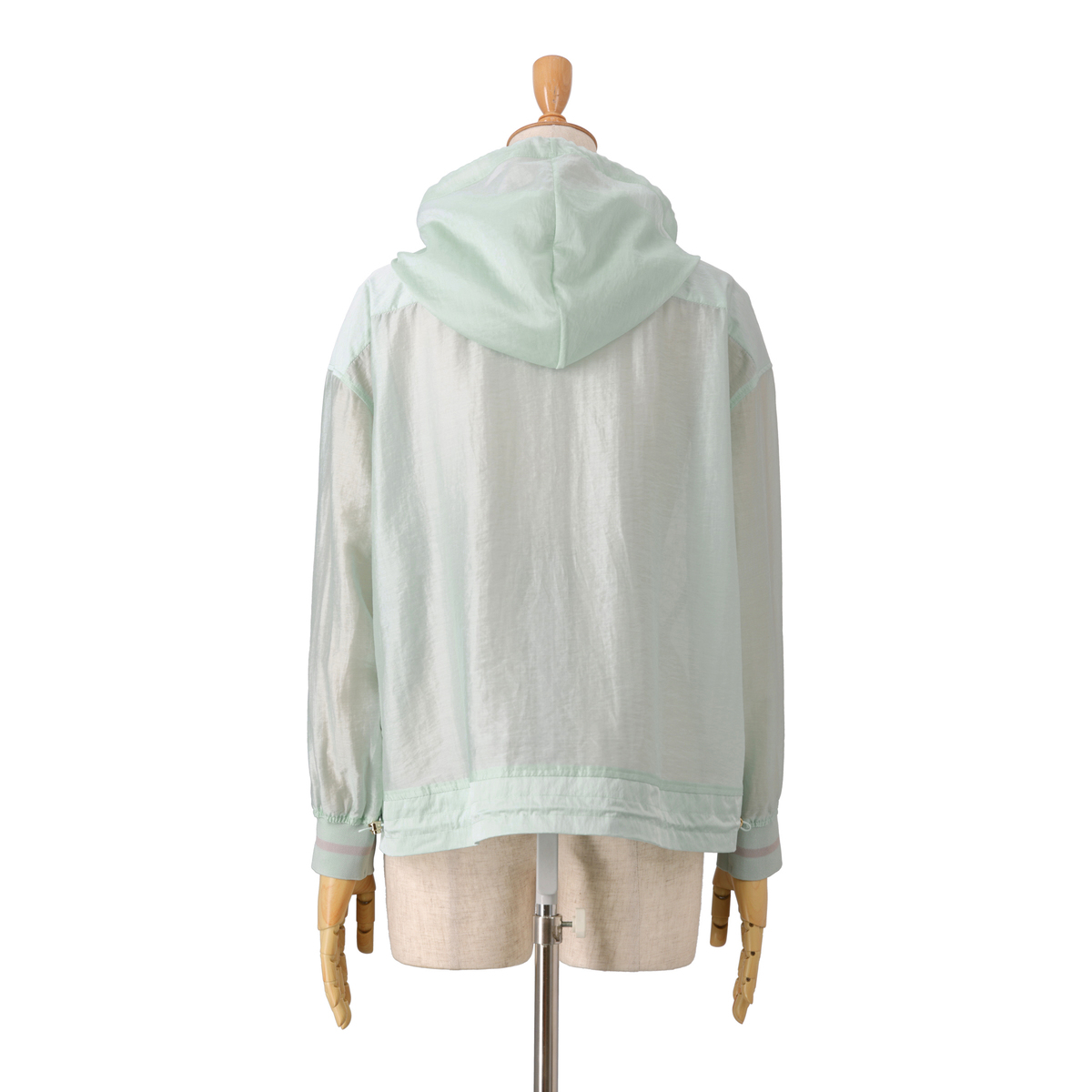 本体生地はシアー感、光沢感のあるセルロースと、ハリ・コシのあるナイロンを交織させた布帛素材を使用。袖口と裾中心にはオリジナルの横編みリブを配し、カラーやラインのピッチにもこだわりました