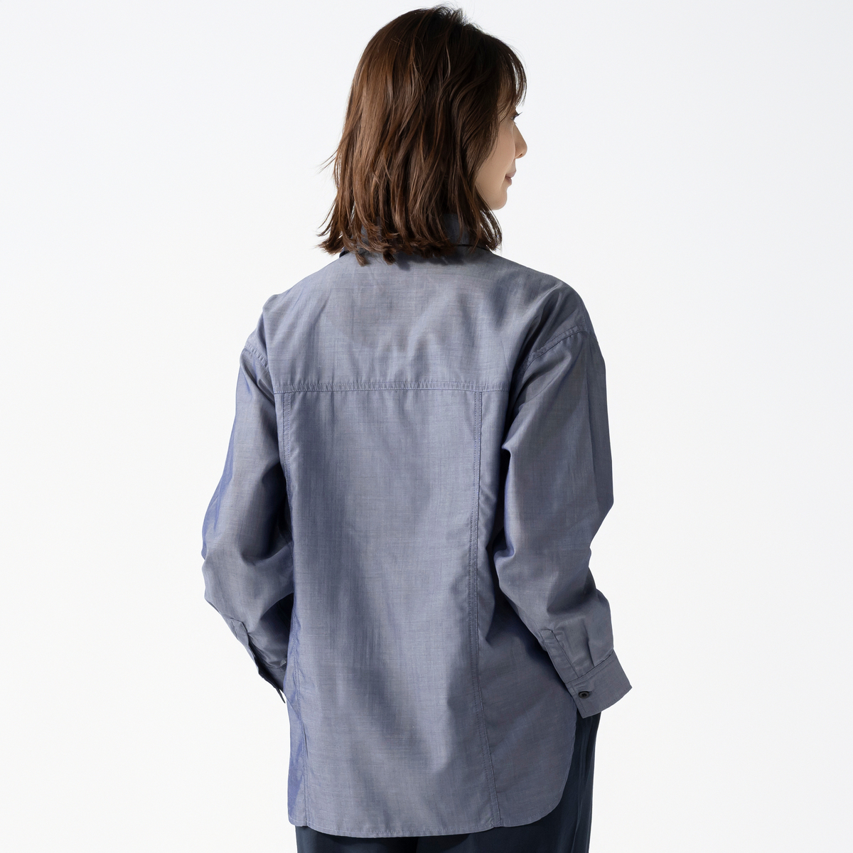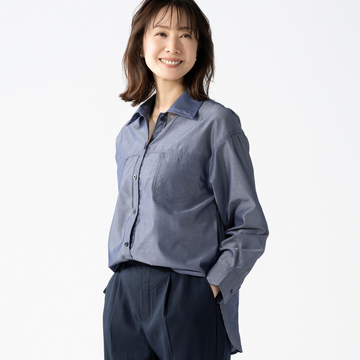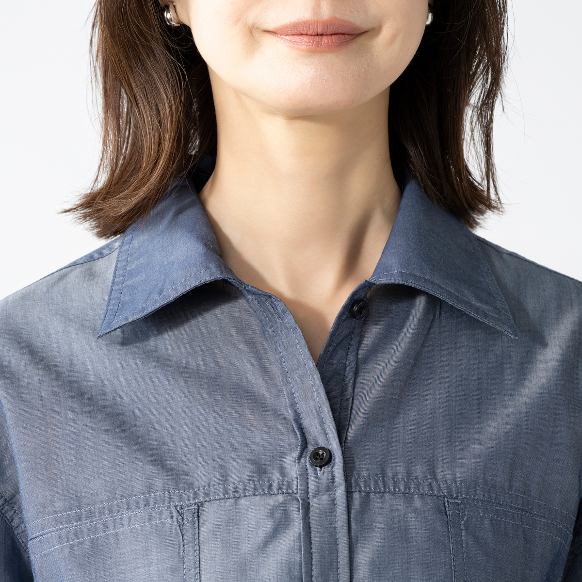 シャンブレーの先染め平織素材を使用。柔らかく程よいハリ感があり、さらりとした肌触りで快適な着心地です。ネット使用で洗濯機洗いができ、自宅で手軽にお手入れできます