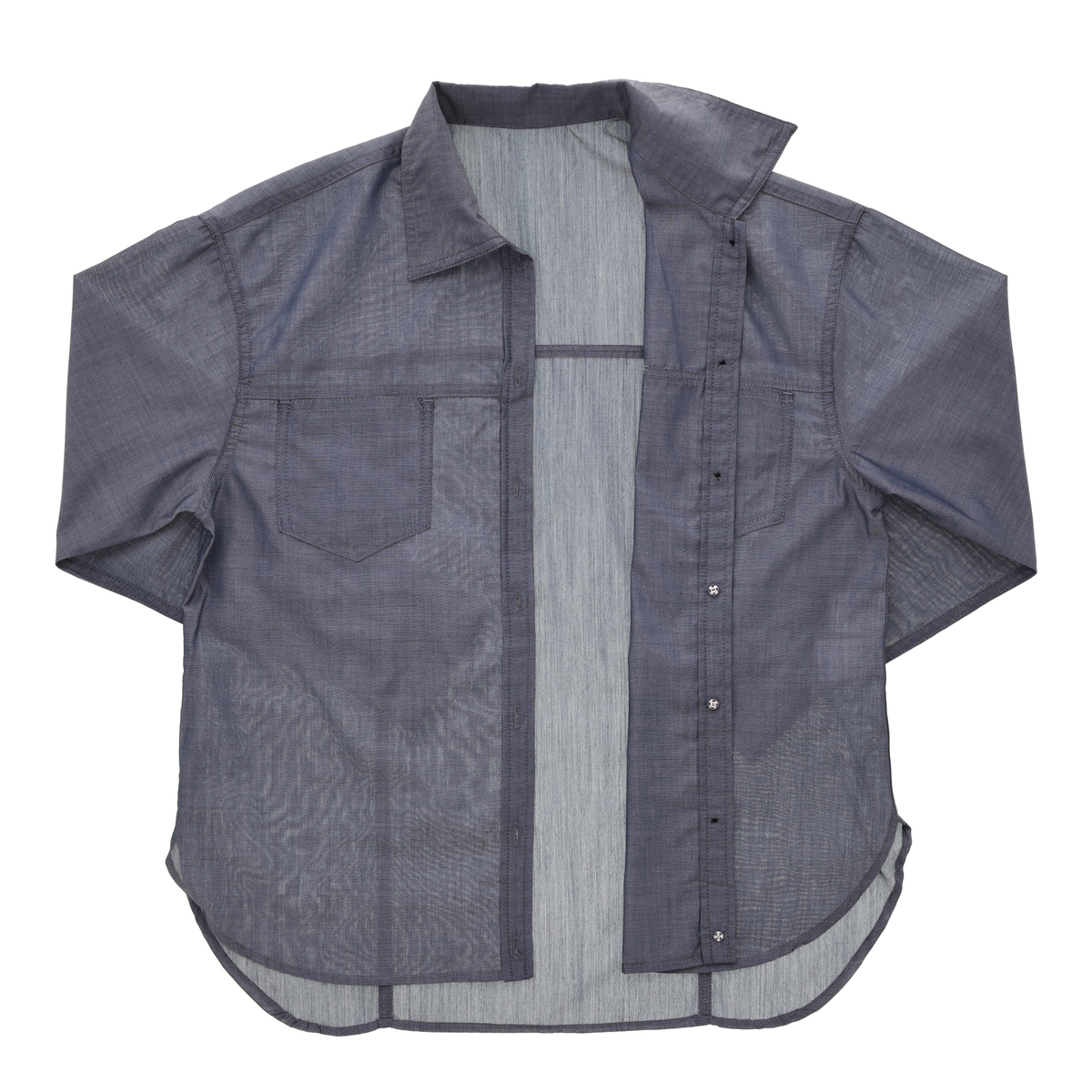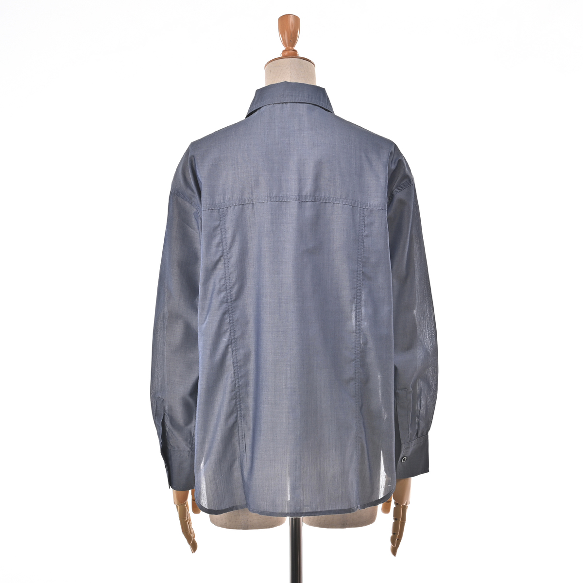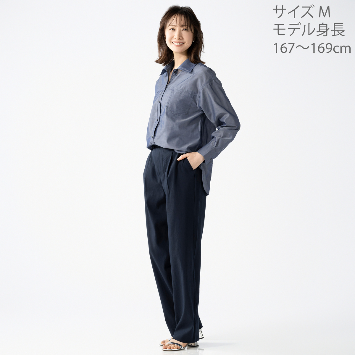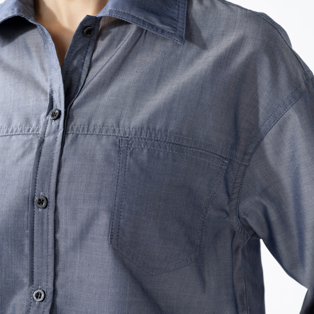 シャンブレーの先染め平織素材を使用。柔らかく程よいハリ感があり、さらりとした肌触りで快適な着心地です。ネット使用で洗濯機洗いができ、自宅で手軽にお手入れできます