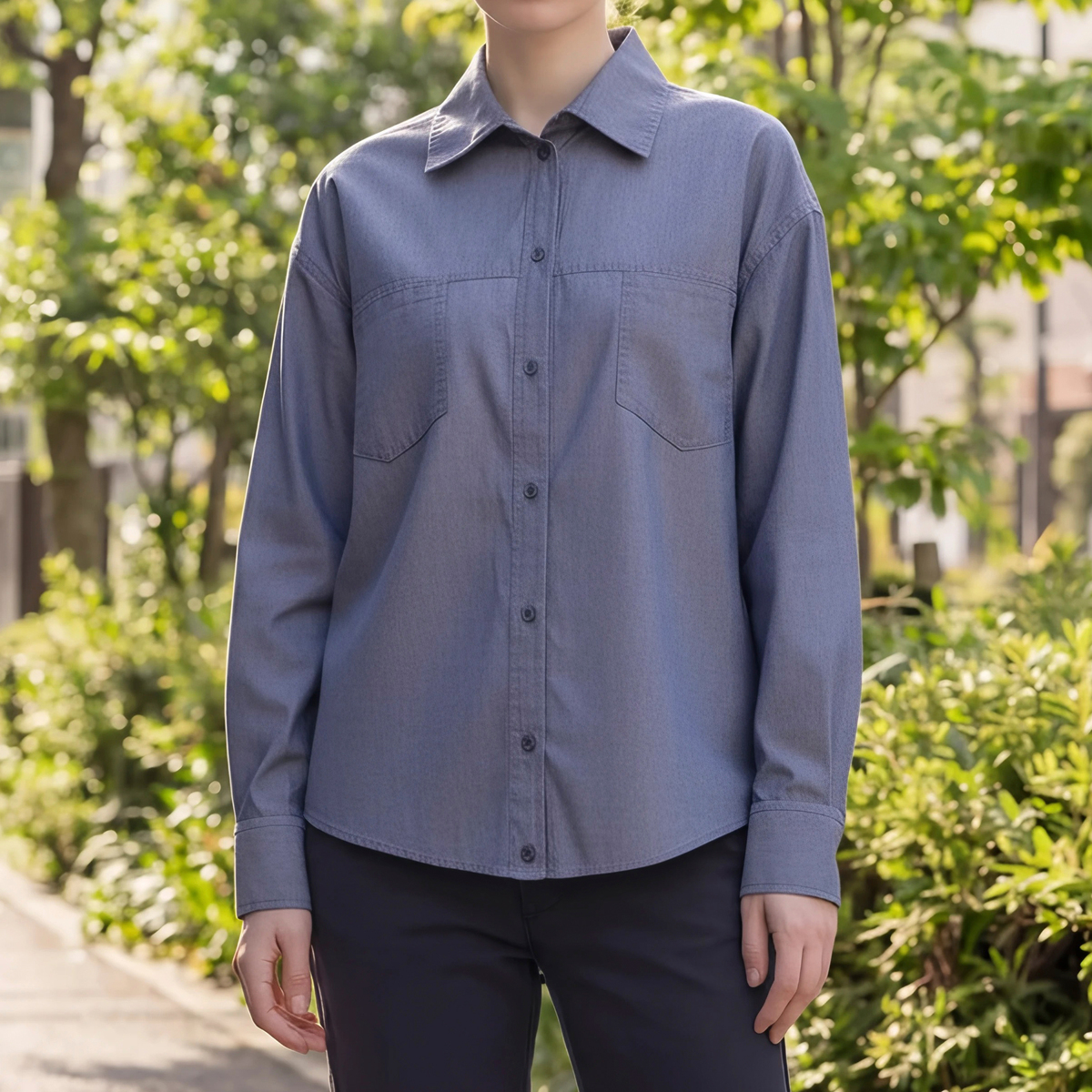シャンブレーの先染め平織素材を使用。柔らかく程よいハリ感があり、さらりとした肌触りで快適な着心地です。ネット使用で洗濯機洗いができ、自宅で手軽にお手入れできます