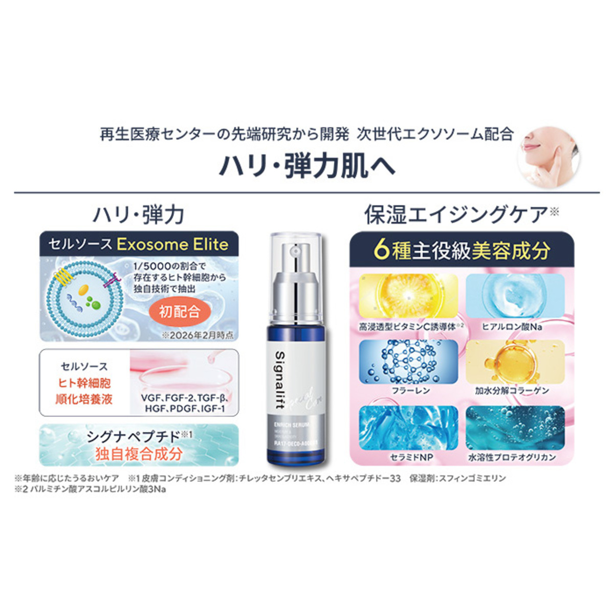 ヒト幹細胞順化培養液*2、メーカー独自の複合成分Signa-Peptide(R)*3やペプチド*4、肌の保湿、ハリ・弾力のエイジングケア(年齢に応じたスキンケア)のために必要と考えた美容成分を複数配合*5。さらに高浸透型ビタミンC誘導体とよばれる“パルミチン酸アスコルビルリン酸3Na”を配合しました