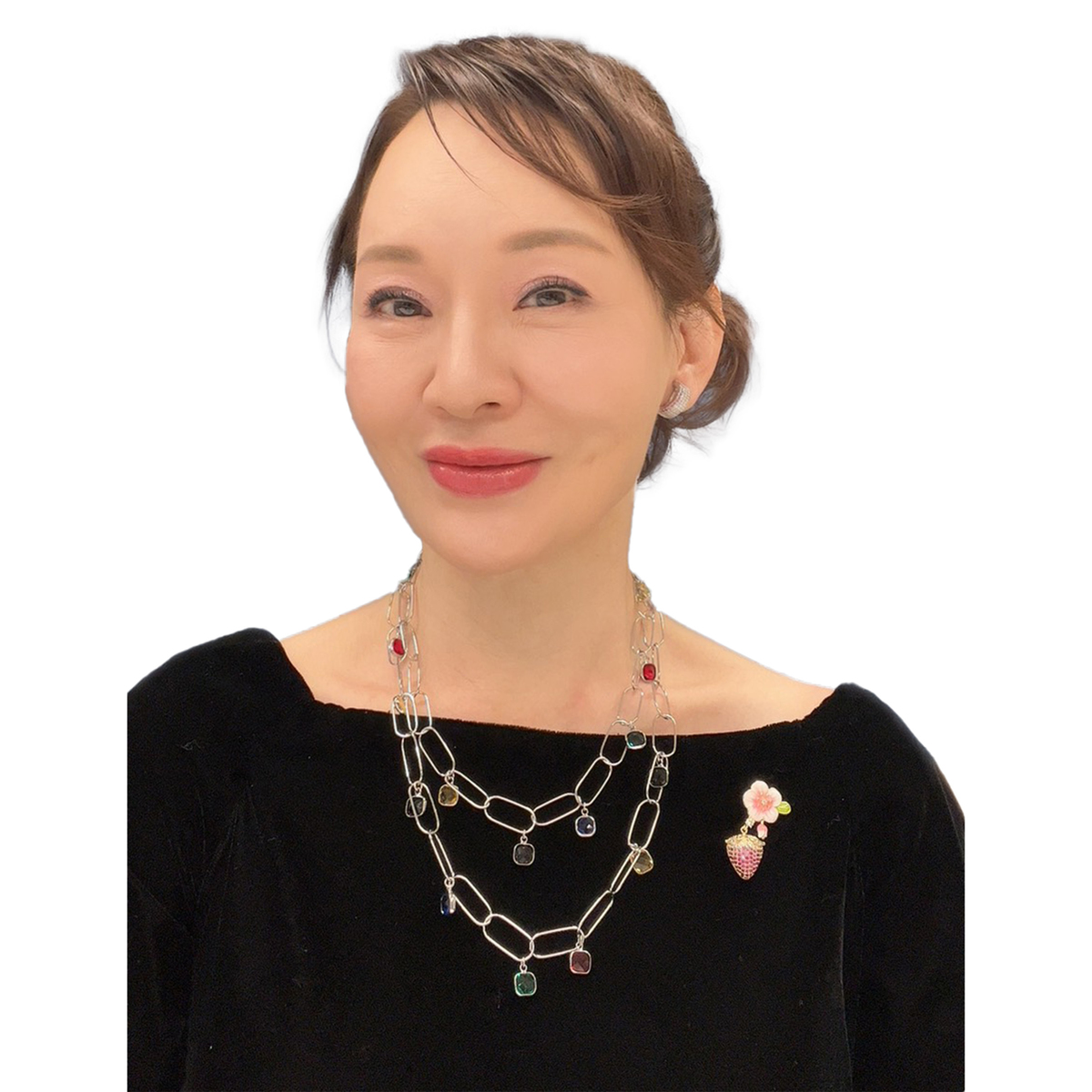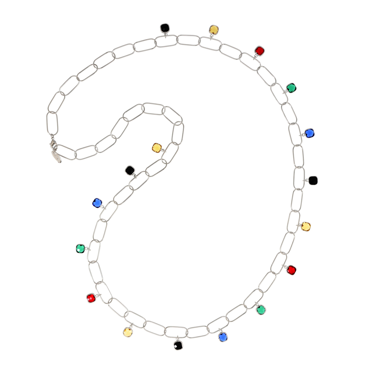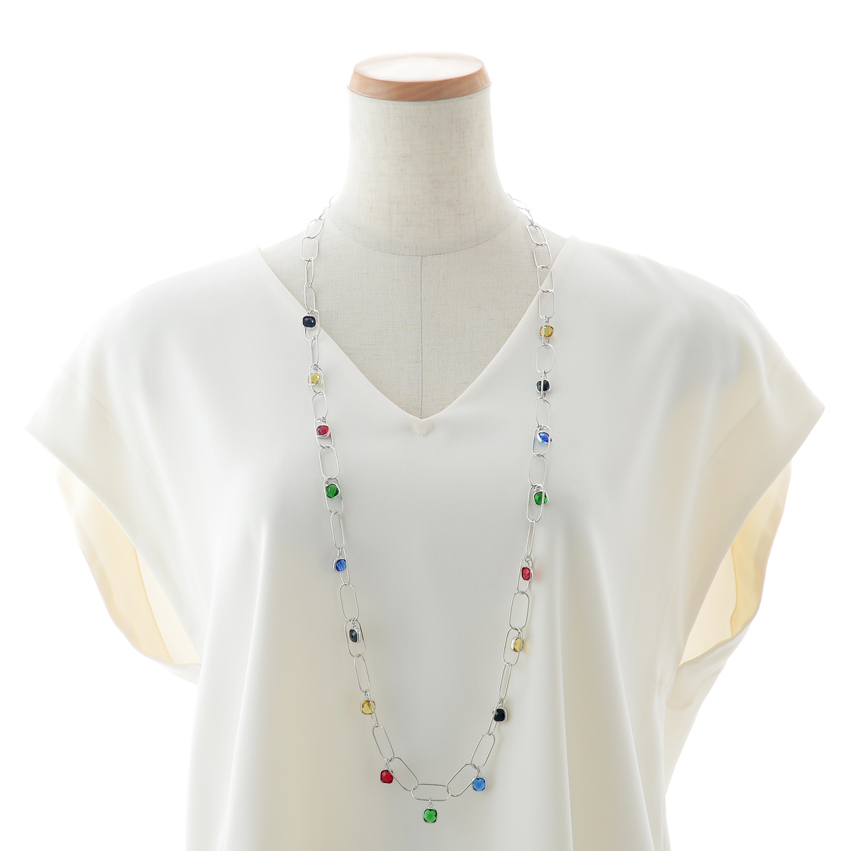 多面カットが施されたガラスパーツが、光を受けて繊細に煌めくロングネックレス。ブラック、イエロー、レッド、グリーン、ブルーなど多彩なカラーが、まるで絵の具のパレットのように連なり、コーディネートに遊び心を添えます