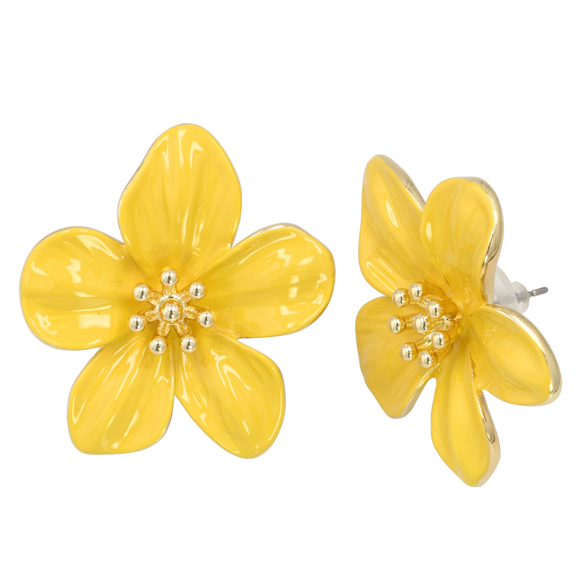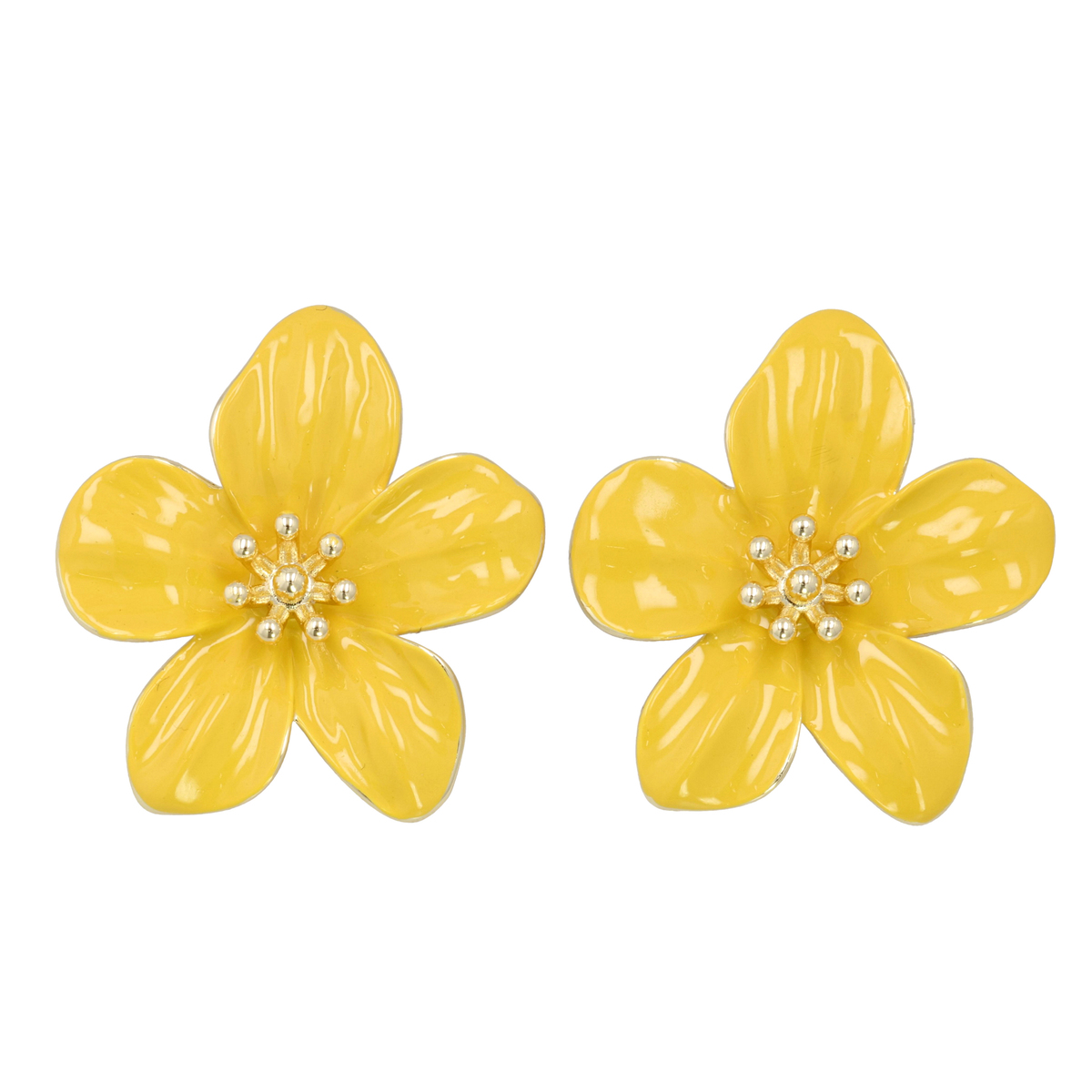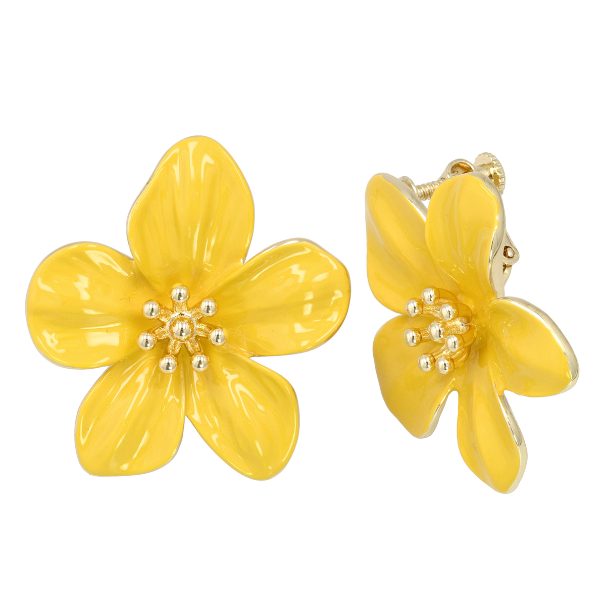 サンライトイエローの艶やかな花びらが耳元を明るく彩る、フラワーモチーフのイヤリングまたはピアスです。五枚の花びらとなめらかな光沢、中心の玉状装飾が立体感と華やかさを添えます
