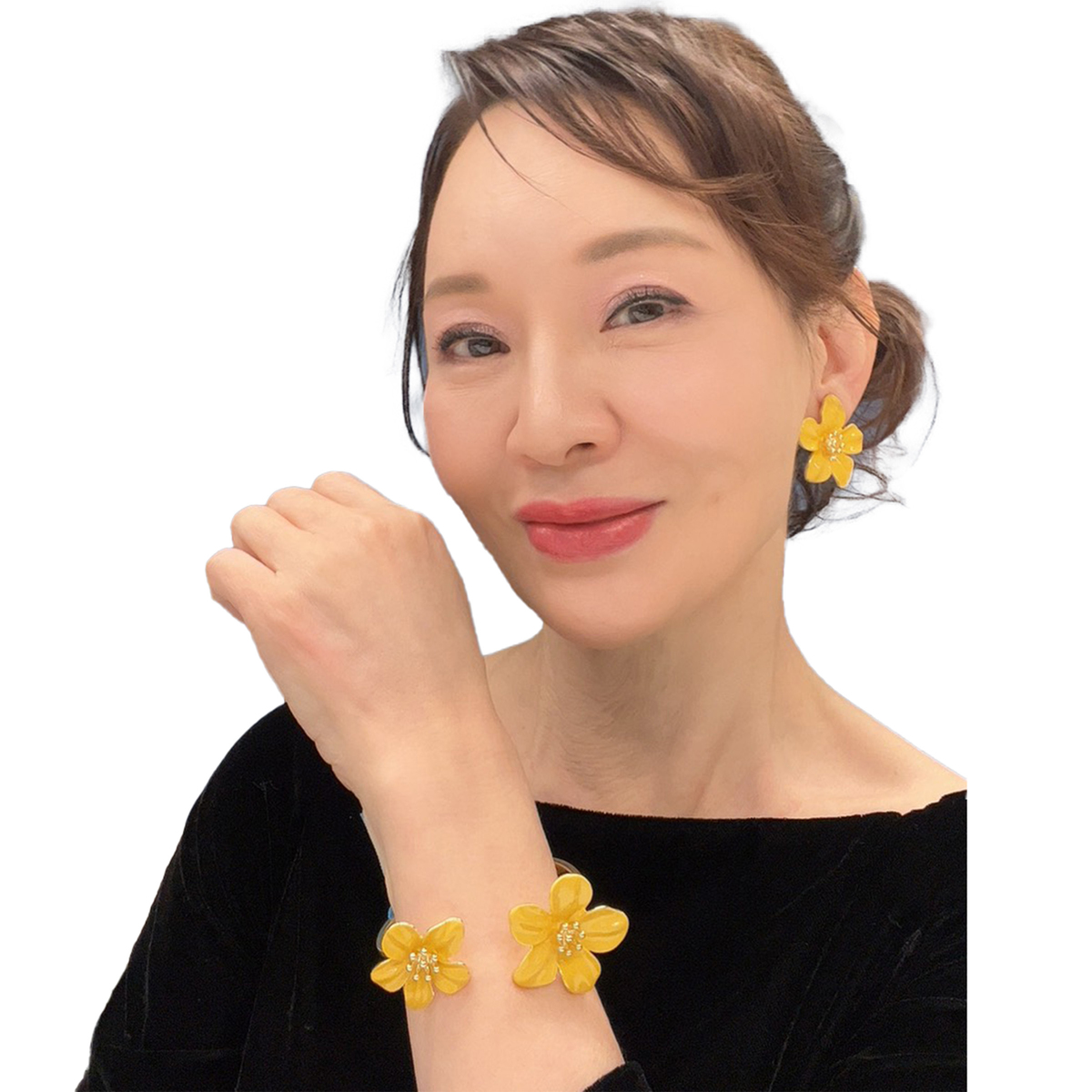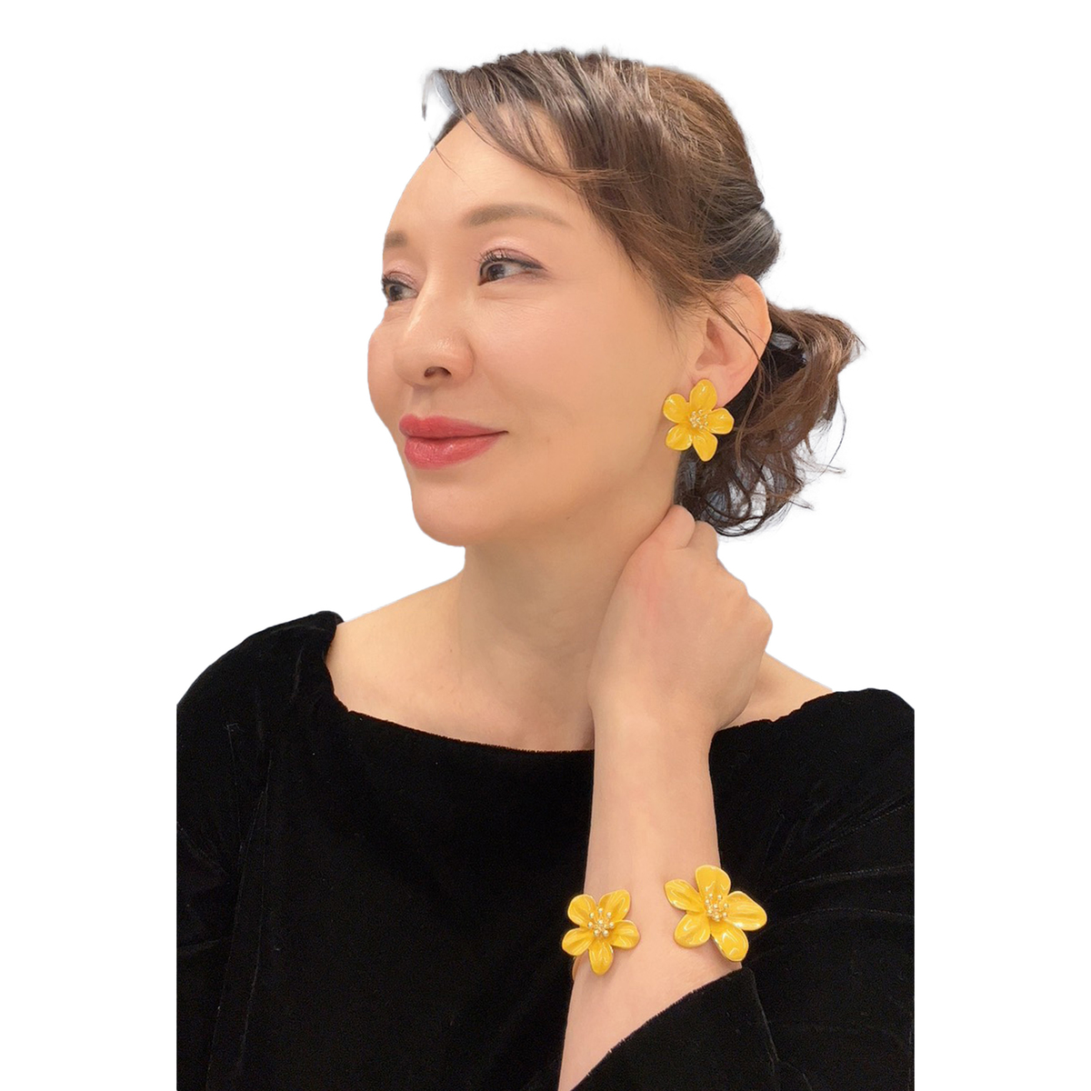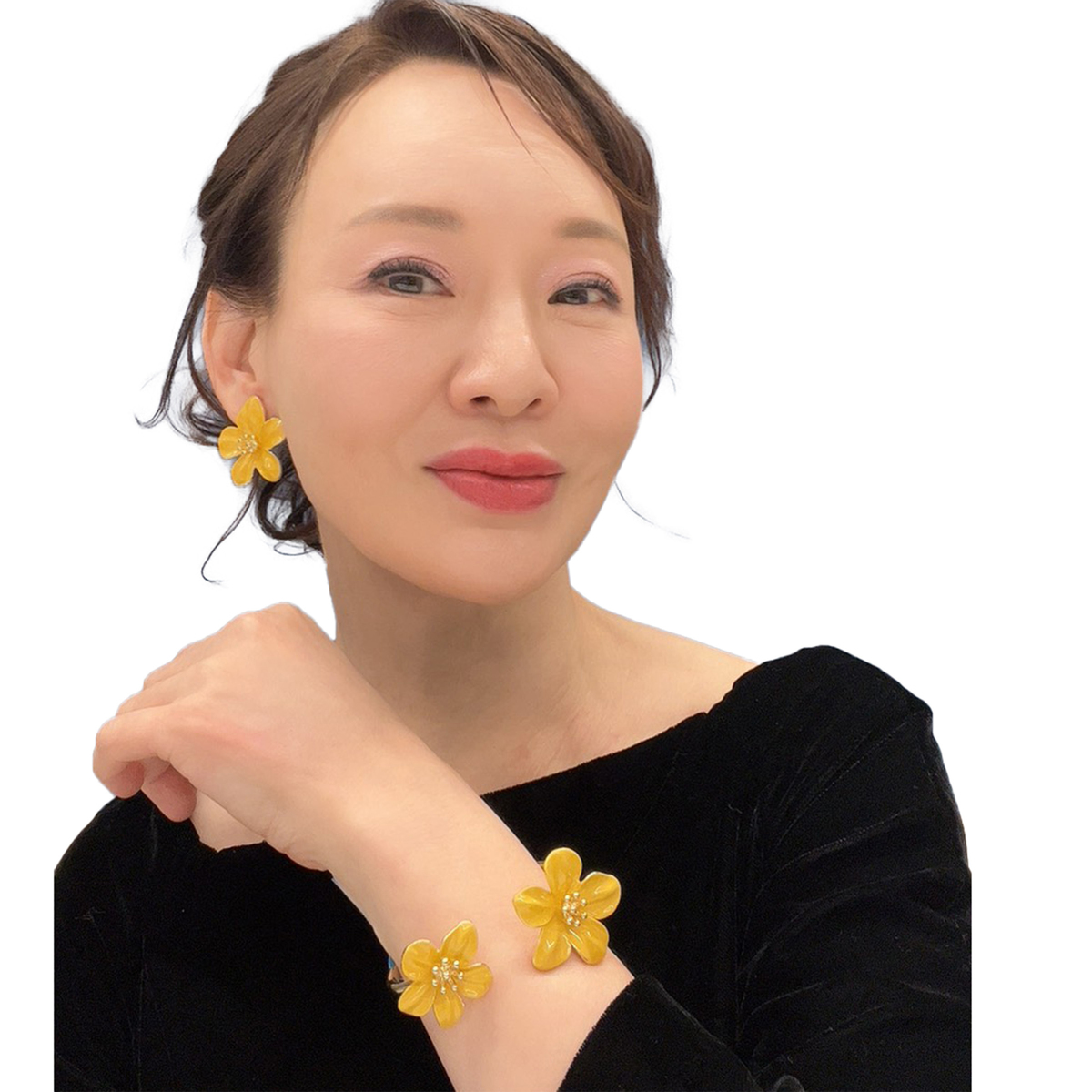 サンライトイエローの艶やかな花びらが耳元を明るく彩る、フラワーモチーフのイヤリングまたはピアスです。五枚の花びらとなめらかな光沢、中心の玉状装飾が立体感と華やかさを添えます