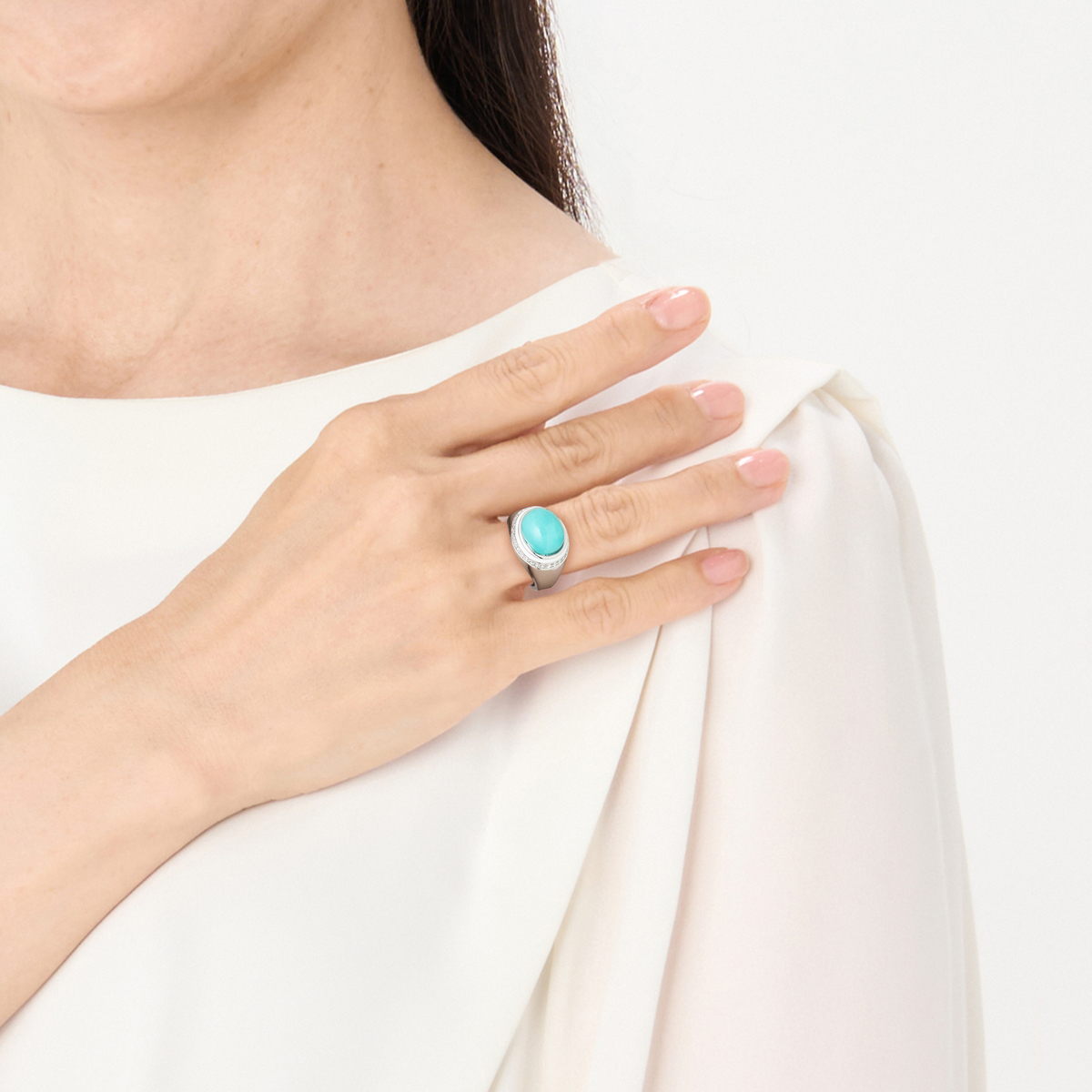 自然の景色を思わせる天然石が印象をつくるリング。周囲に配したキュービックジルコニアが手元の動きに合わせて繊細に光り、樹脂カラーコートの柔らかな色調が全体をやさしく包みます。異素材が寄り添うことで生まれる静かなコントラストが、日常の仕草にそっと表情を添えます