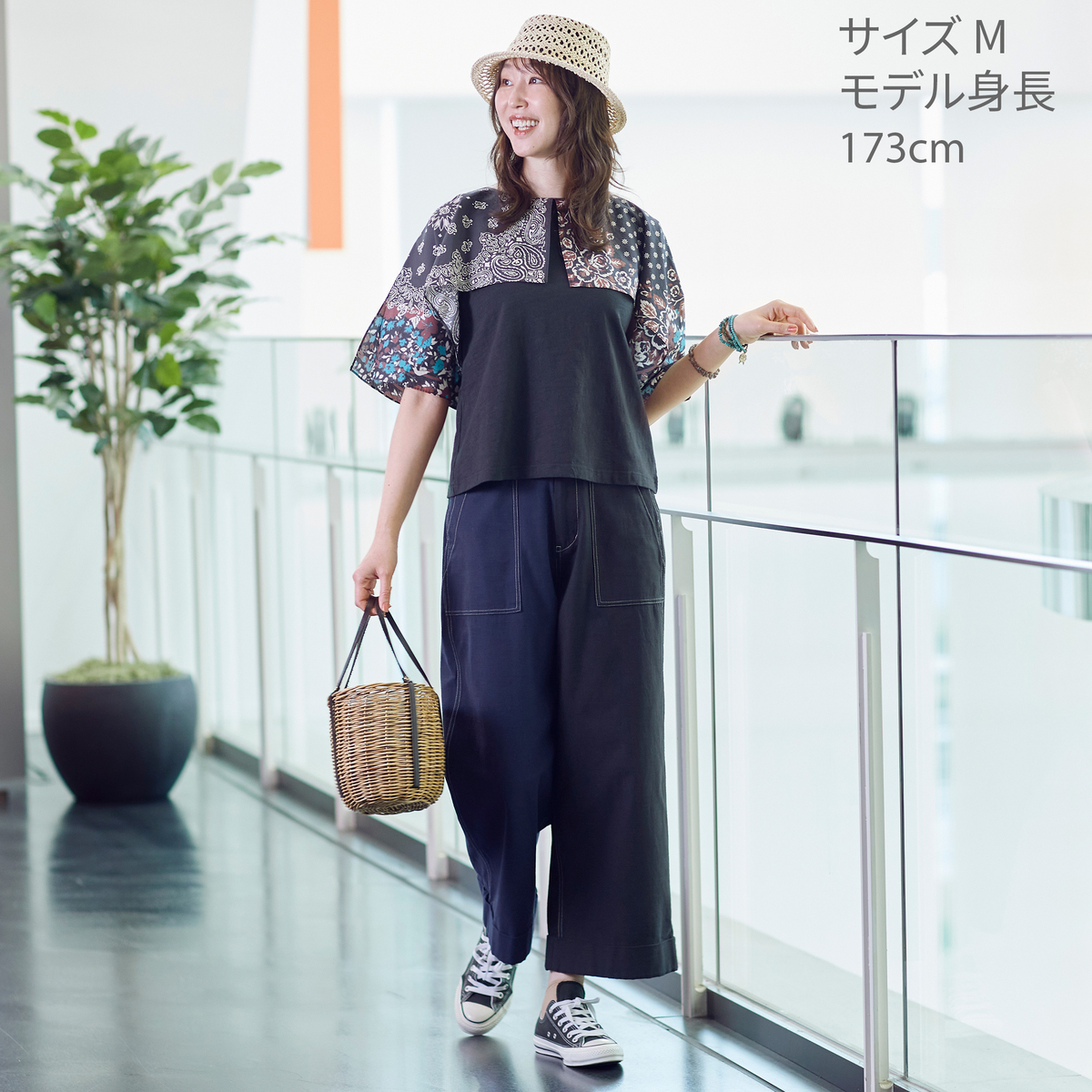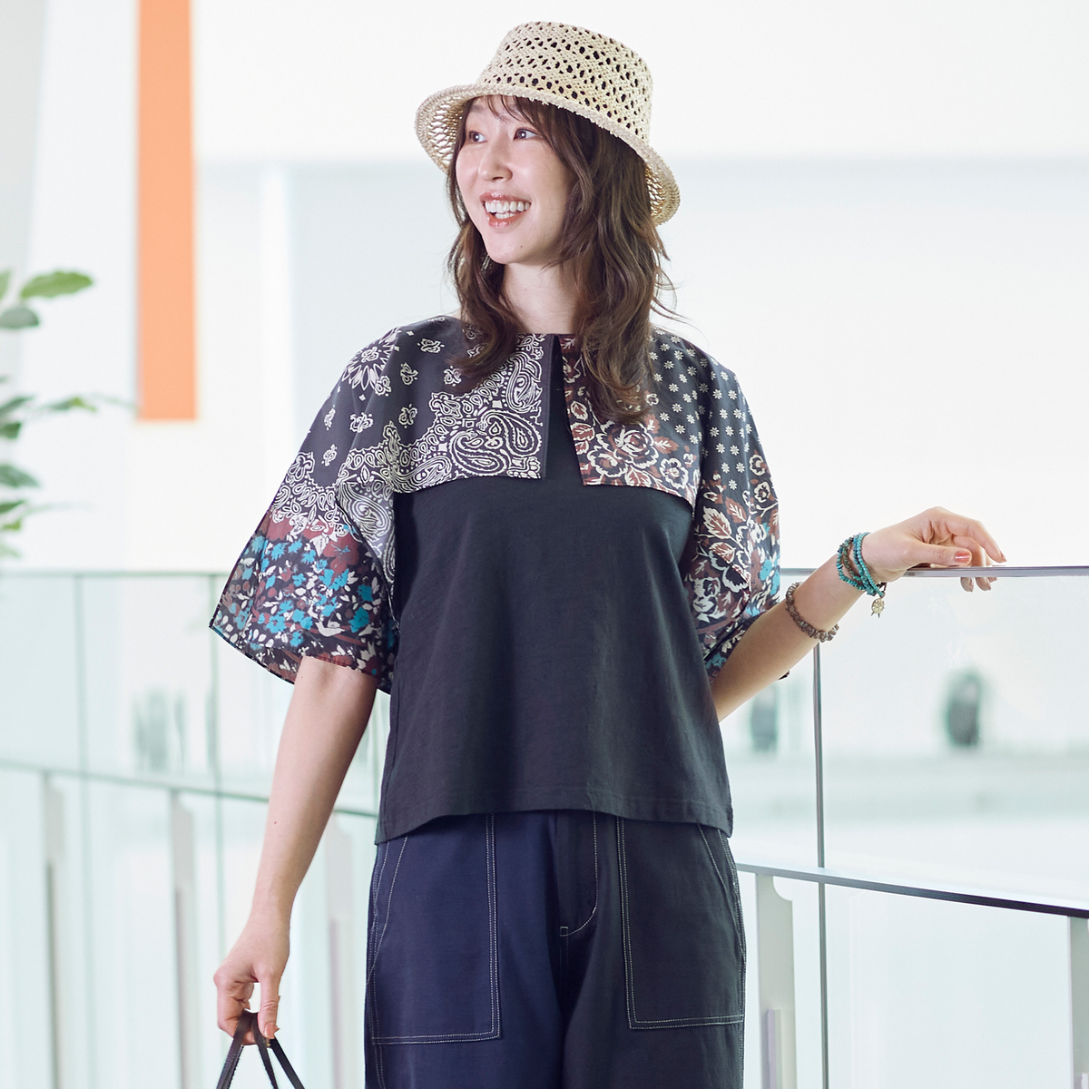 おしゃれなバンダナ風の柄で着るたびに気分が上がるアイテム。ノースリーブは無地仕様で派手になりすぎず、幅広いシーンで活躍します