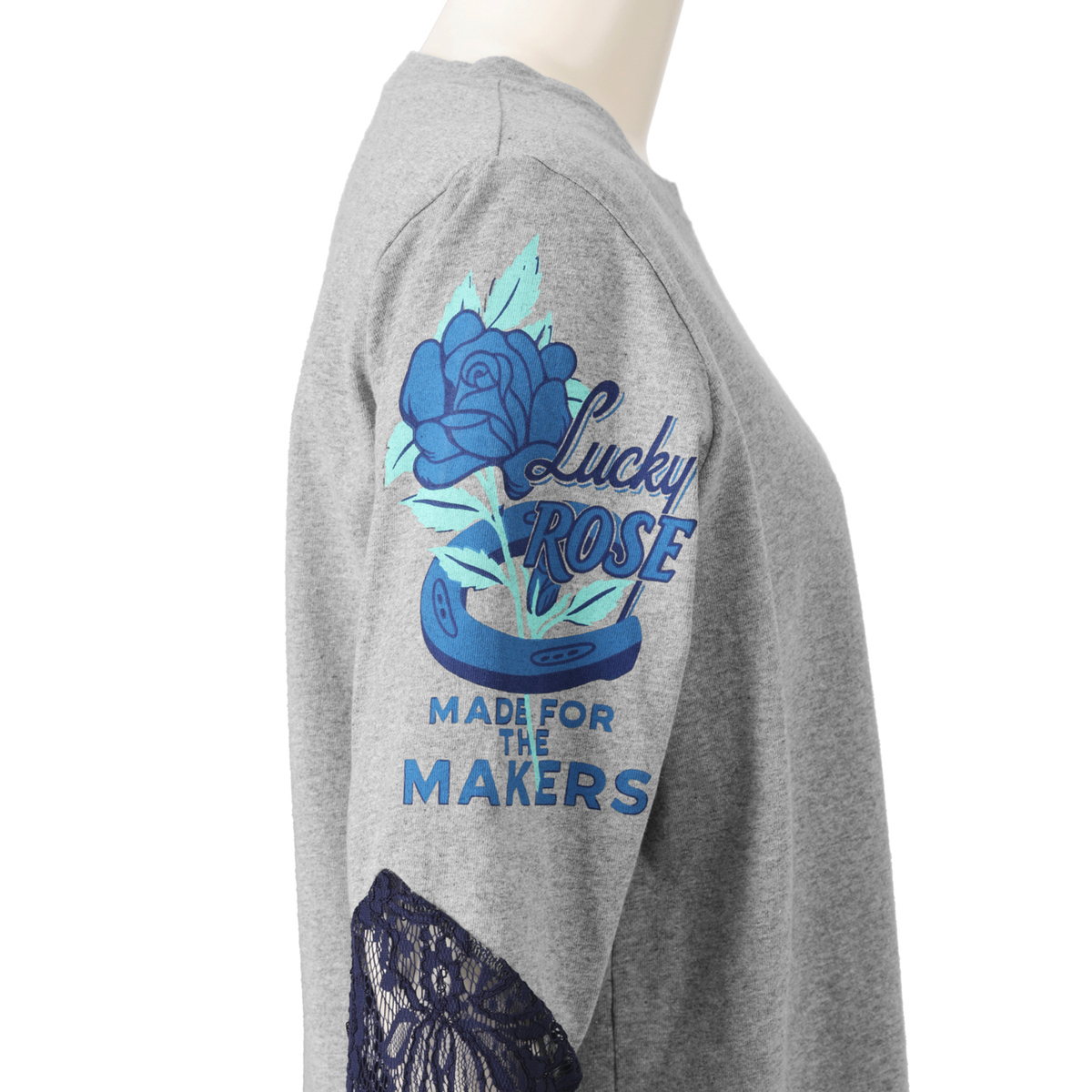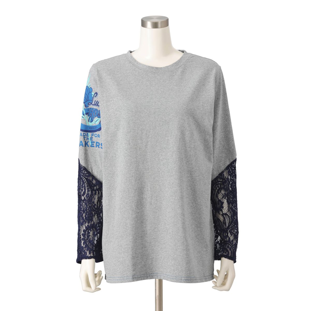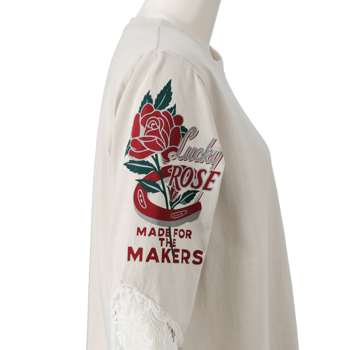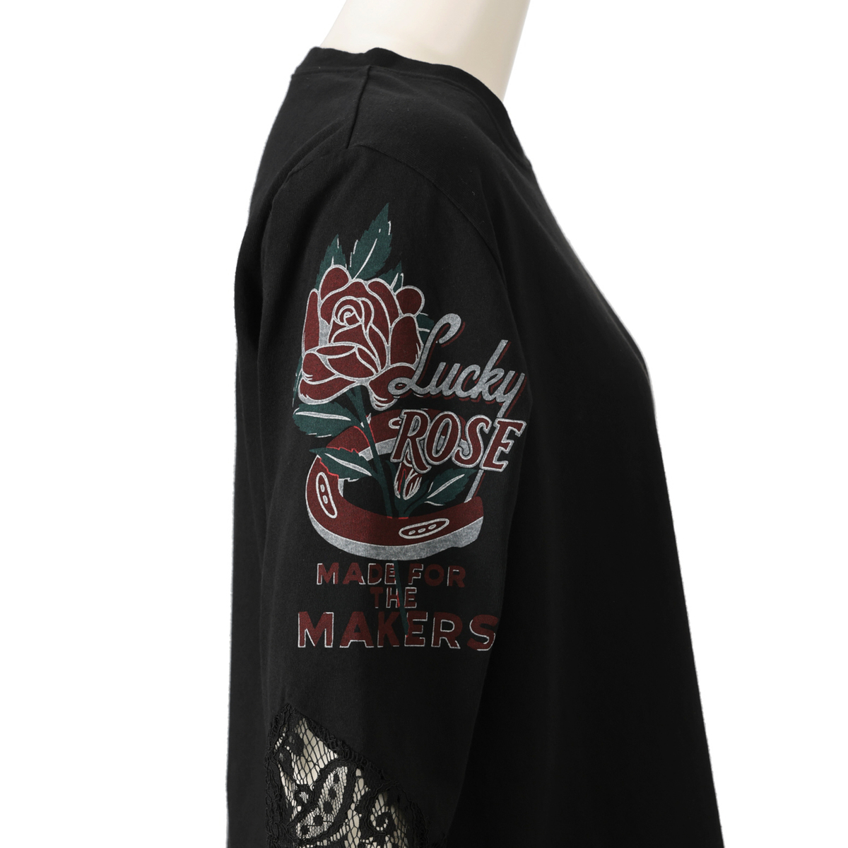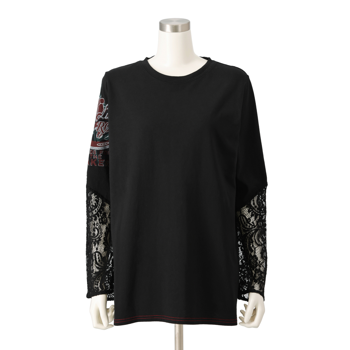 袖にレースをあしらったTシャツです。Tシャツ生地の身頃(胴体部分)に、袖口を繊細なレースで切り替え、甘さと強さが同居する大人のミックススタイルに。ヴィンテージ加工のかすれたプリントが、カッコいい大人を演出します