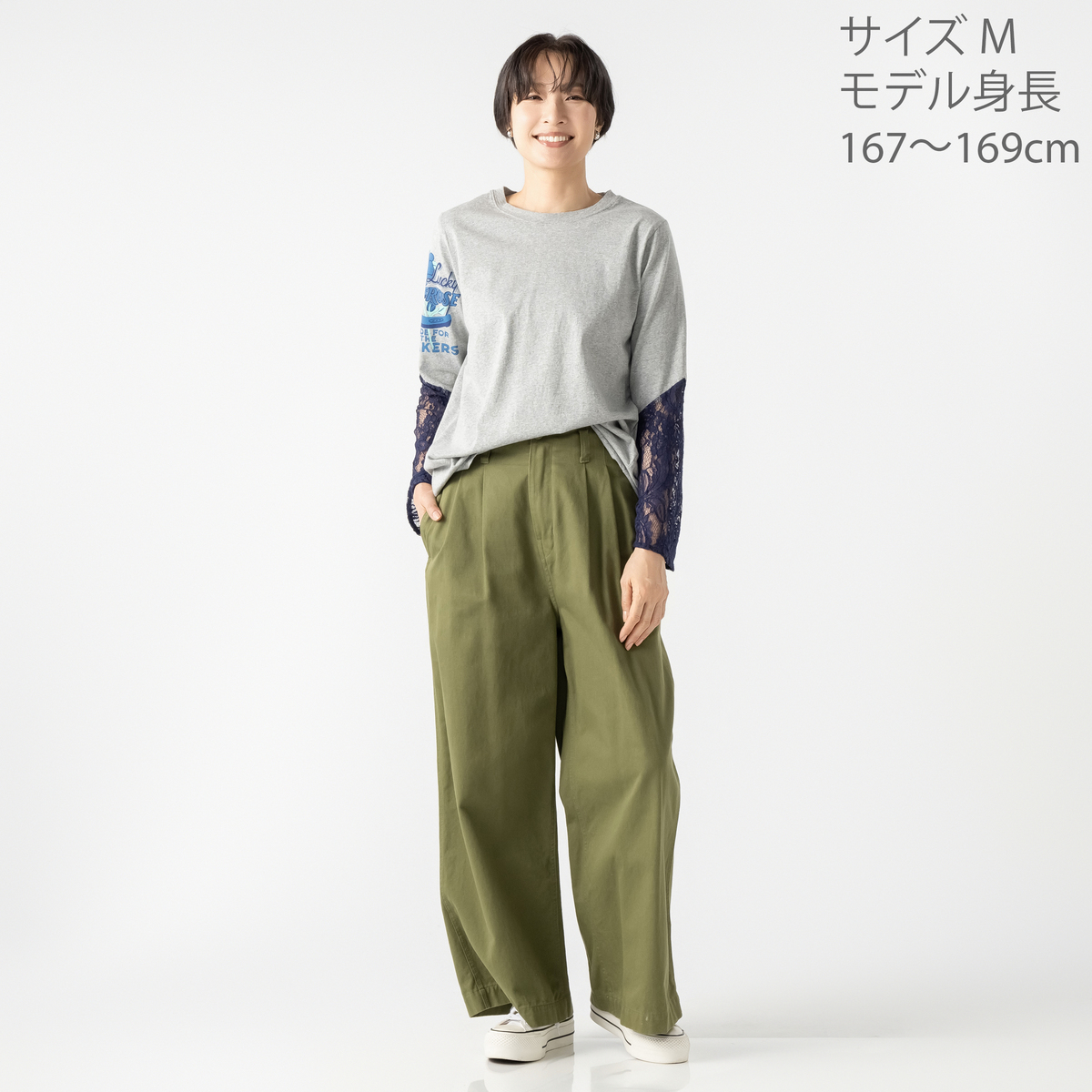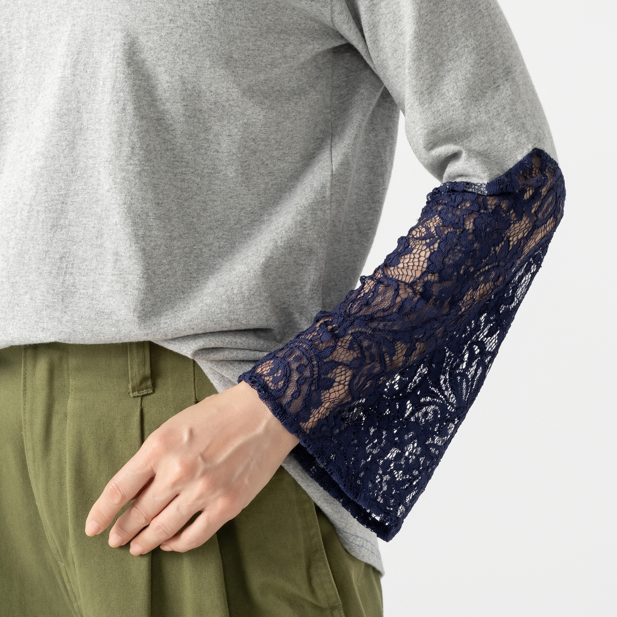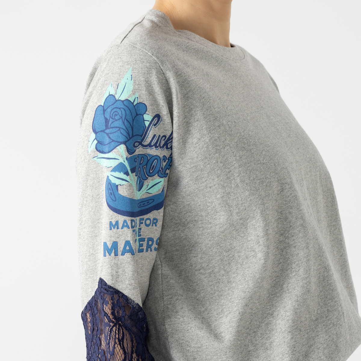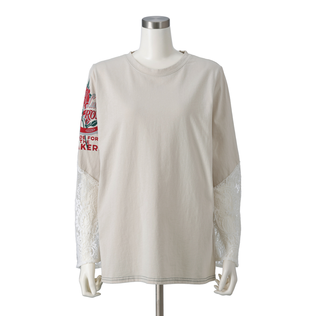 製品洗い加工を施した上で、あえてアイロンをしっかりかけずにふんわり仕上げに。カジュアルなTシャツにレースをはぎ合わせてリメイクしたようなユニークなデザインが、大人の遊び心をくすぐります