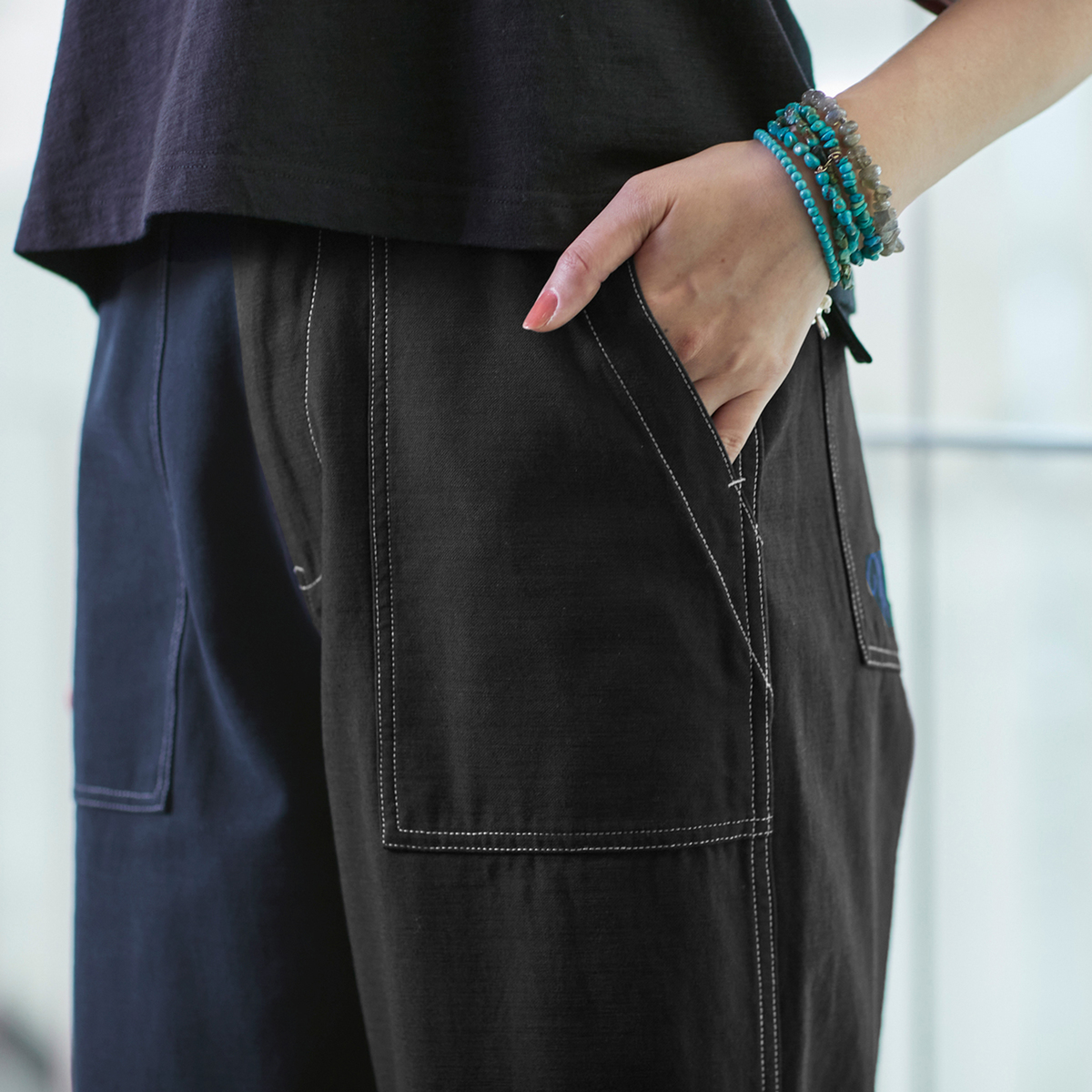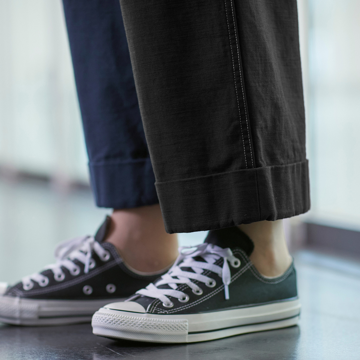 綿100%のバックサテン生地を使用。表側はスラブ感のあるムラが出て無骨な表情を持ちながら、肌に触れる内側はなめらか。洗濯を繰り返すほどに風合いが変化し、自分の体に馴染んでいく経年変化を楽しめます