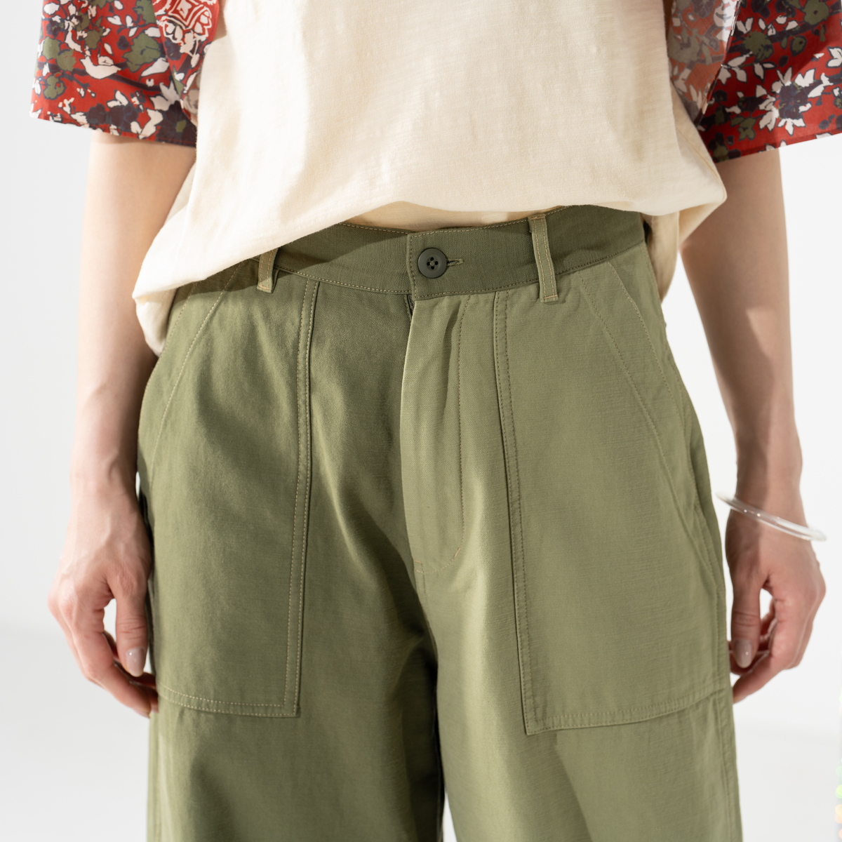 左右で生地の配色を切り替えたミリタリーパンツ。同系色のトーンでまとめることで派手になりすぎず、スタイリングに動きを添えます。全体はシンプルなカジュアルデザインで、トップスとのバランスが取りやすい仕上がりです