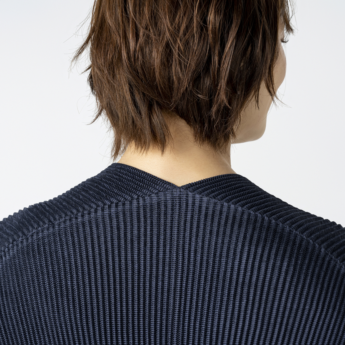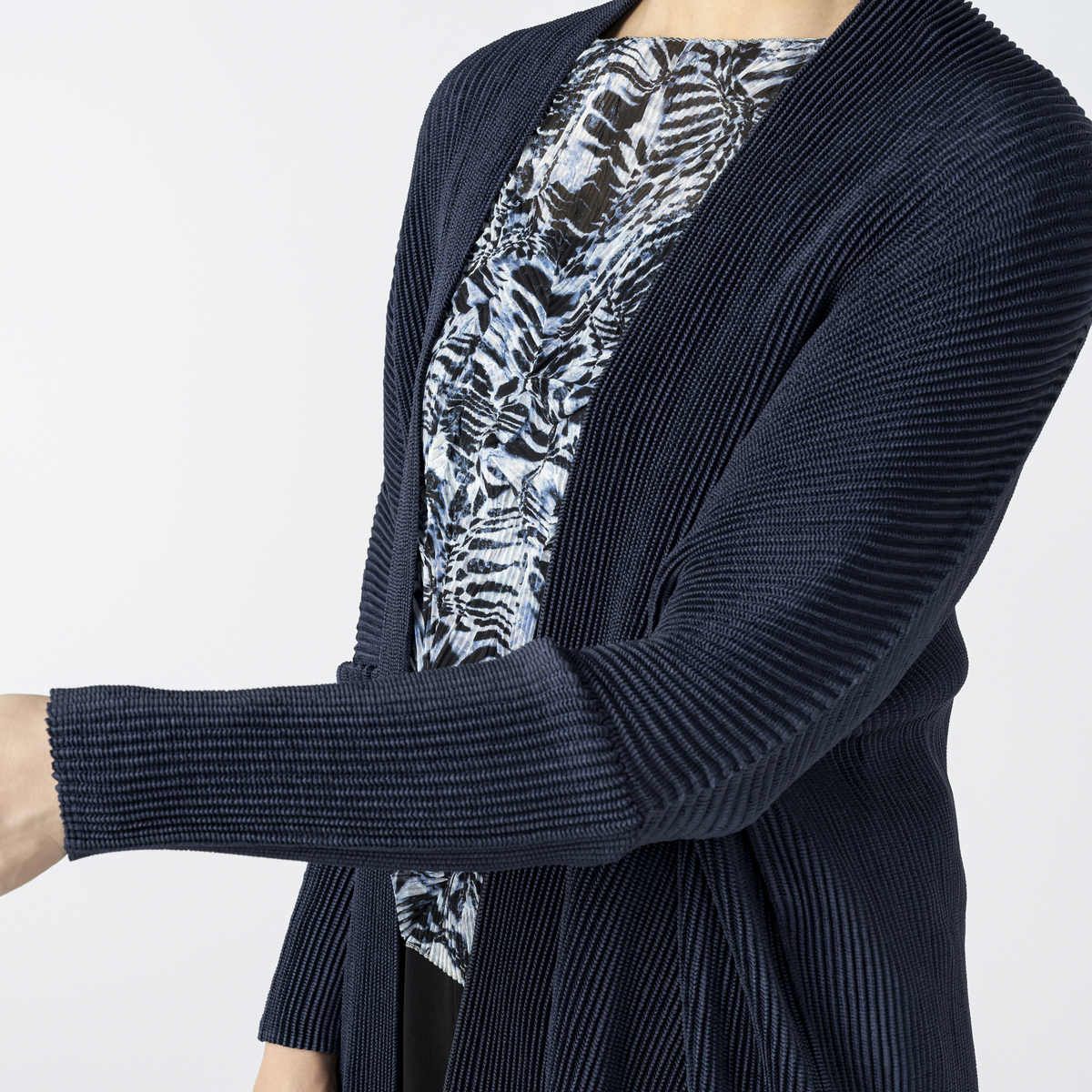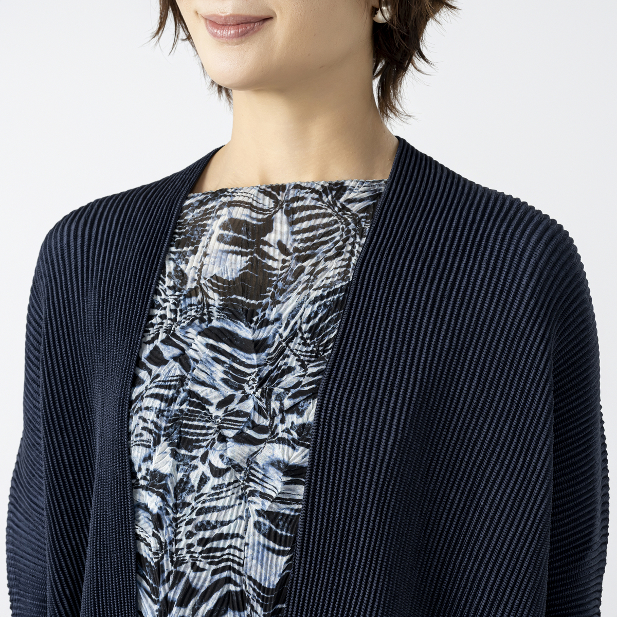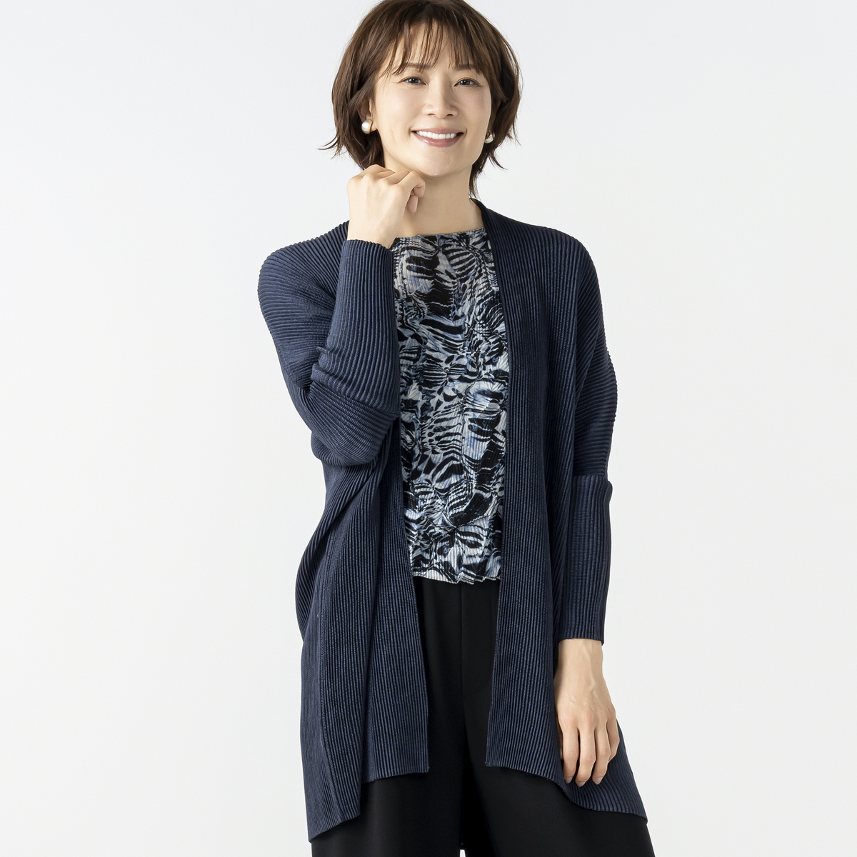 タテ・ヨコ・斜めへの伸縮性で様々な体型にフィットするシャトルプリーツのカーディガン。ワンサイズフリーが基本で、シンプルな着流しデザインがスタイルを美しく見せ、さっと羽織るだけで上品な印象を与えます