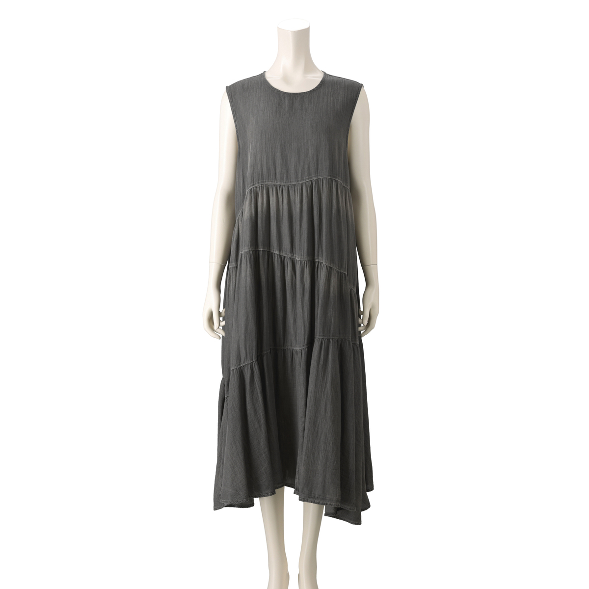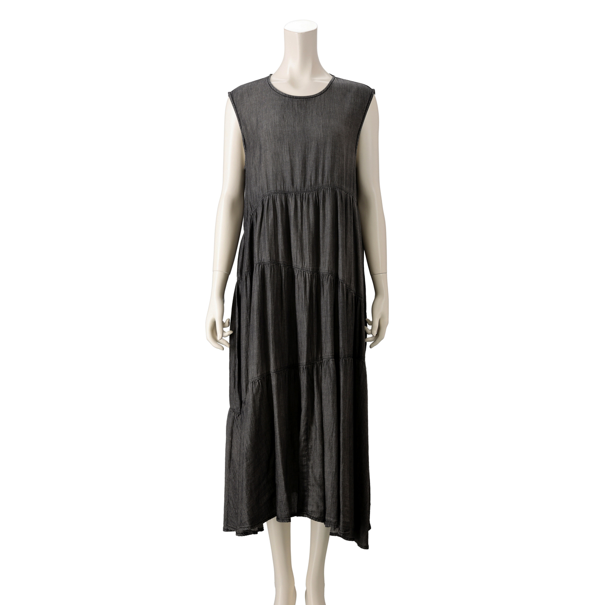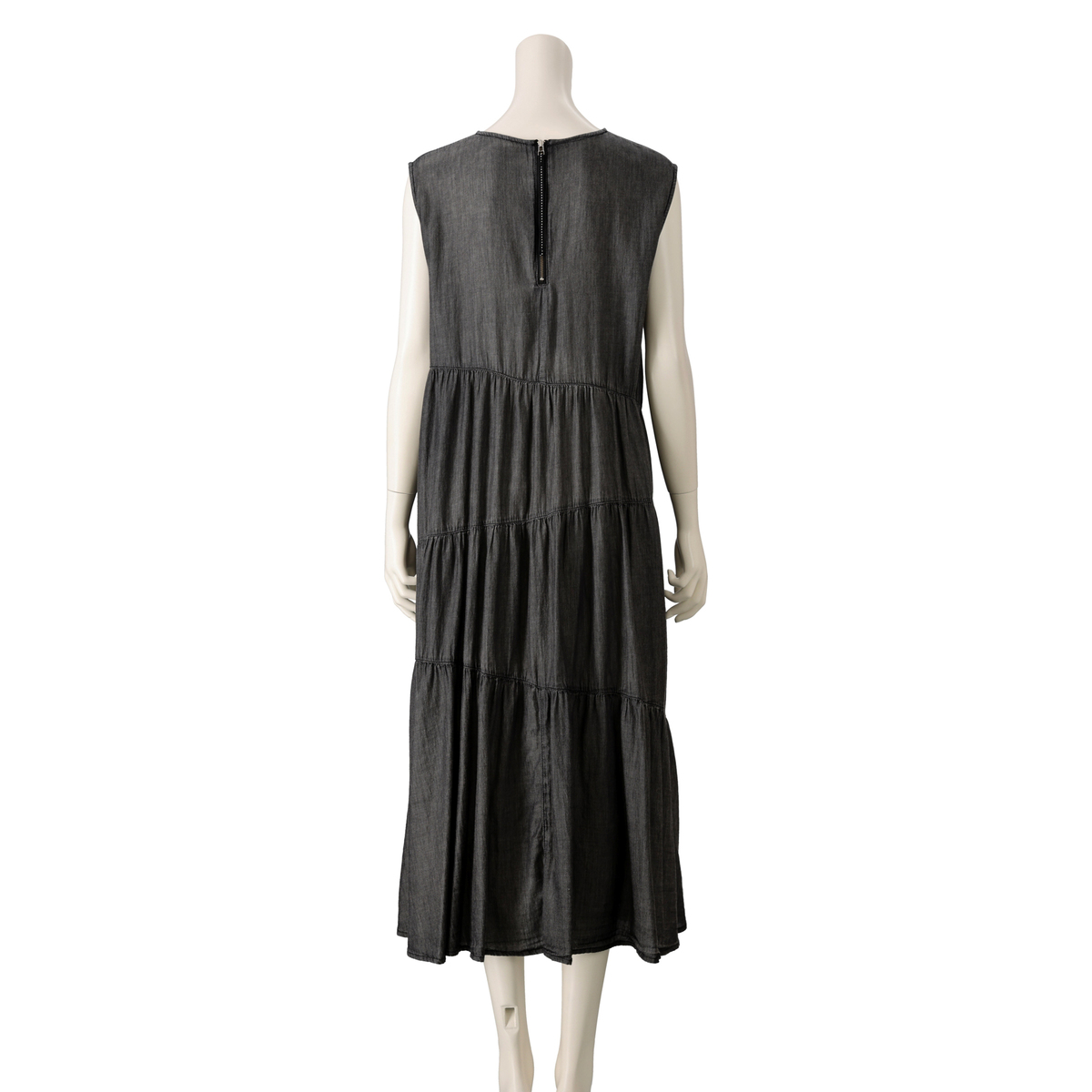 柔らかくしなやかな風合いに仕上げた、薄手デニム素材のワンピース。スカート部分は斜めに切り替えたティアードデザインです。後ろ中心にはファスナーを施した着脱しやすい仕様で、ファスナートップのグログランが、後ろ姿のアクセントになっています