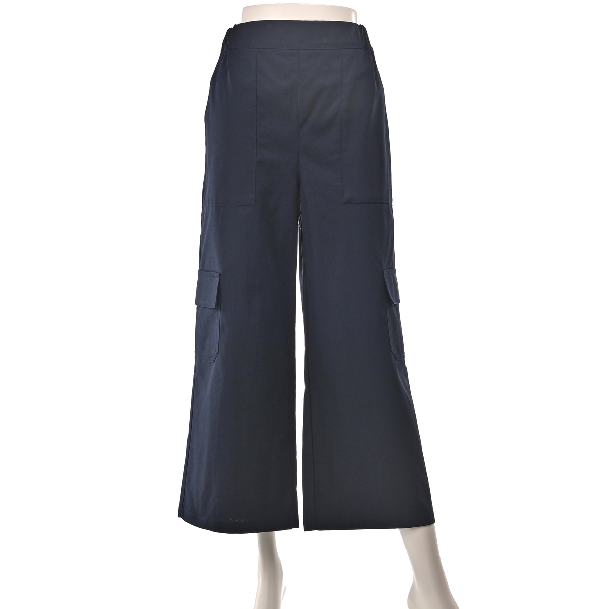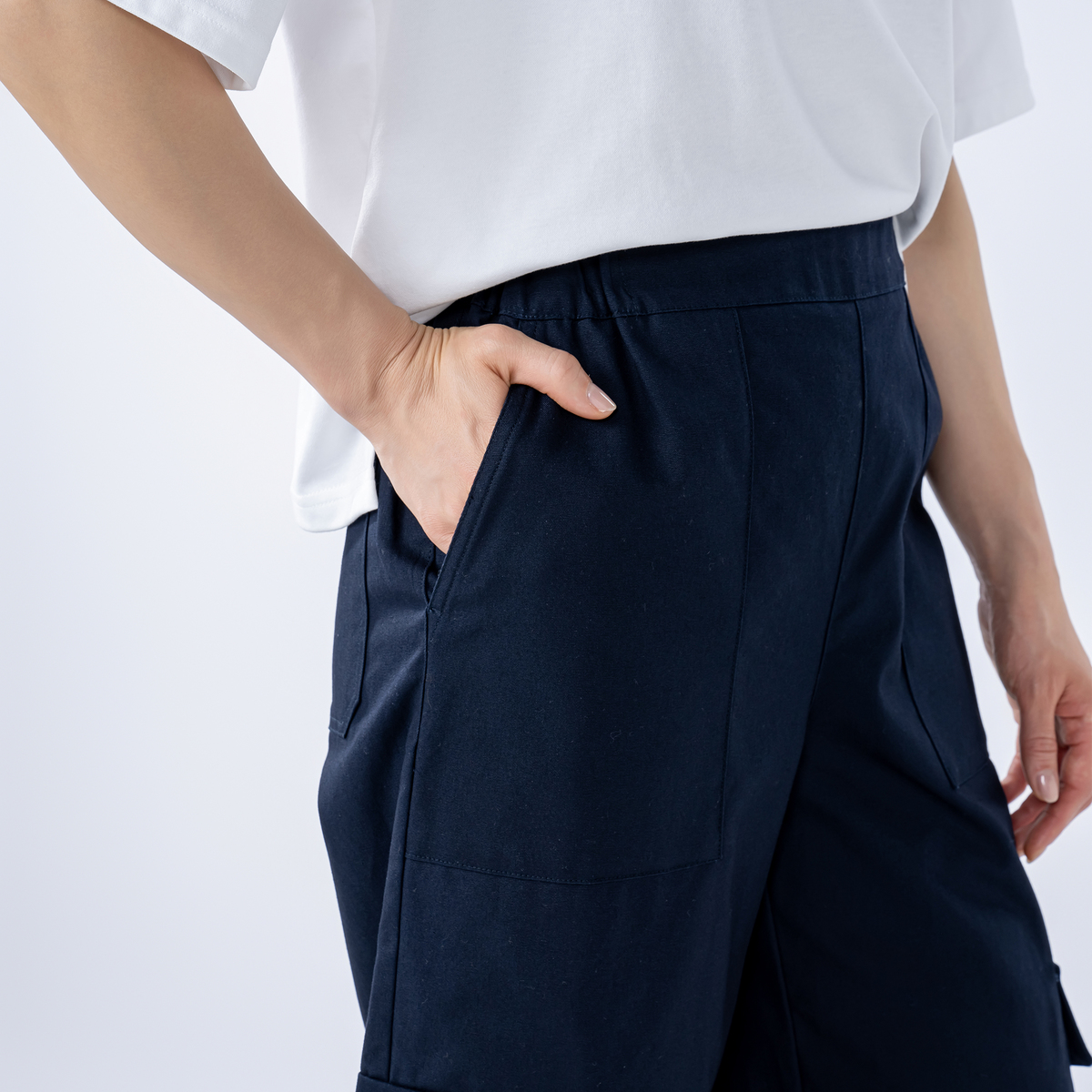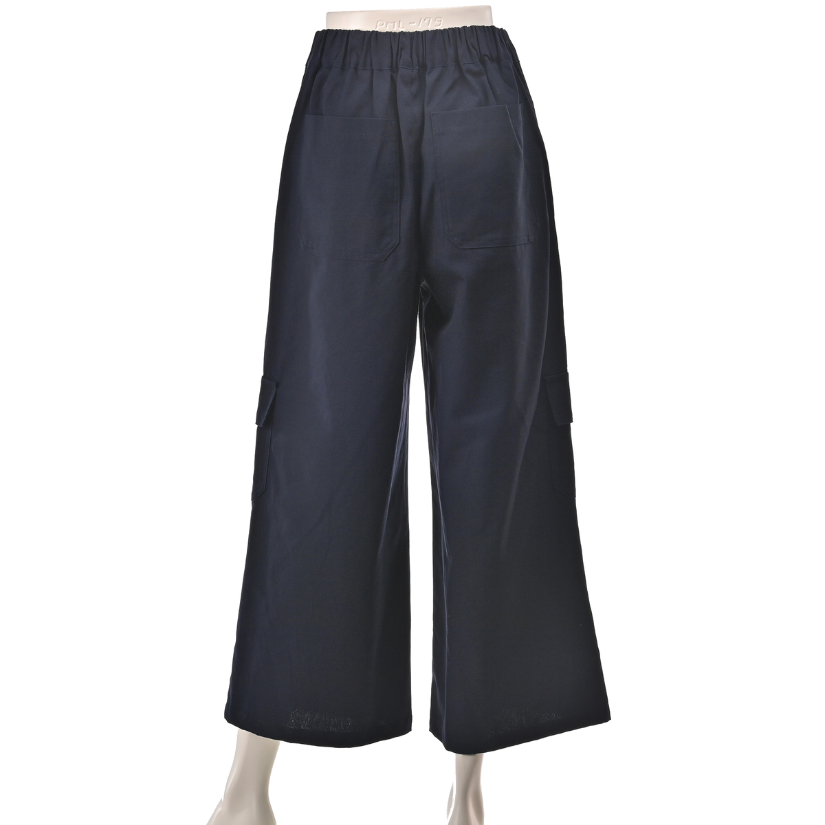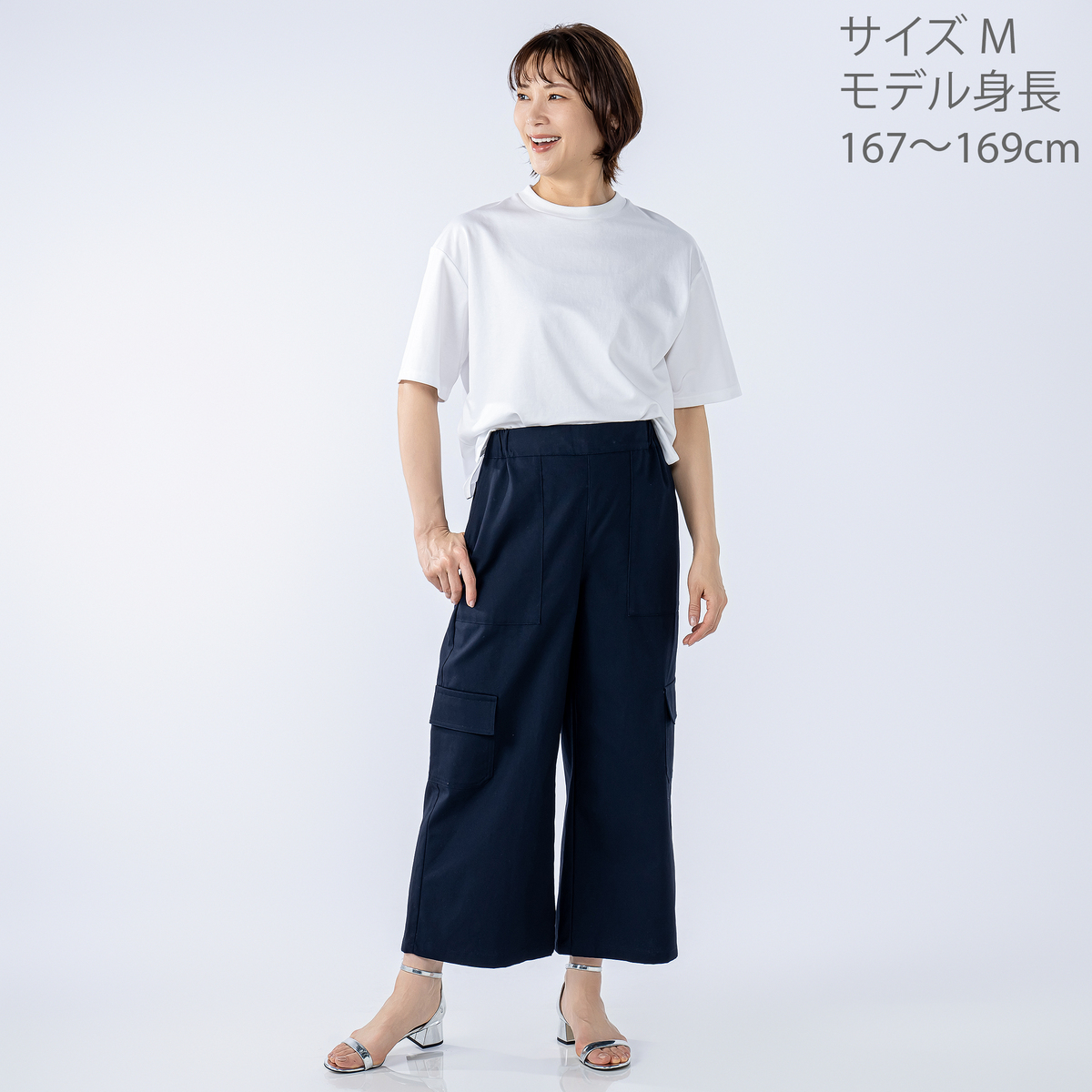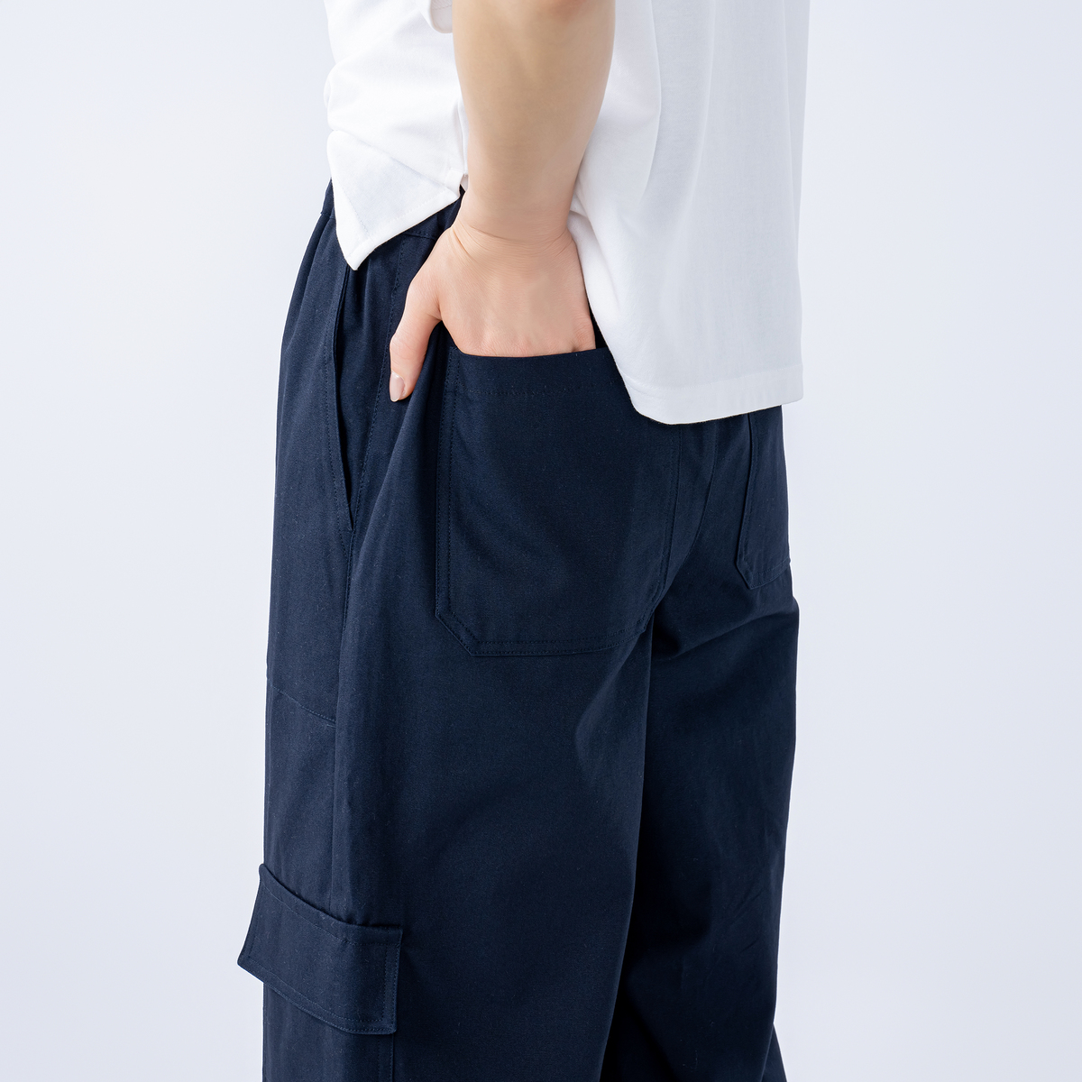 ワイドなAラインを描くカーゴパンツ。直線的に落ちるラインで、特にヒップ下は身体から離れるゆとりがあり、深めの股上で穿き心地も快適。ウエストはゴムのプルオン仕様で、サイド・ヒップ・膝上に配した大きめポケットがワーク感を添えます。裾を広めに仕上げたアンクル丈が、程よく軽さを出すバランスです