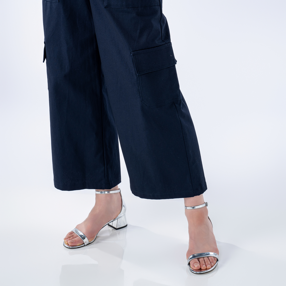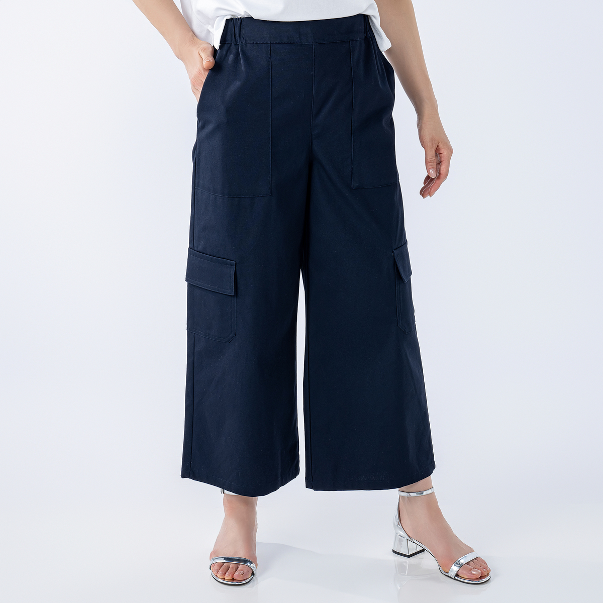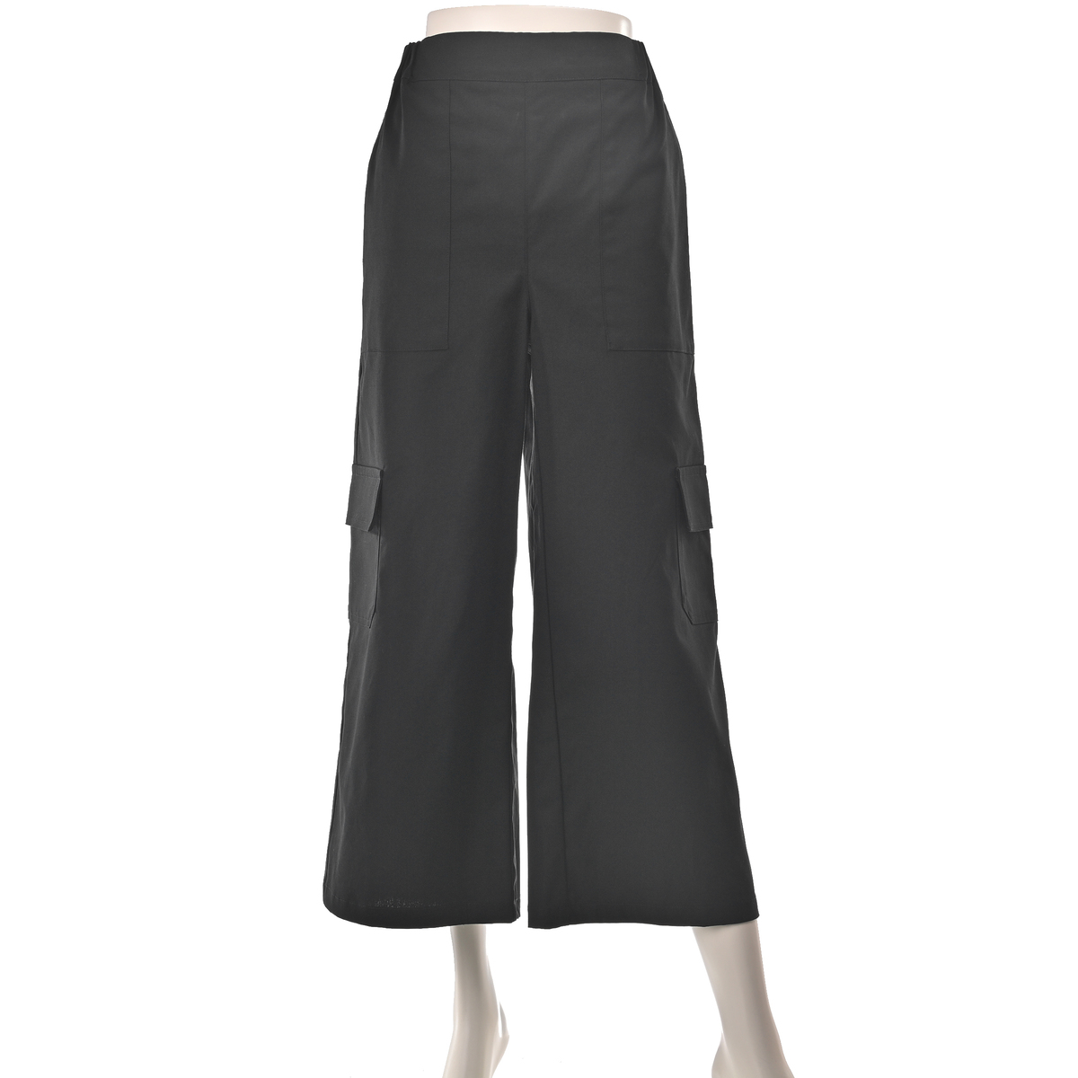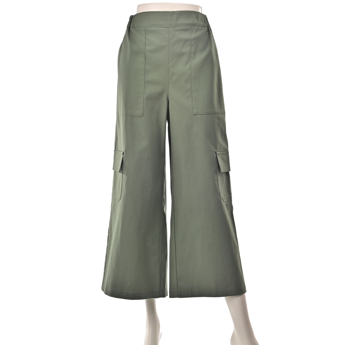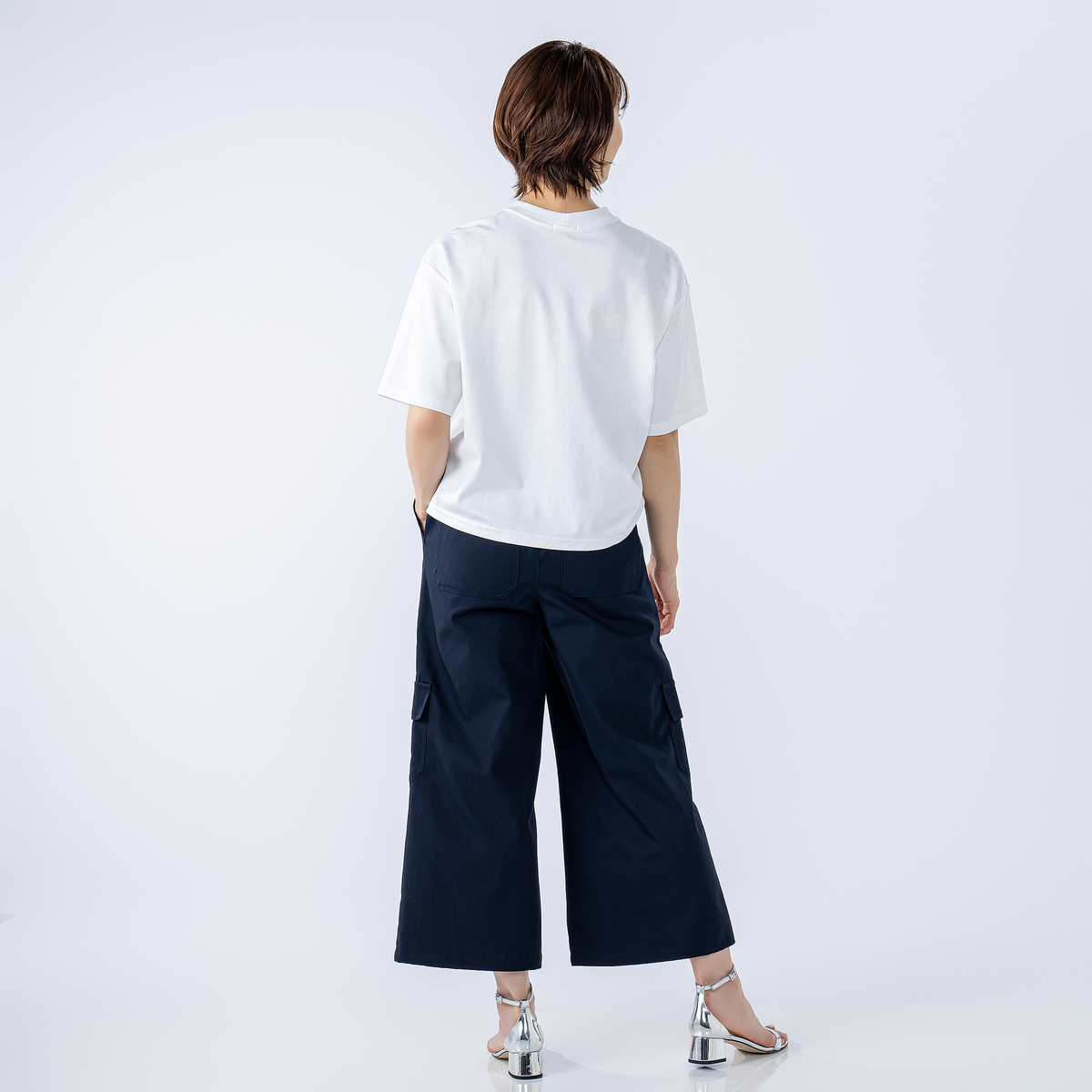 ワイドなAラインを描くカーゴパンツ。直線的に落ちるラインで、特にヒップ下は身体から離れるゆとりがあり、深めの股上で穿き心地も快適。ウエストはゴムのプルオン仕様で、サイド・ヒップ・膝上に配した大きめポケットがワーク感を添えます。裾を広めに仕上げたアンクル丈が、程よく軽さを出すバランスです