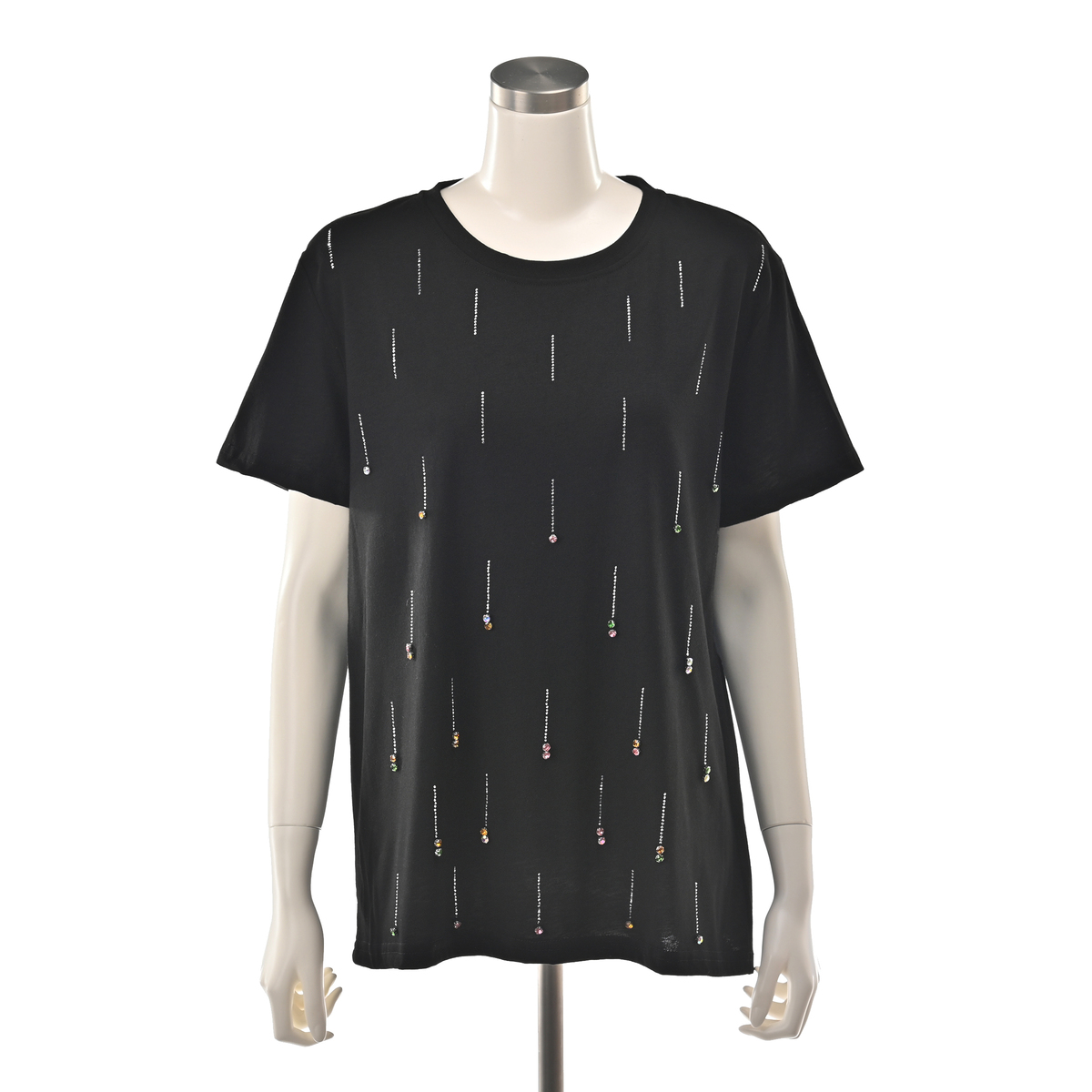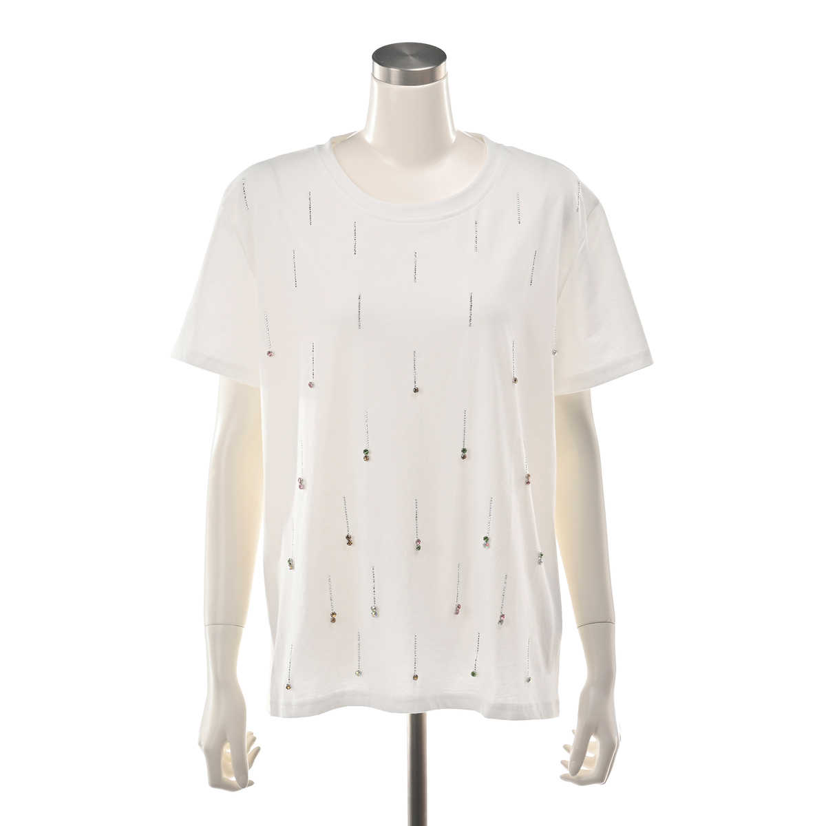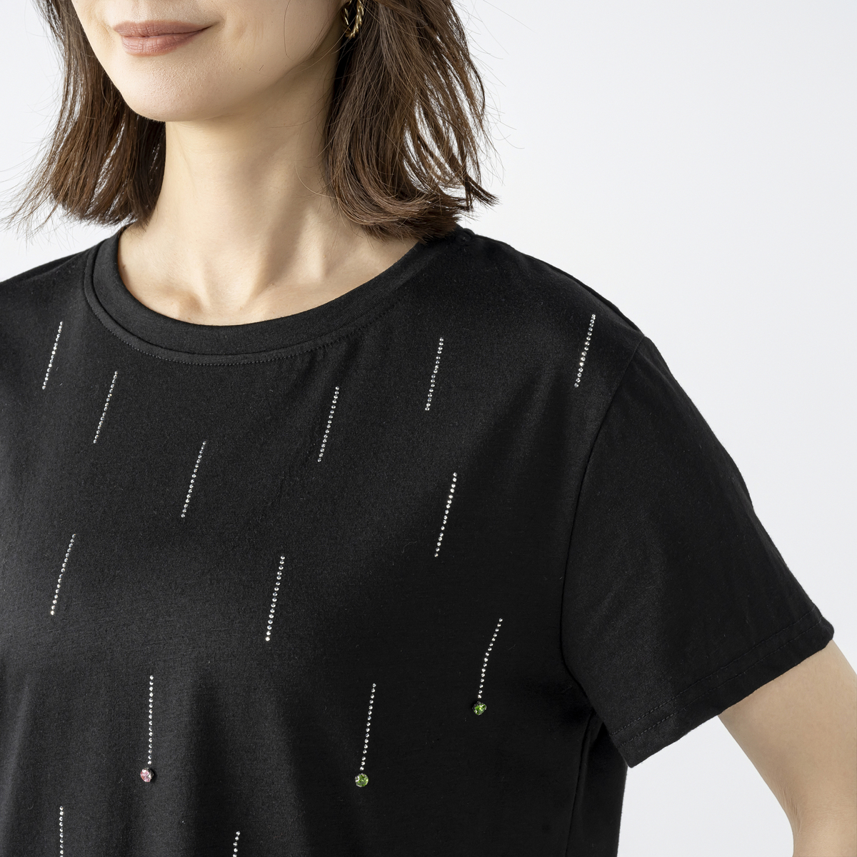 星の雨のようなイメージのビジューモチーフが楽しく華やかなプルオーバー。前身頃に繊細なシルバーカラーのメタルパーツを全体に長く落としながら、バストラインからカラーストーンを付けています*