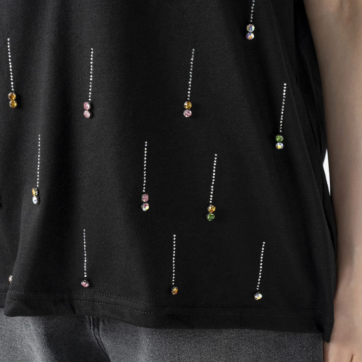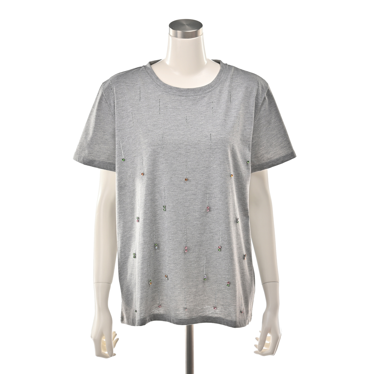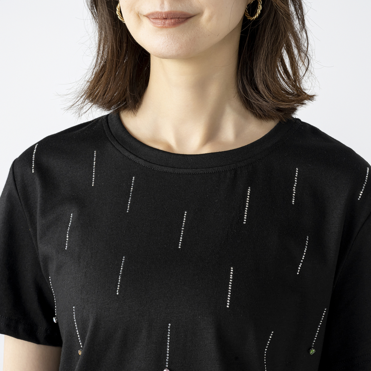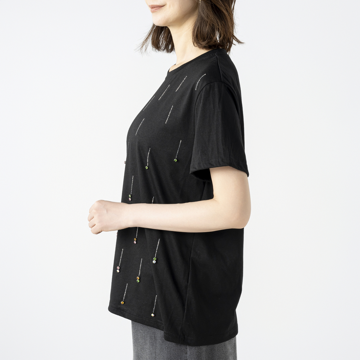 星の雨のようなイメージのビジューモチーフが楽しく華やかなプルオーバー。前身頃に繊細なシルバーカラーのメタルパーツを全体に長く落としながら、バストラインからカラーストーンを付けています*