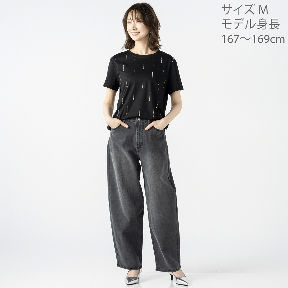[商品寸法(ヌード)cm] サイズ バスト 着丈 S : 96(72〜80) 60.5 M : 102(79〜87) 61.5 L : 108(86〜94) 62.5 LL : 114(93〜101) 63.5 3L : 120(100〜108 64.5 サイズ 肩幅 袖丈 S : 41 19 M : 42 19 L : 43 19.5 LL : 44 20 3L : 45 20.5 [素材] ポリエステル 65% 綿 35% [お手入れ] 手洗い可 [注意事項] ※商品寸法の誤差は多少発生します。ご了承下さい ※濃色製品は、染色の性質上、洗濯すると色落ちする事があります。淡色や白物と組み合わせての着用や洗濯はお避け下さい ※濃色製品は着用中の摩擦により色移りすることがあります。また、雨や汗等で濡れた状態で着用すると色移りすることがあります。その際はお早めに洗濯をして下さい ※つけ置き洗いはお避け下さい ※洗濯後はすぐに脱水し、形を整えて干して下さい。長時間、水につけたままにしないで下さい ※使用している装飾(ビーズ、ラインストーン、スパンコール)部分は、非常にデリケートなため、摩擦や引っ張り、衝撃などにより、脱落したり破損したりする恐れがありますので、ていねいにお取り扱い下さい ※装飾部分にアイロンを当てないで下さい 【中国製】