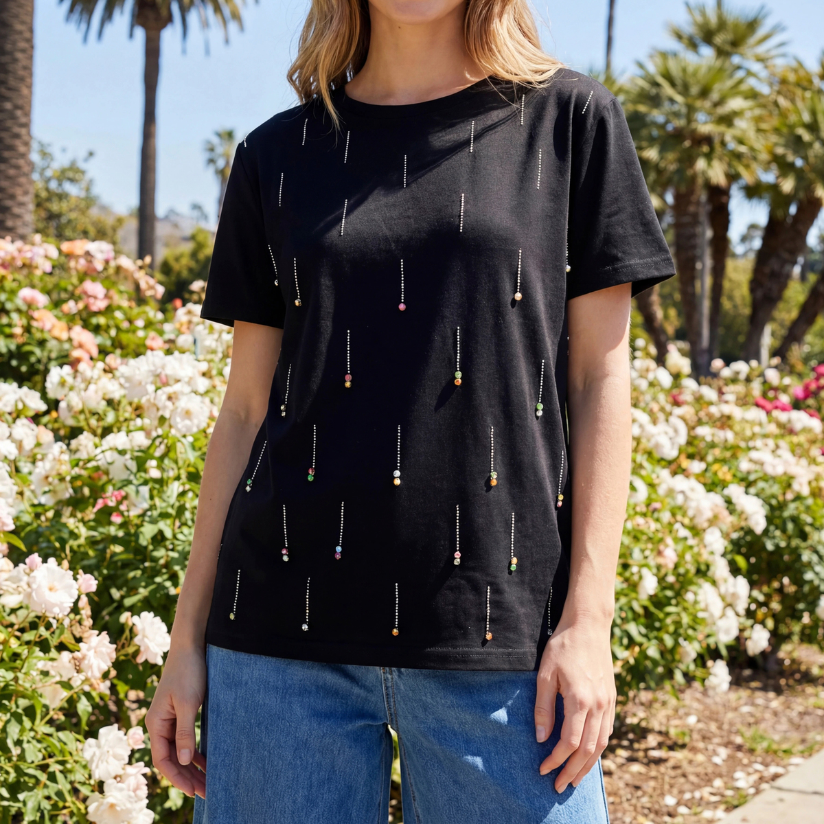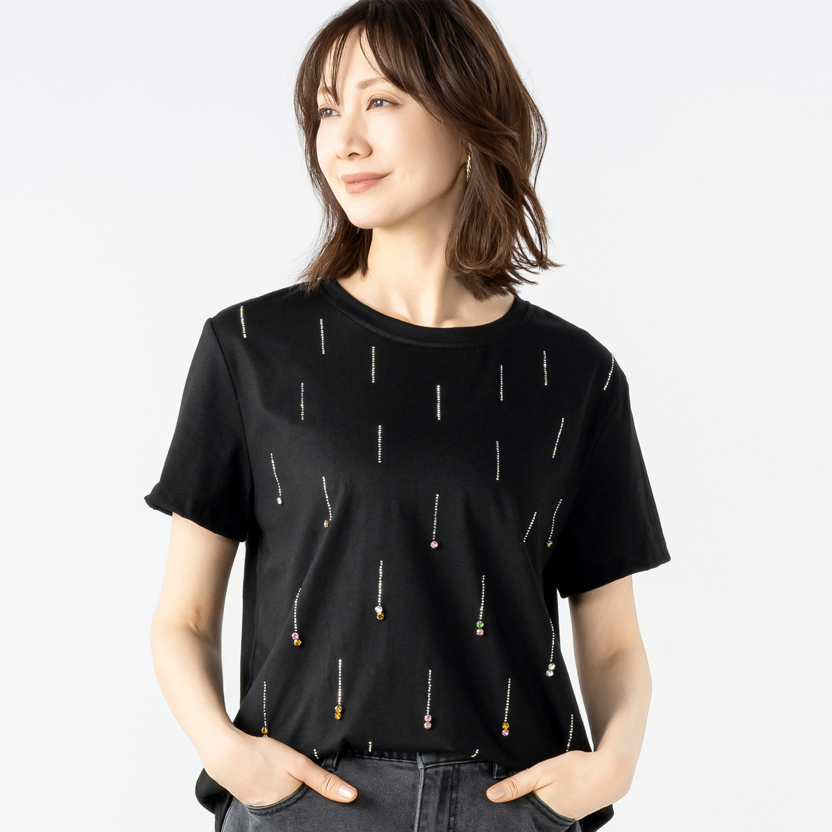 星の雨のようなイメージのビジューモチーフが楽しく華やかなプルオーバー。前身頃に繊細なシルバーカラーのメタルパーツを全体に長く落としながら、バストラインからカラーストーンを付けています*