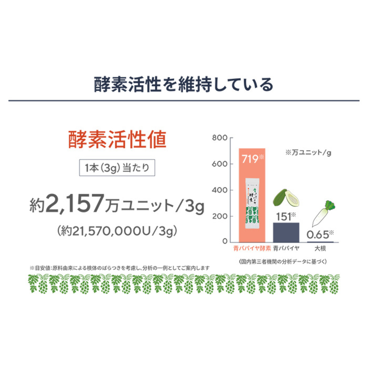 原材料は丹精込めて自社で育てた青パパイヤ、デキストロース、酵母のみのとてもシンプルな発酵食品。本製品は酵素活性を維持しています