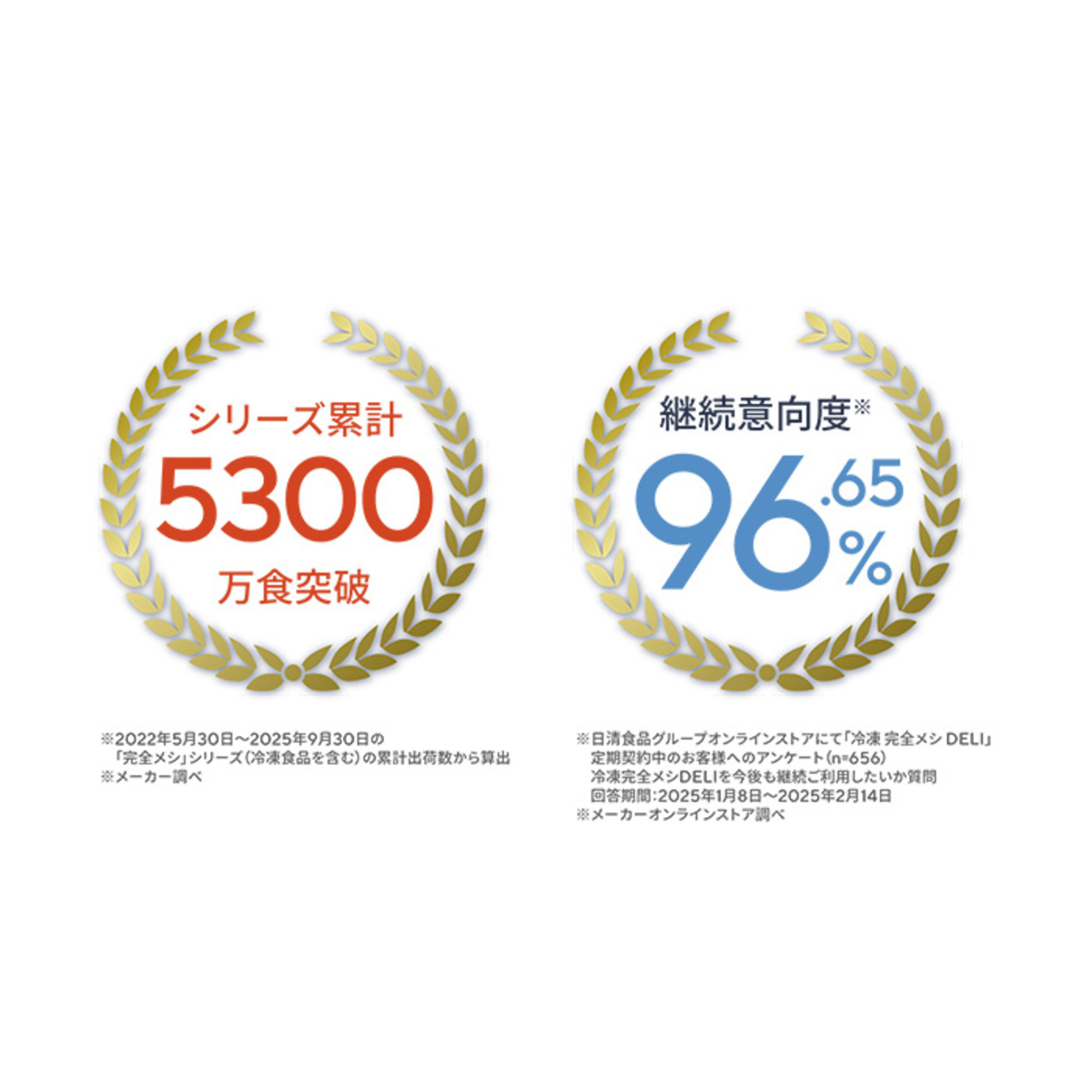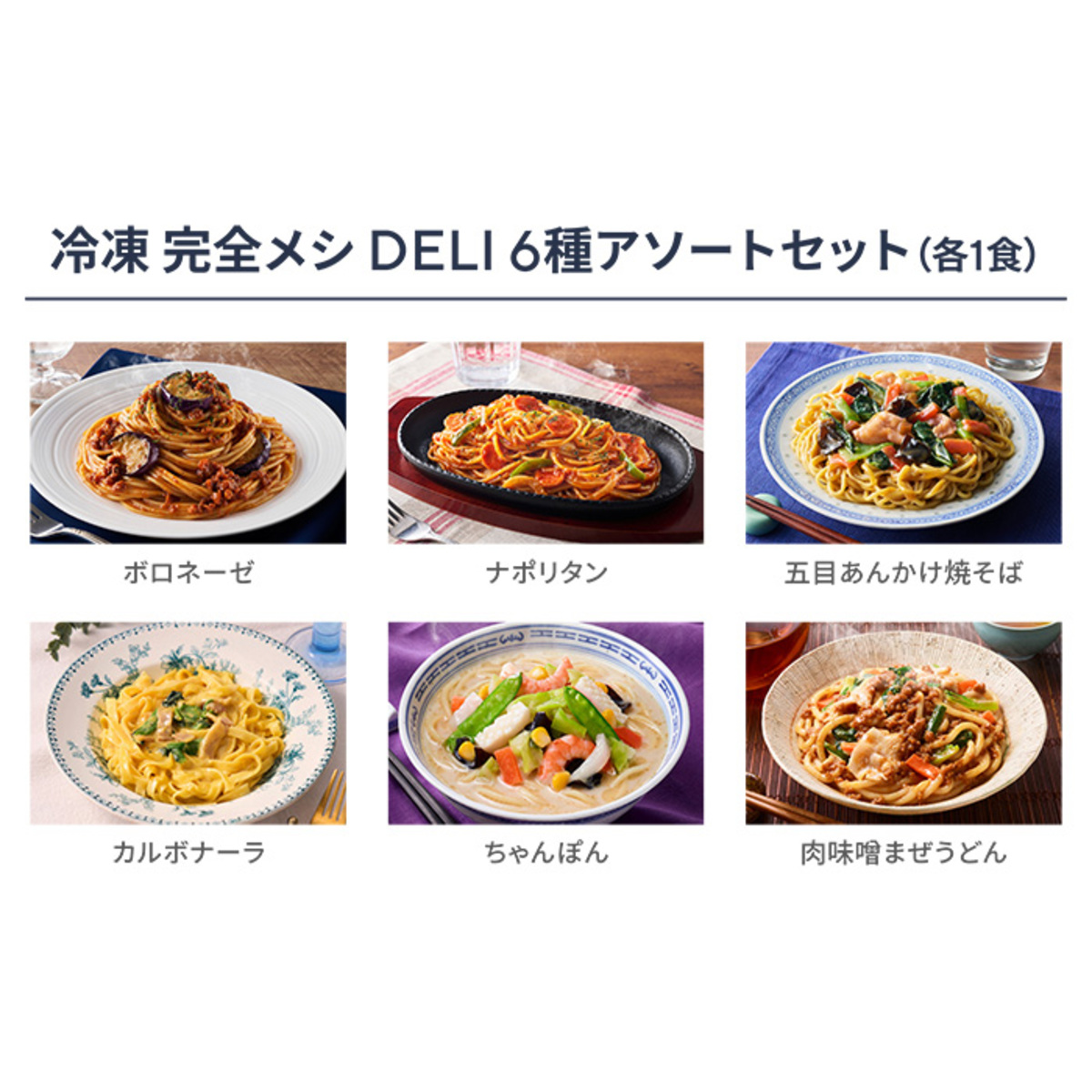 完全メシシリーズ「冷凍 完全メシ DELI」のボロネーゼ、五目あんかけ焼そば、ちゃんぽん、ナポリタン、カルボナーラ、肉味噌混ぜうどんの6種を詰め合わせたセット。電子レンジで温めるだけで手軽にお楽しみいただけます