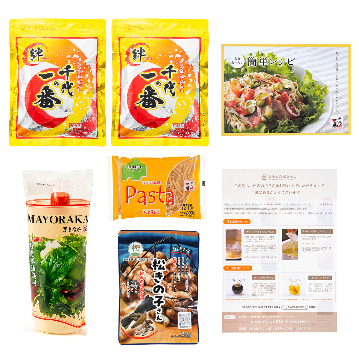 [アレルギー物質特定原材料8品目] 卵、小麦 [セット内容] ・QVC千代の一番50包【400g(8g×50包)】×2袋 ・毎日食べたい簡単レシピ1冊 ・まよらか 300g ・万能だし松きの子さん 80g(8g×10包) ・松きの子さんレシピ×1枚 ・ちよろに 200g [賞味期限] 千代の一番:2027年9月末 まよらか:2026年10月23日 ちよろに:2028年10月末 松きの子さん:2027年8月末 [保存方法] <千代の一番・万能だし松きの子さん> 開封前:直射日光を避け、常温で保存してください 開封後:開封後は必ず密封し冷蔵庫にて保存してください <まよらか> 開封前:直射日光を避け、常温で保存してください 開封後:開封後は中の空気を出してフタをかたくしめ、冷蔵庫(5℃〜10℃)に保存して、なるべく早くお召し上がりください <ちよろに> 直射日光及び湿気を避けて常温で保存してください [注意事項] <QVC千代の一番> ※ぬれた手でだしパックを触らないでください ※沸騰した鍋の上で袋の中からだしパックを取り出さないでください <QVC千代の一番・松きの子さん> ※ぬれた手でだしパックを触らないでください ※沸騰した鍋の上で袋の中からだしパックを取り出さないでください ※だしパックが固まる場合がありますが、品質には問題ございません。ふりかけてご使用の場合は、かるくほぐしてご使用ください ※基本ベースの味付けはしてありますが、他の調味料はお好みにより適宜ご使用ください ※品質保持剤が入っておりますので召し上がらないように注意してください <まよらか> ※開封後は、中の空気を出してフタをかたくしめ、冷蔵庫(5℃〜10℃)に保存して、なるべく早くお召し上がりください ※冷凍不可 ※小さなキャップですのでお子様が誤ってお口に入れないようにご注意ください ※シールは完全にはがしてからご使用ください ※製品中の黒い粒は原料由来のものです <ちよろに> ※パスタの中の細かい斑点は小麦の皮の一部で異物ではありません ※調理の際は熱湯・吹きこぼれに十分ご注意ください。調理の際のやけどにご注意ください <松きの子さん> ※開封後は必ず密封して冷蔵庫にて保存してください [原料原産地] 千代の一番、松きの子さん:食塩(国内製造) まよらか:米油(国内製造) ちよろに:小麦粉(国内製造) [原産国] 日本 [お召し上がり方] <QVC千代の一番> 1.600〜700mlの水を入れた鍋の中にだしパックを1包入れます 2.火をつけ沸騰したら、弱火にして5分間煮出します (だしパックが浮いてきますので、お玉の背でかるく2〜3回押して沈めます。) 3.だしパックを取り出します。(必ずしも取り出す必要はありません。) <ちよろに> 1.沸騰させたお湯に食塩を入れます(パスタ100gあたり、水1L、食塩小さじ1) 2.沸騰した中にパスタを入れて12〜13分間ゆでてください。時々かき混ぜてください。差し水はしないでください 3.ゆで上がったらすばやくザルなどにあけ、水気を切って調理してください <松きの子さん> 1.600ml〜700mlの水を入れた鍋の中に、だしパックを1包を入れます 2.火をつけ沸騰したら、弱火にして5分間煮出します (だしパックが浮いてきますのでお玉の背などでかるく2〜3回押して沈めてください) 3だしパックを取り出します。(必ずしも取り出す必要はありません) ・お吸い物:水600ml〜700mlにだしパック1包 ・おでん・玉子スープや野菜スープ:水約600mlにだしパック1包 ・煮物:水約400mlにだしパック1包 ・炊き込みご飯は、米1合にだしパック1包 ・お味噌汁:水約800mlにだしパック1包(味噌は少なめ) ・茶碗蒸しやそば・うどん・天つゆ:水約400mlにだしパック1包 ・だし醤油:醤油200mlにだしパック1包(水は入れないでください) ・水だし:水200mlにだしパック1包(冷蔵庫で保管し2日以内に使用してください) [原材料] QVC千代の一番50包: 風味原料(鰹節粉末、鮪節粉末、そうだ鰹節粉末、鰹エキス、うるめ鰯粉末、かたくち鰯粉末、鯖節粉末、昆布粉末、椎茸粉末、昆布エキス)、食塩(国内製造)、砂糖(甜菜糖、甜菜オリゴ糖)、酵母エキス(酵母エキス、でん粉分解物)、粉末醤油、(一部に小麦・さば・大豆を含む) まよらか(マヨネーズ風): 米油(国内製造)、卵、りんご酢、食塩、野菜ブイヨンパウダー、香辛料、(一部に卵・小麦・大豆・りんごを含む) ちよろに(マカロニ): 小麦粉(国内製造) 万能だし松きの子さん: 風味原料(かつお節粉末、松きのこ粉末、そうだ鰹節粉末、鯖節粉末、鰹エキス、昆布粉末、かたくち鰯粉末、うるめ鰯粉末、昆布エキス)、食塩(国内製造)、砂糖、酵母エキス(酵母エキス、でん粉分解物)、粉末醤油、(一部に小麦・さば・大豆を含む)