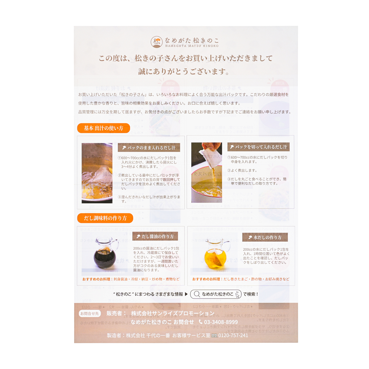 国内産のかつお節粉末、松きのこ粉末、そうだ鰹節粉末、鯖節粉末、昆布粉末、昆布エキス、かたくち鰯粉末、うるめ鰯粉末を原料に使用した万能だし。松きのことは、きのこの人工栽培を研究する途中で生まれたシイタケの仲間です