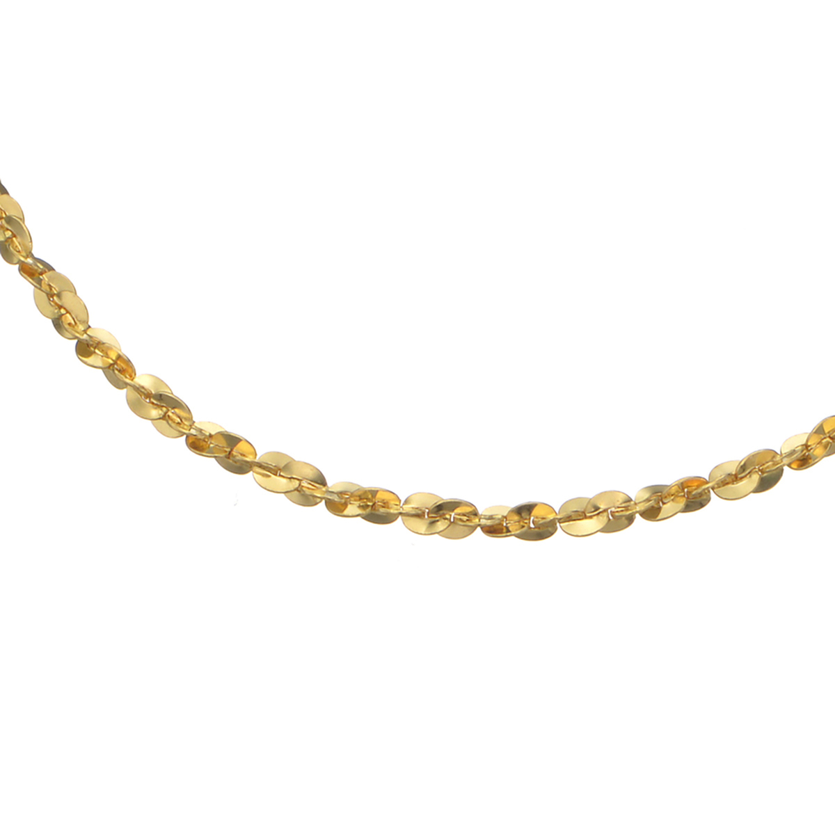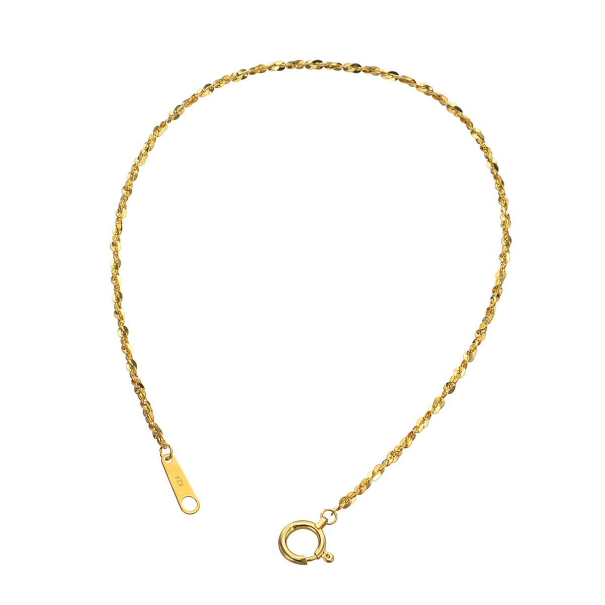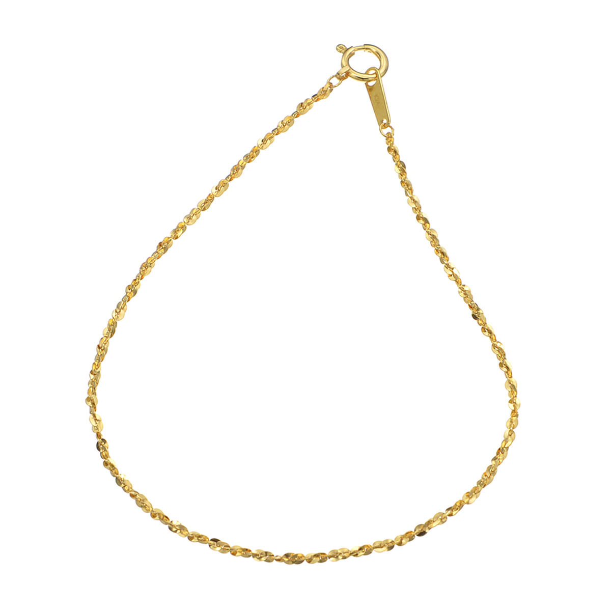 アズキチェーンをベースにプレス&ひねりの加工を施し、より強い光沢感が楽しめる鏡面仕上げのチェーンブレスレットに。一つ一つのコマの面が広く、更にヒネリを加えることで、流れるような光の煌めきを表現しました