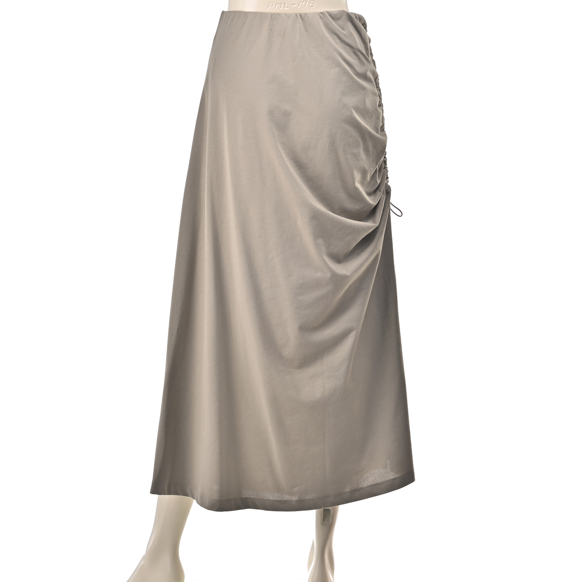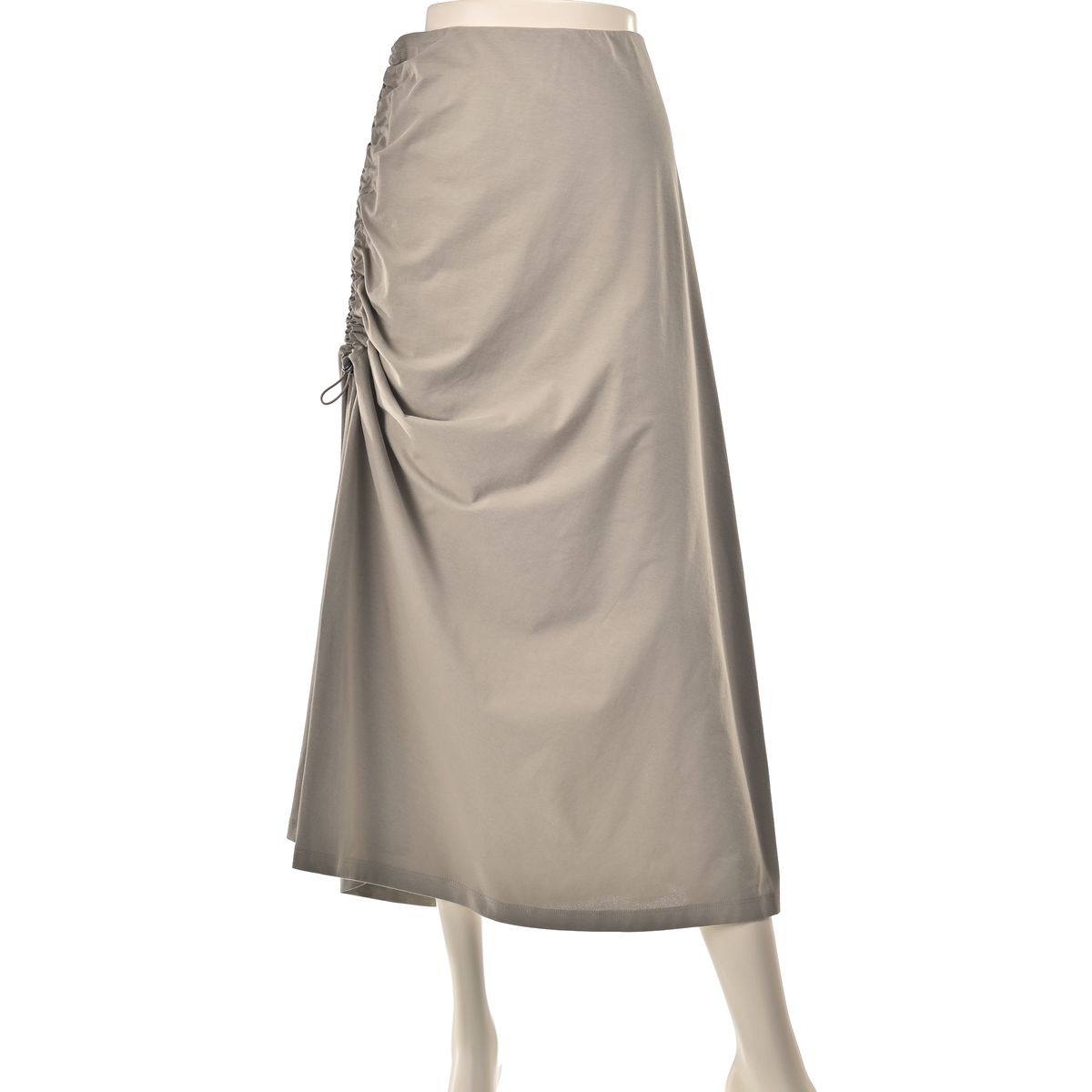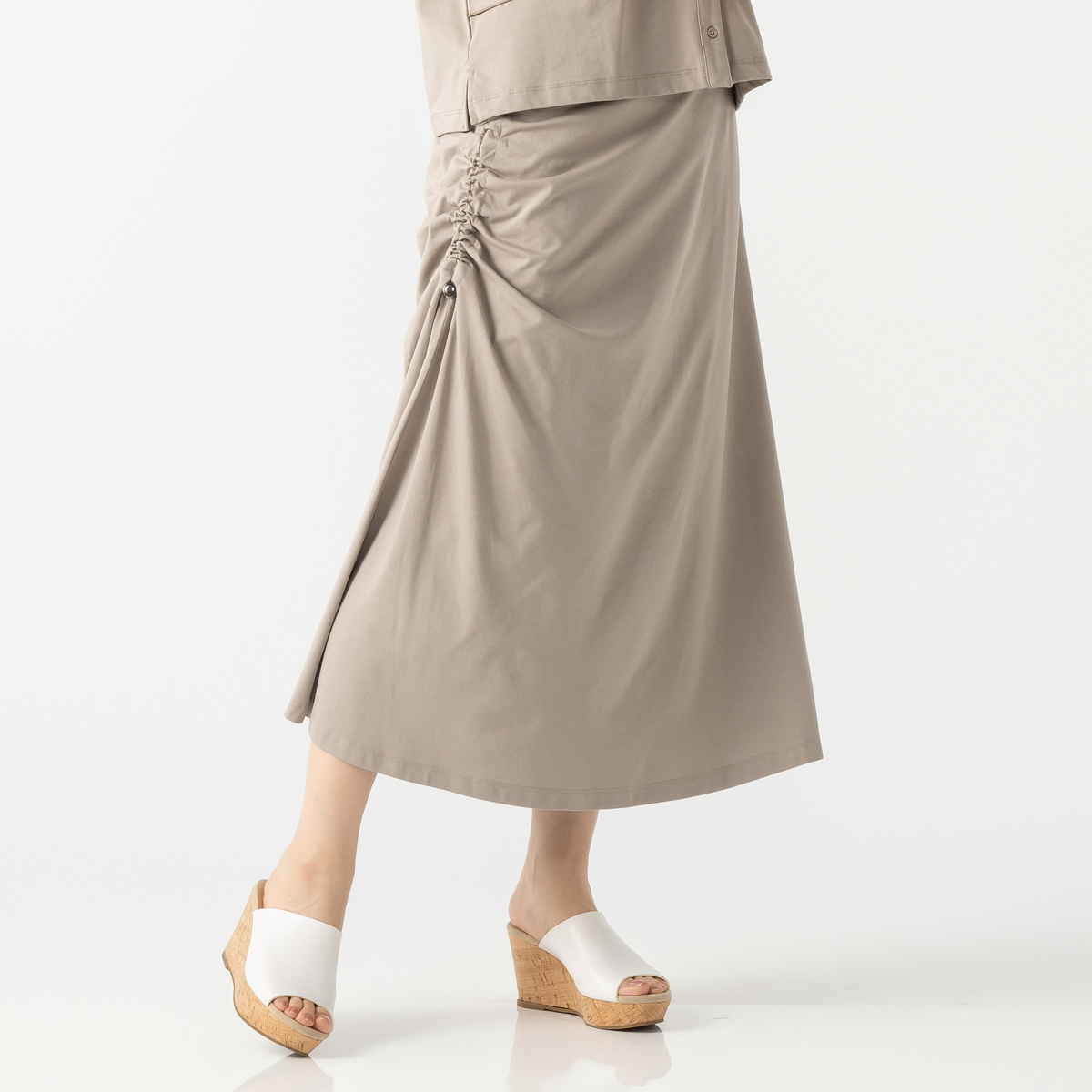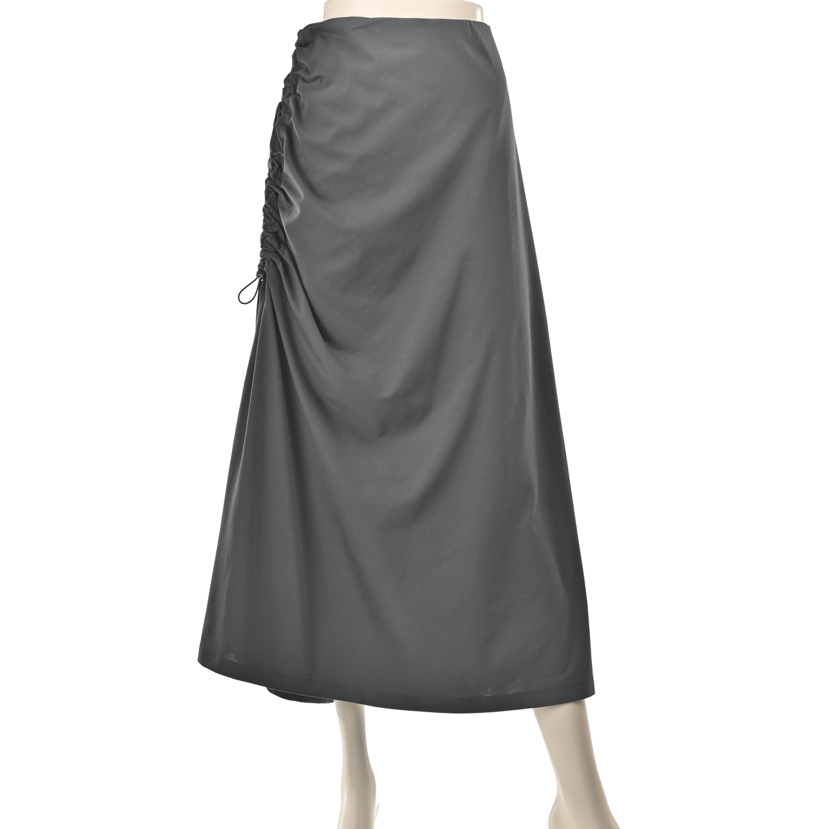 エニワイズ加工により繊維中の油脂分でしっとりなめらかな風合いに仕上げたセミフレアスカート。ストッパー付きドローストリングでギャザーとスリットの深さを調整できるデザインです。ウエストは総ゴムのプルオン仕様で、体のラインを拾いにくいです