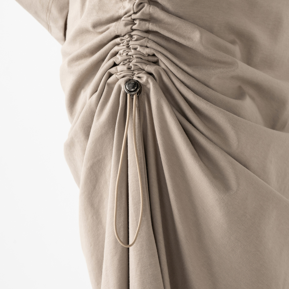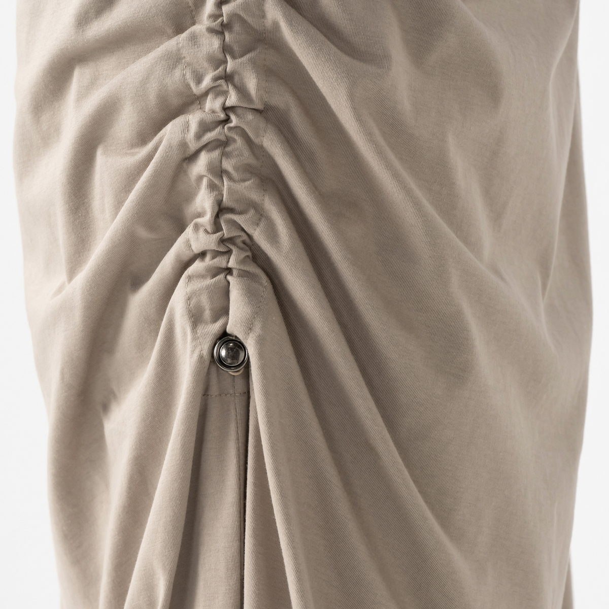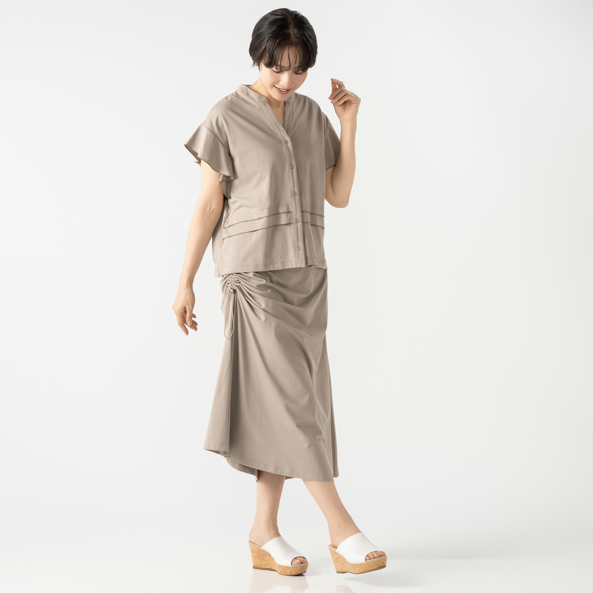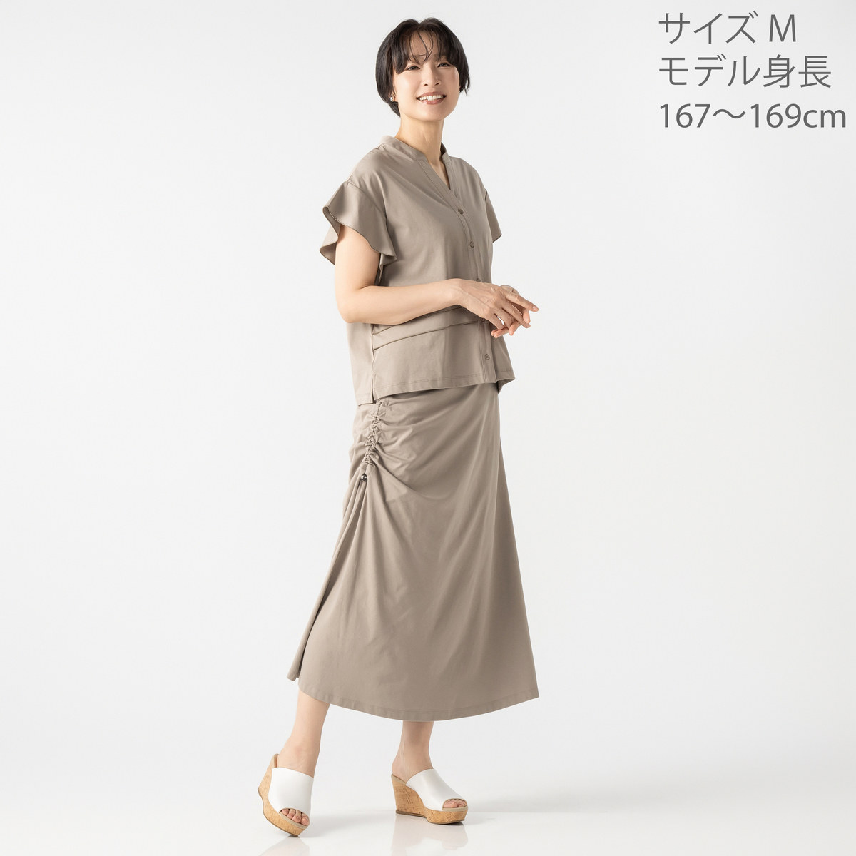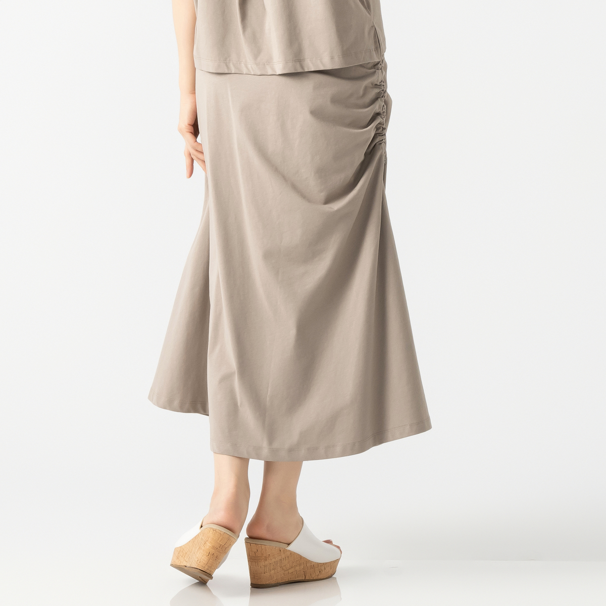 エニワイズ加工により繊維中の油脂分でしっとりなめらかな風合いに仕上げたセミフレアスカート。ストッパー付きドローストリングでギャザーとスリットの深さを調整できるデザインです。ウエストは総ゴムのプルオン仕様で、体のラインを拾いにくいです