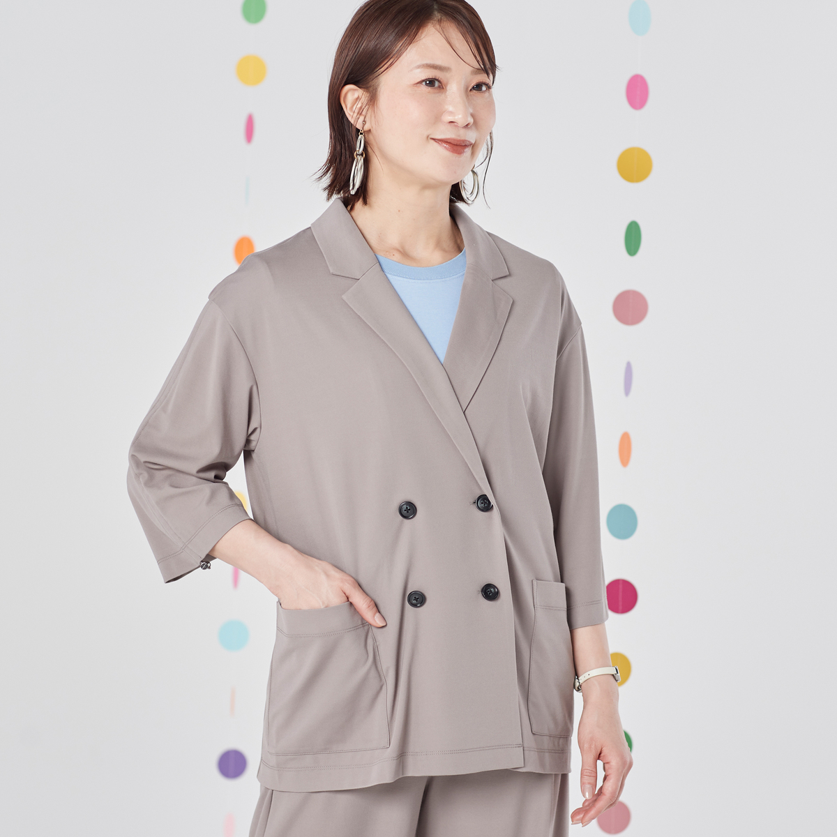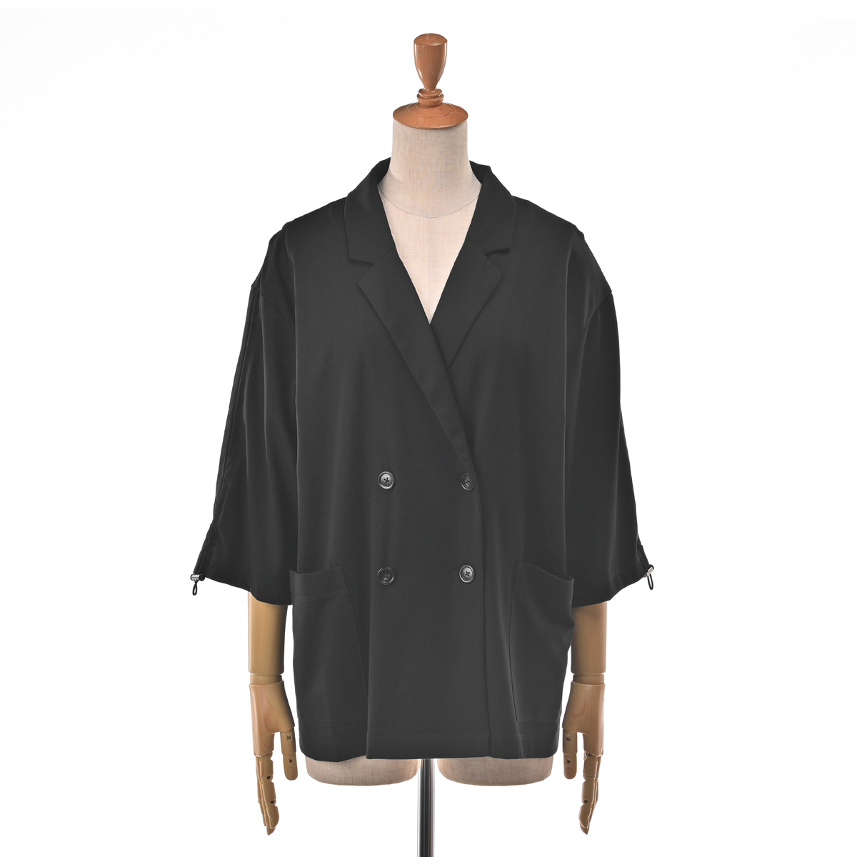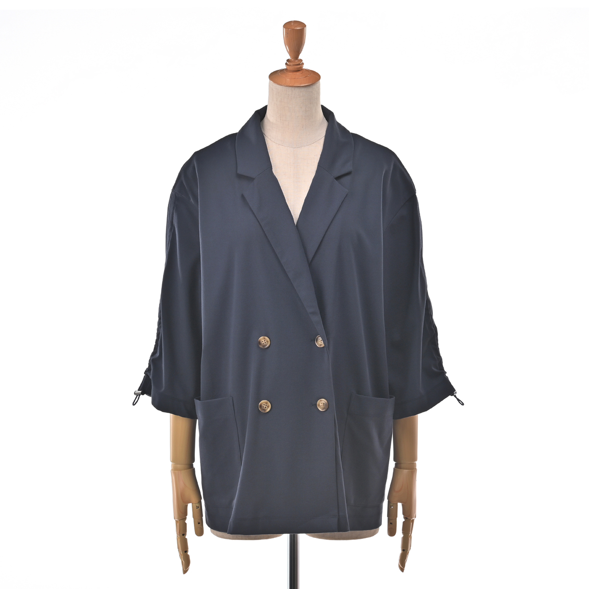しっとりなめらかなエニワイズ加工を施した、七分袖のダブルテーラードジャケットです。透けにくい中肉生地を採用しました