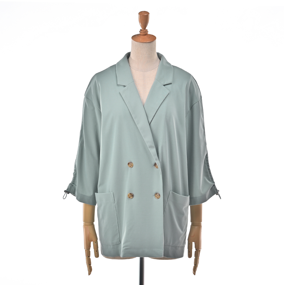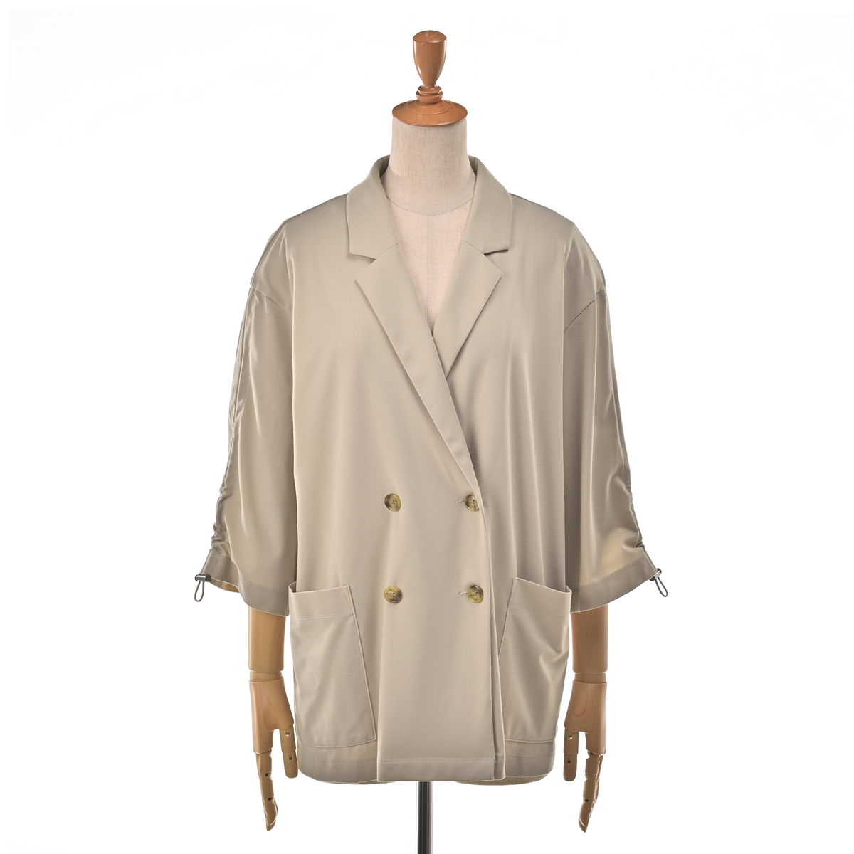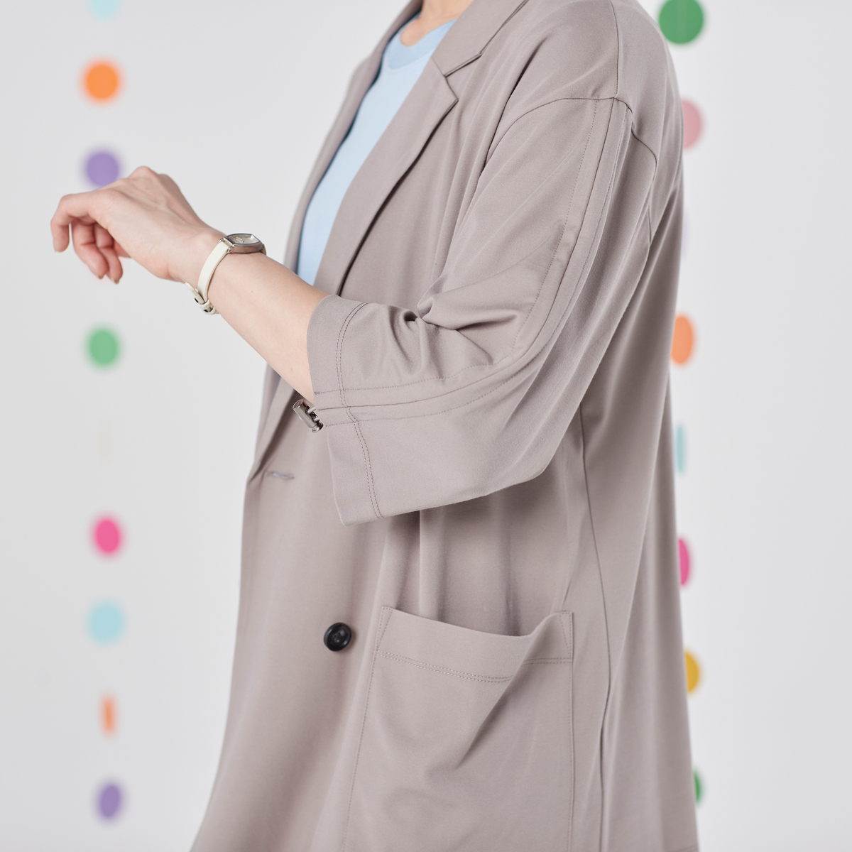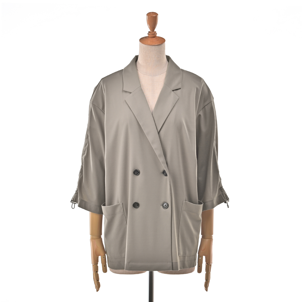 しっとりなめらかなエニワイズ加工を施した、七分袖のダブルテーラードジャケットです。透けにくい中肉生地を採用しました
