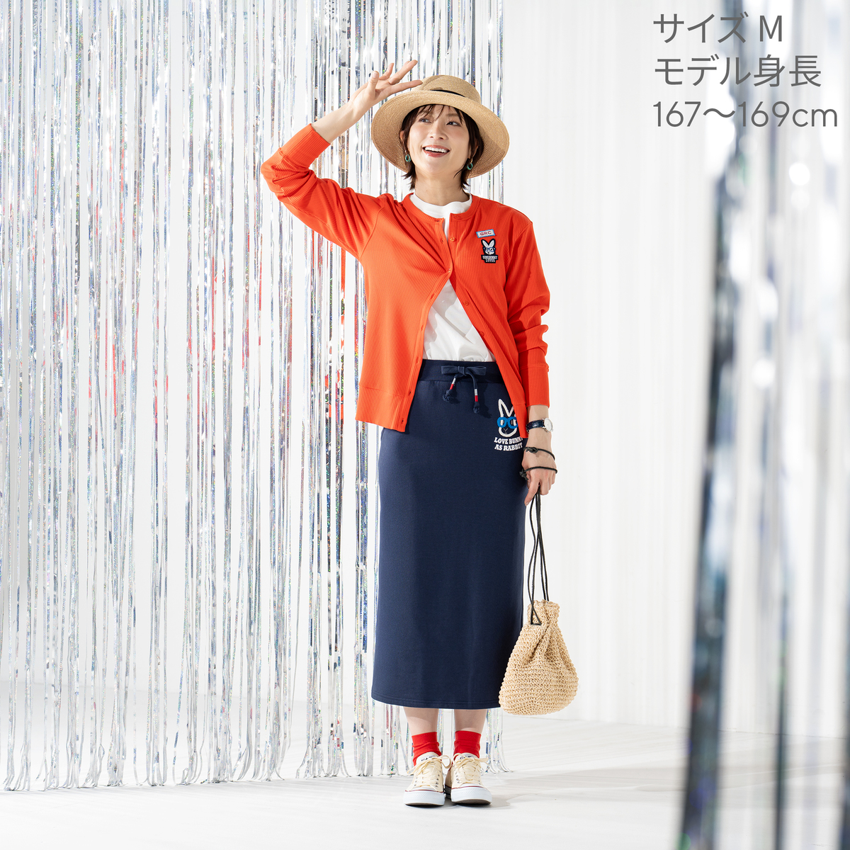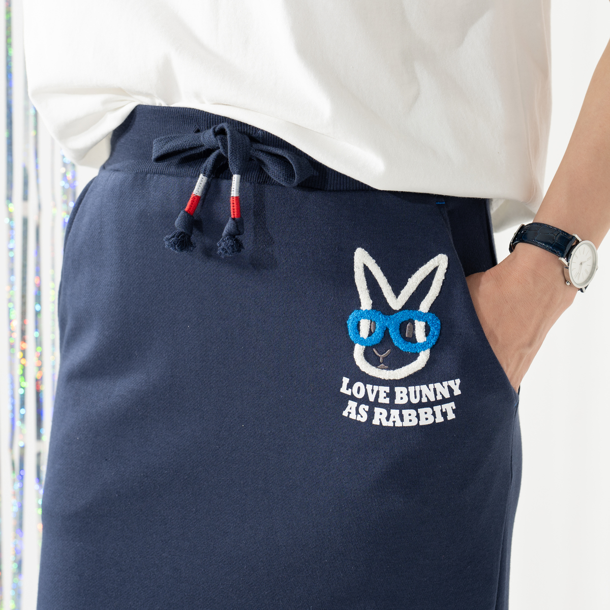 裾にかけてややタイトになるナローシルエット。Asrabbit(エーズラビット)のオリジナルキャラクター、ウサギちゃんの大きなさがら刺繍がポイントです
