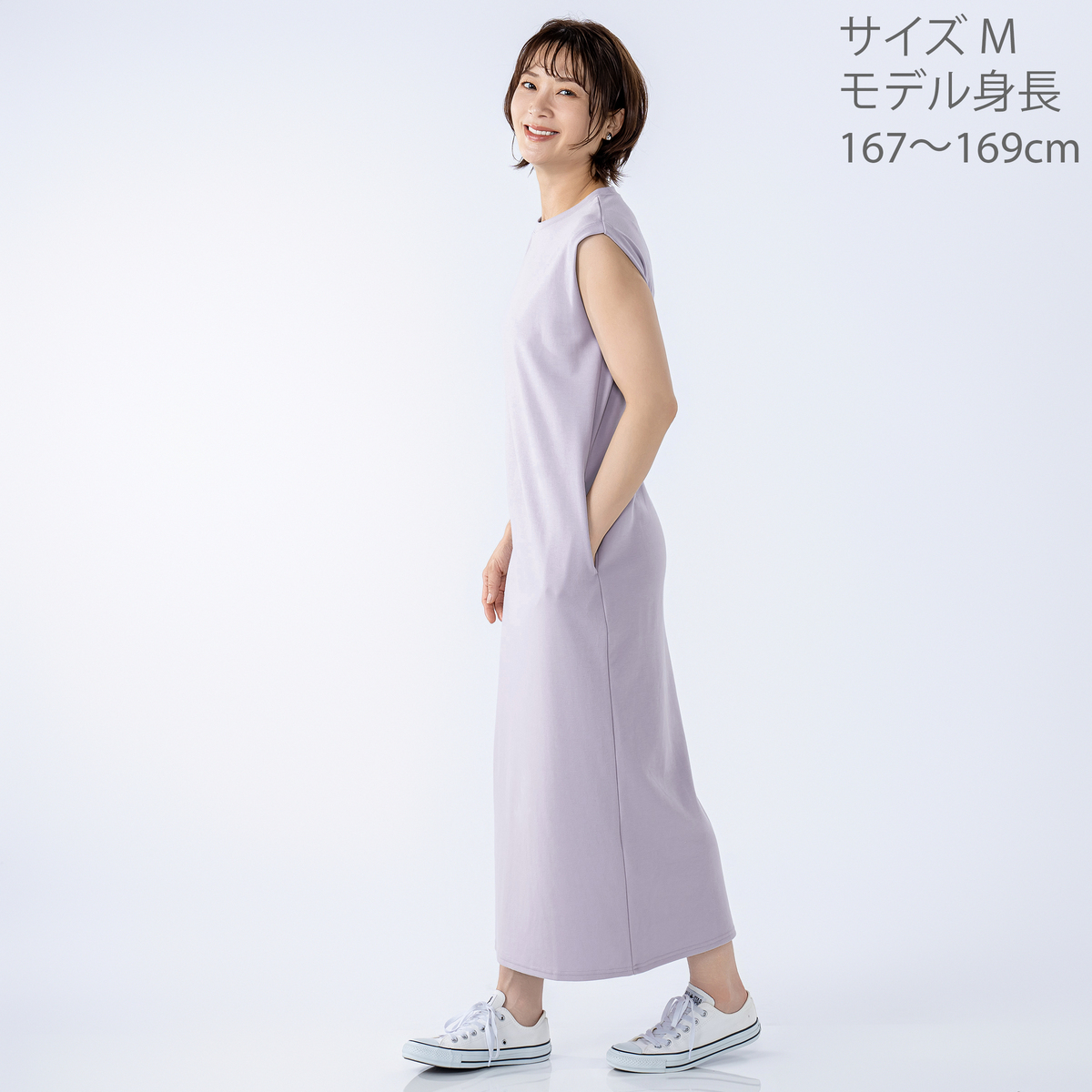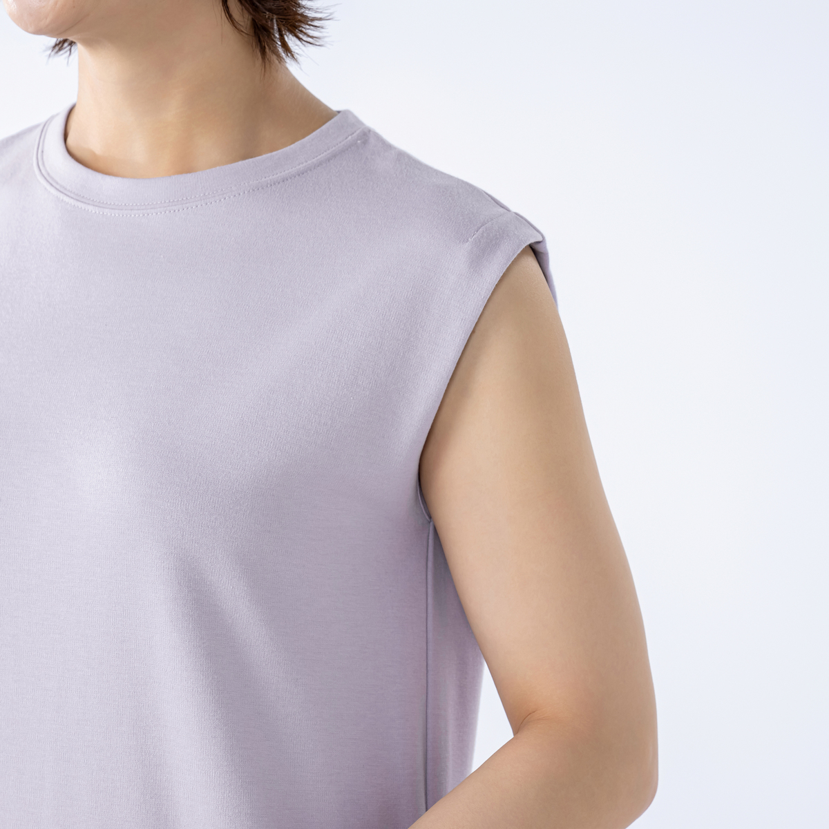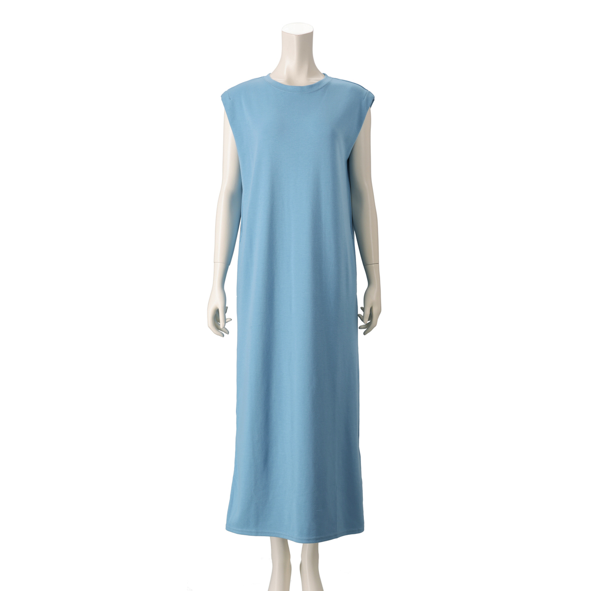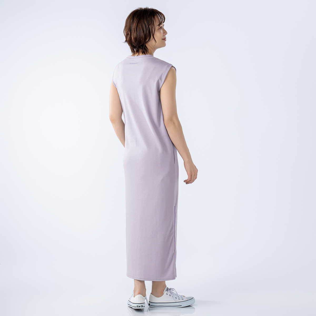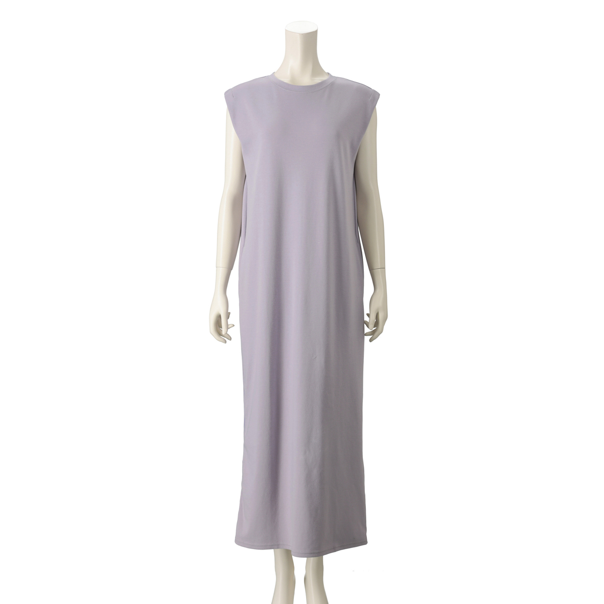 1枚着るだけでさまになるノースリーブワンピース。フレンチスリーブのような肩先のタックと、右脇裾にあしらったファスナーがポイントです