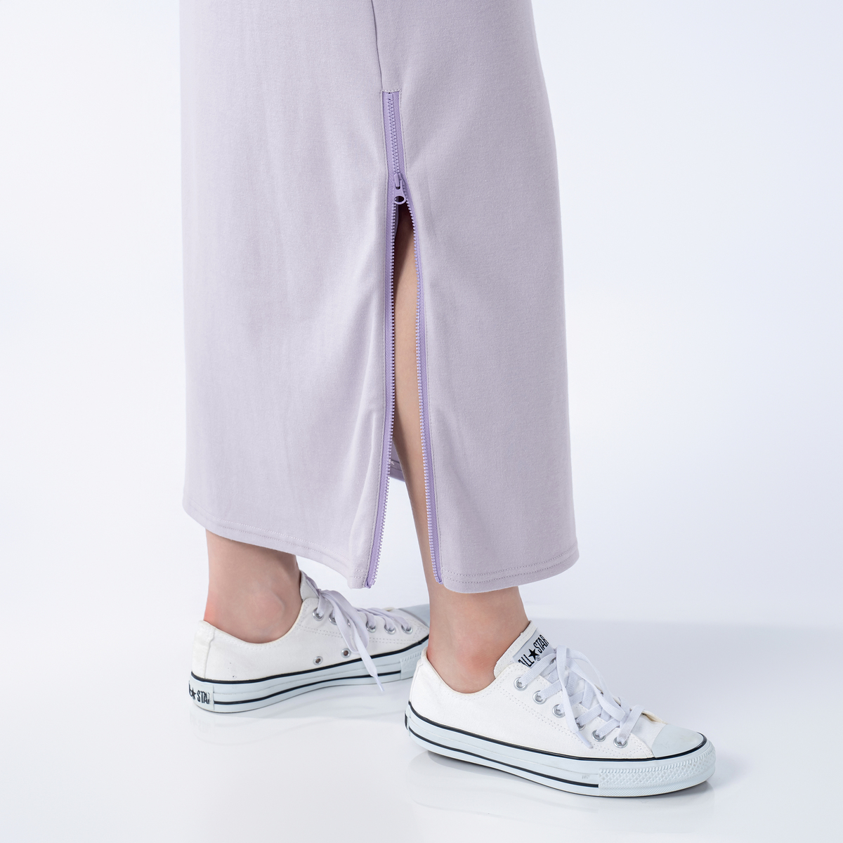 Iラインに近いシルエットで縦のラインを強調。パンツやレギンスを重ねて裾のファスナーを開いたスタイリングもおすすめです