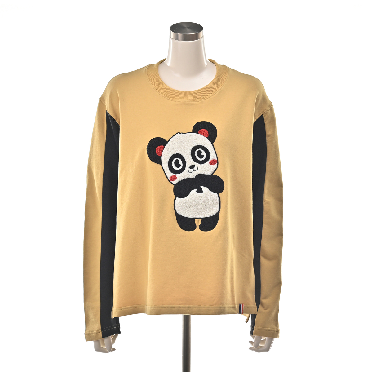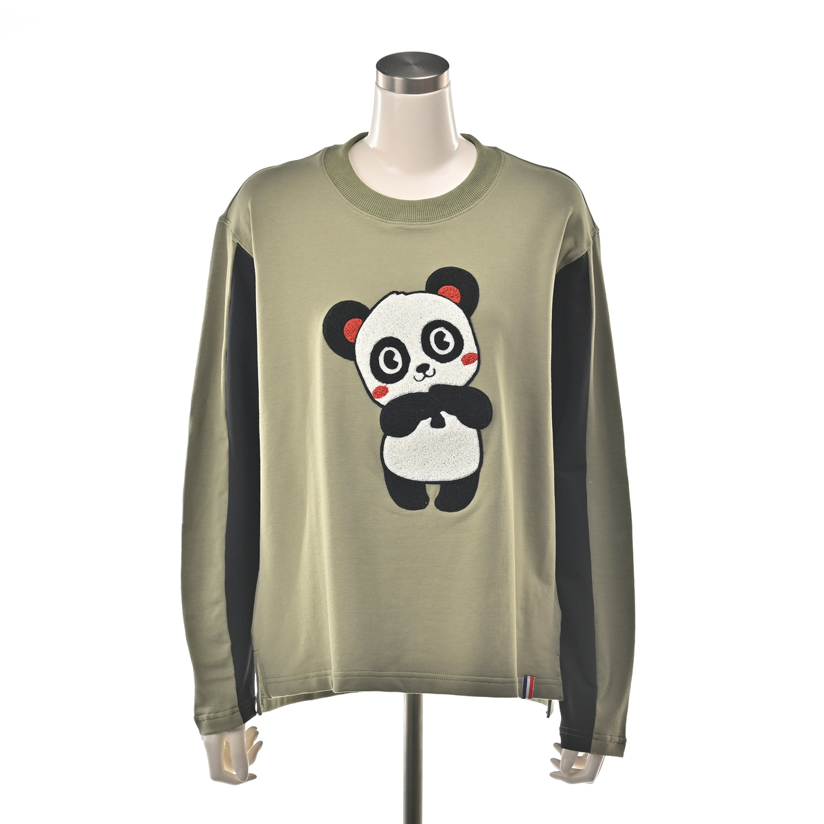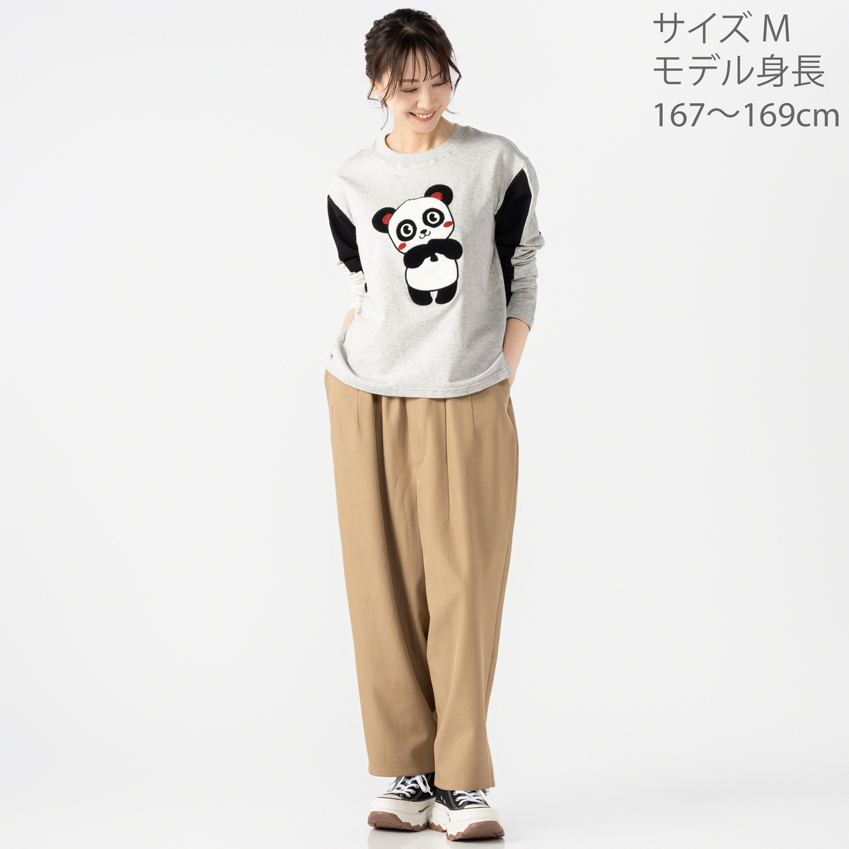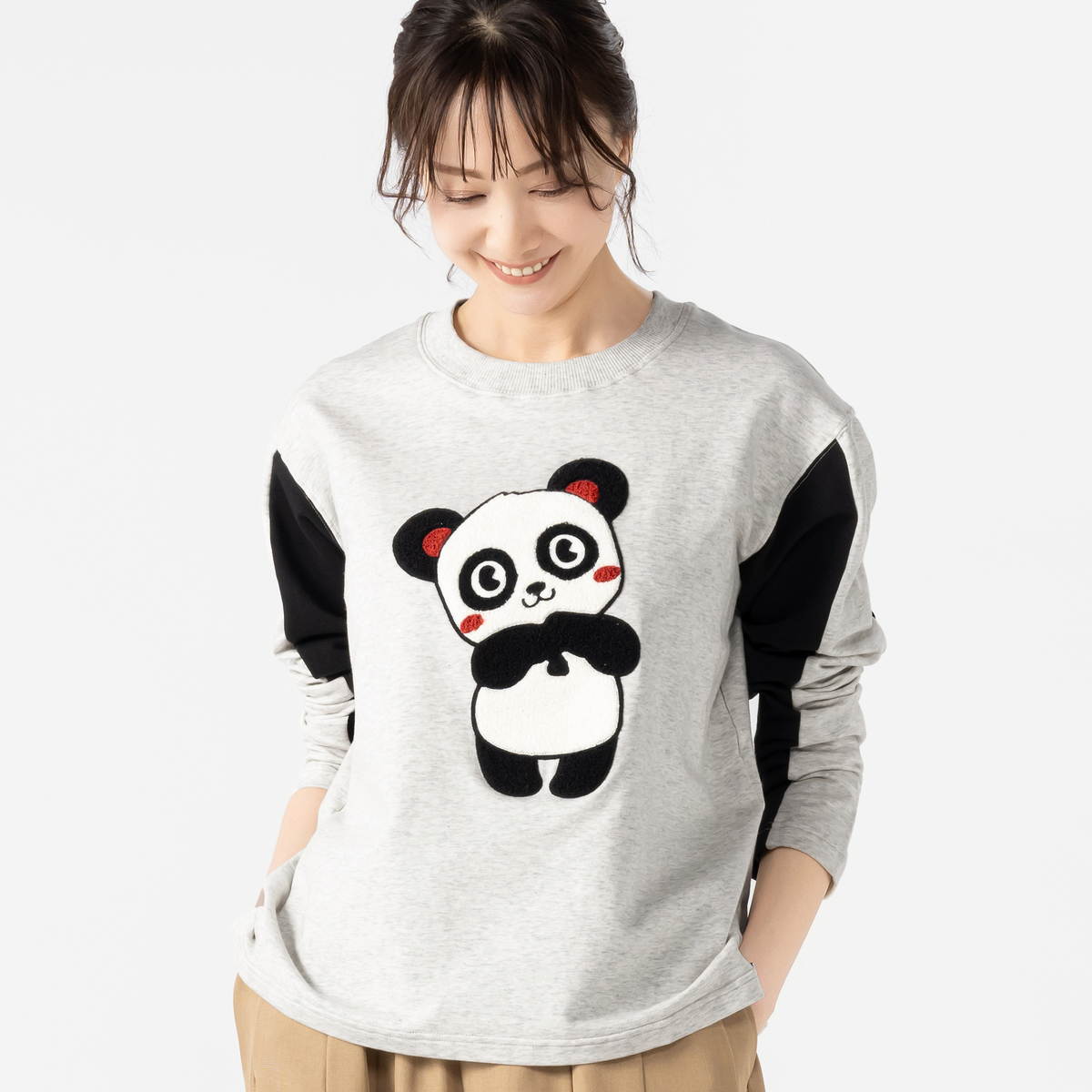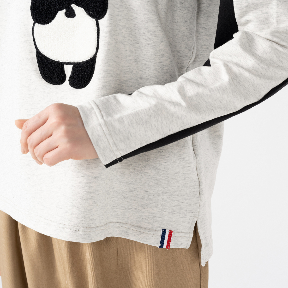 配色袖がポイントのパンダ刺繍トップス。胸元にふっくらとしたサガラ刺繍をあしらい、袖は半分だけ配色にして軽快な印象に仕上げています。遊び心を添えつつもスタイリッシュにまとまり、気負わず取り入れられる一枚です