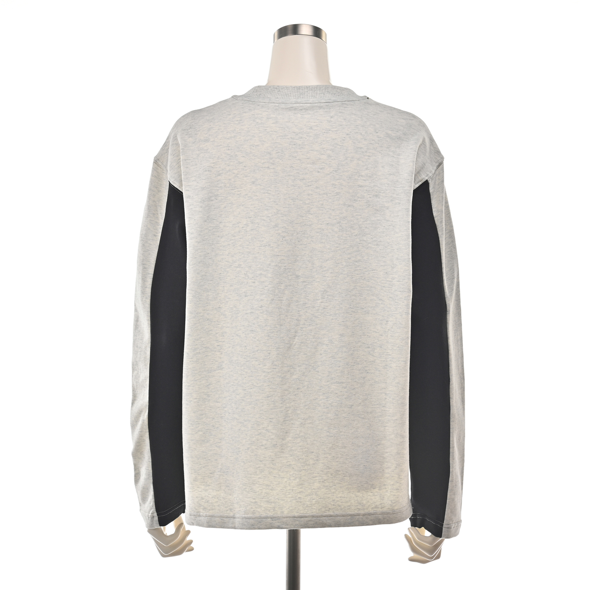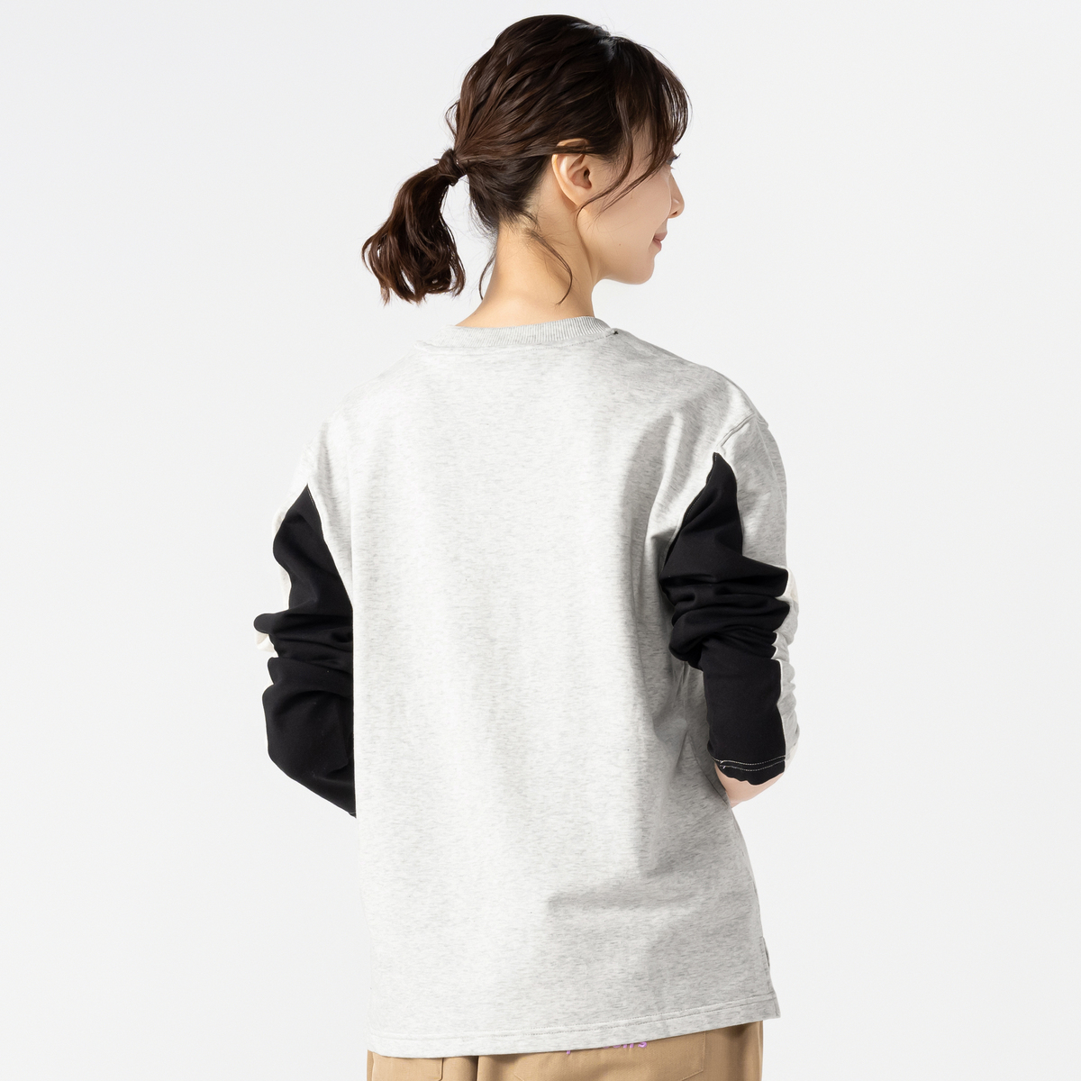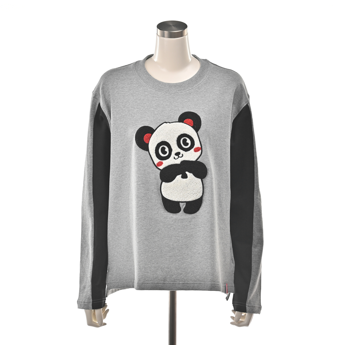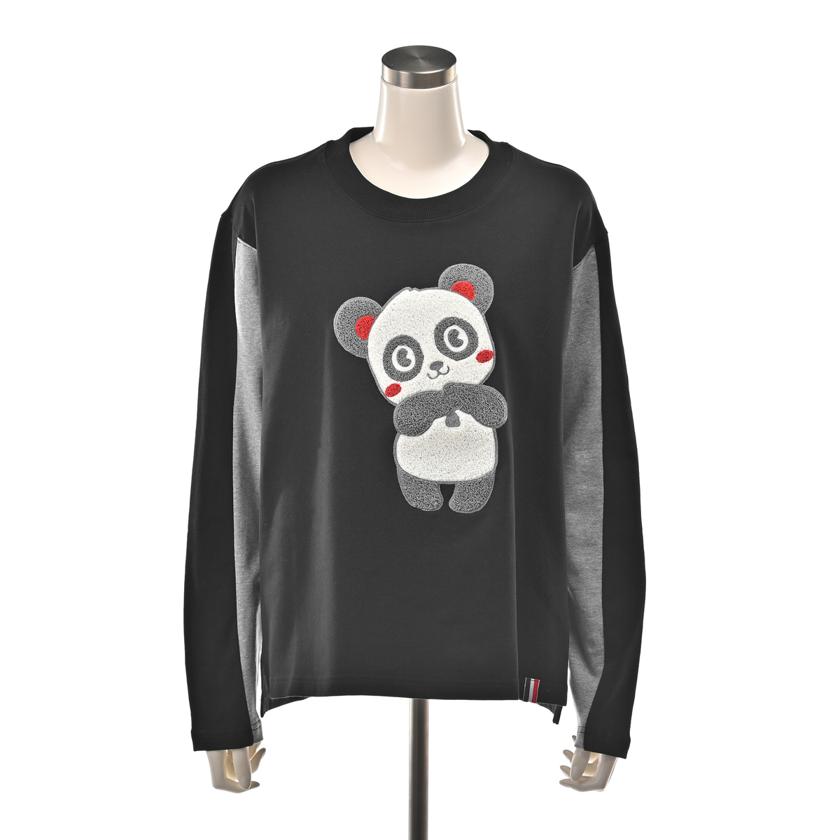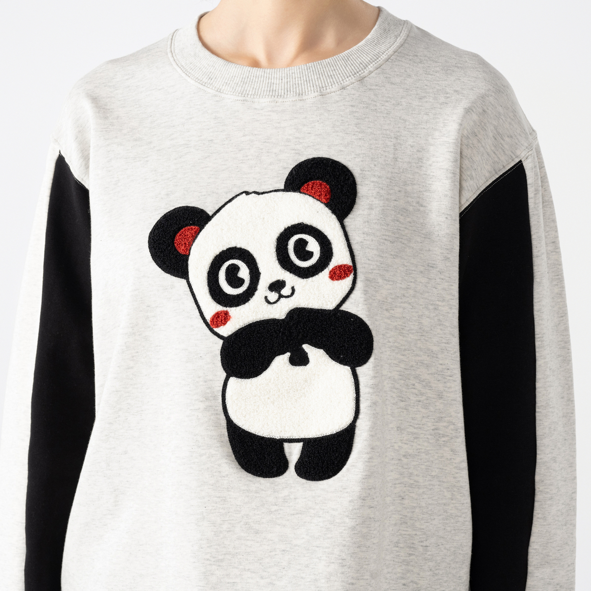 配色袖がポイントのパンダ刺繍トップス。胸元にふっくらとしたサガラ刺繍をあしらい、袖は半分だけ配色にして軽快な印象に仕上げています。遊び心を添えつつもスタイリッシュにまとまり、気負わず取り入れられる一枚です