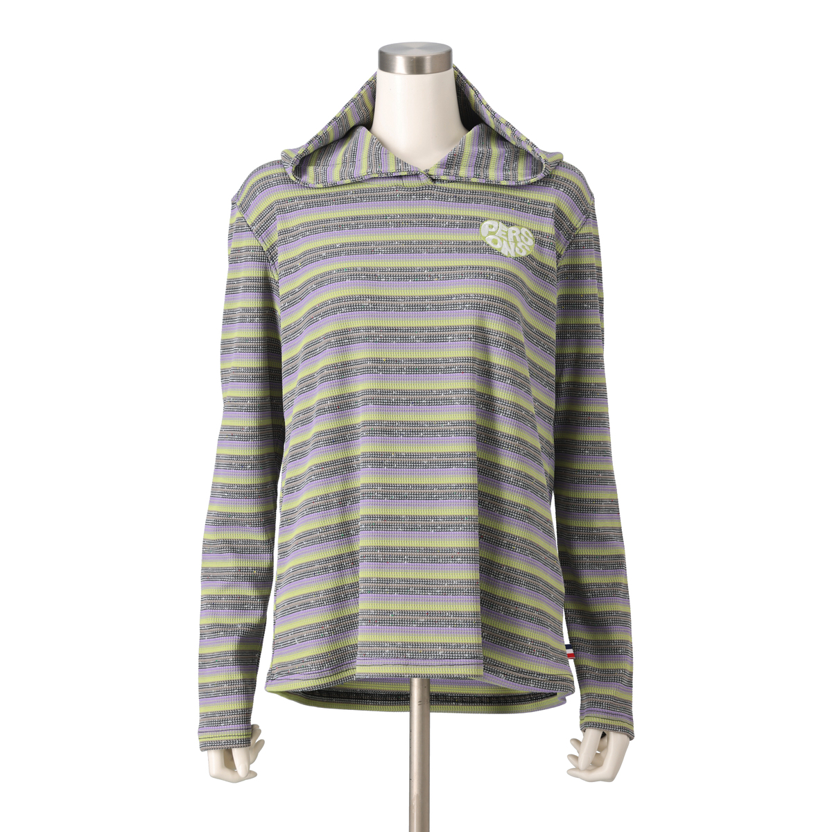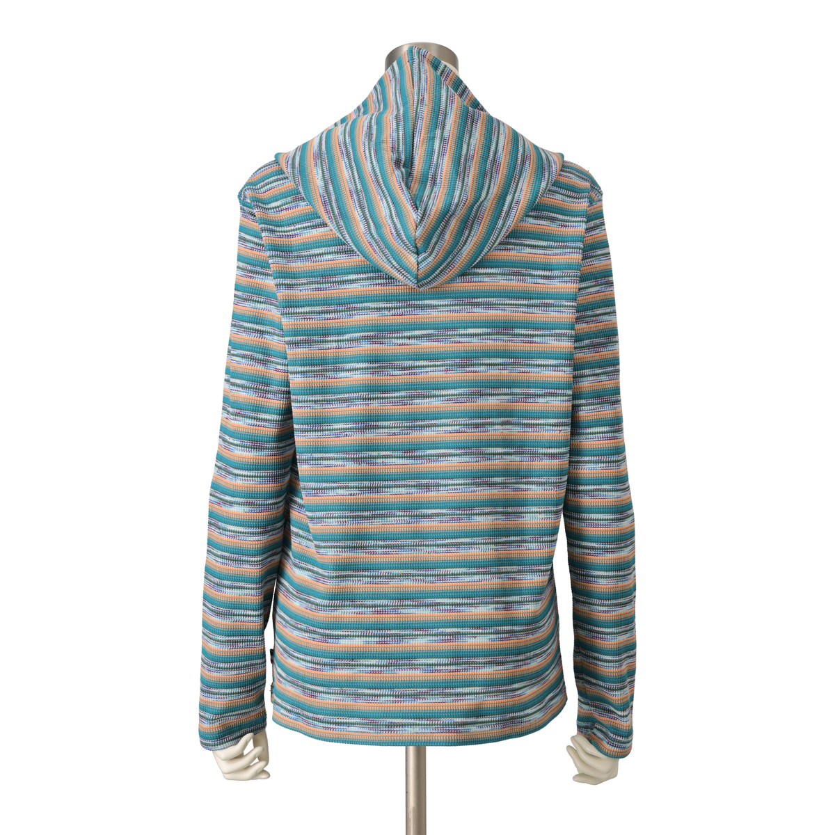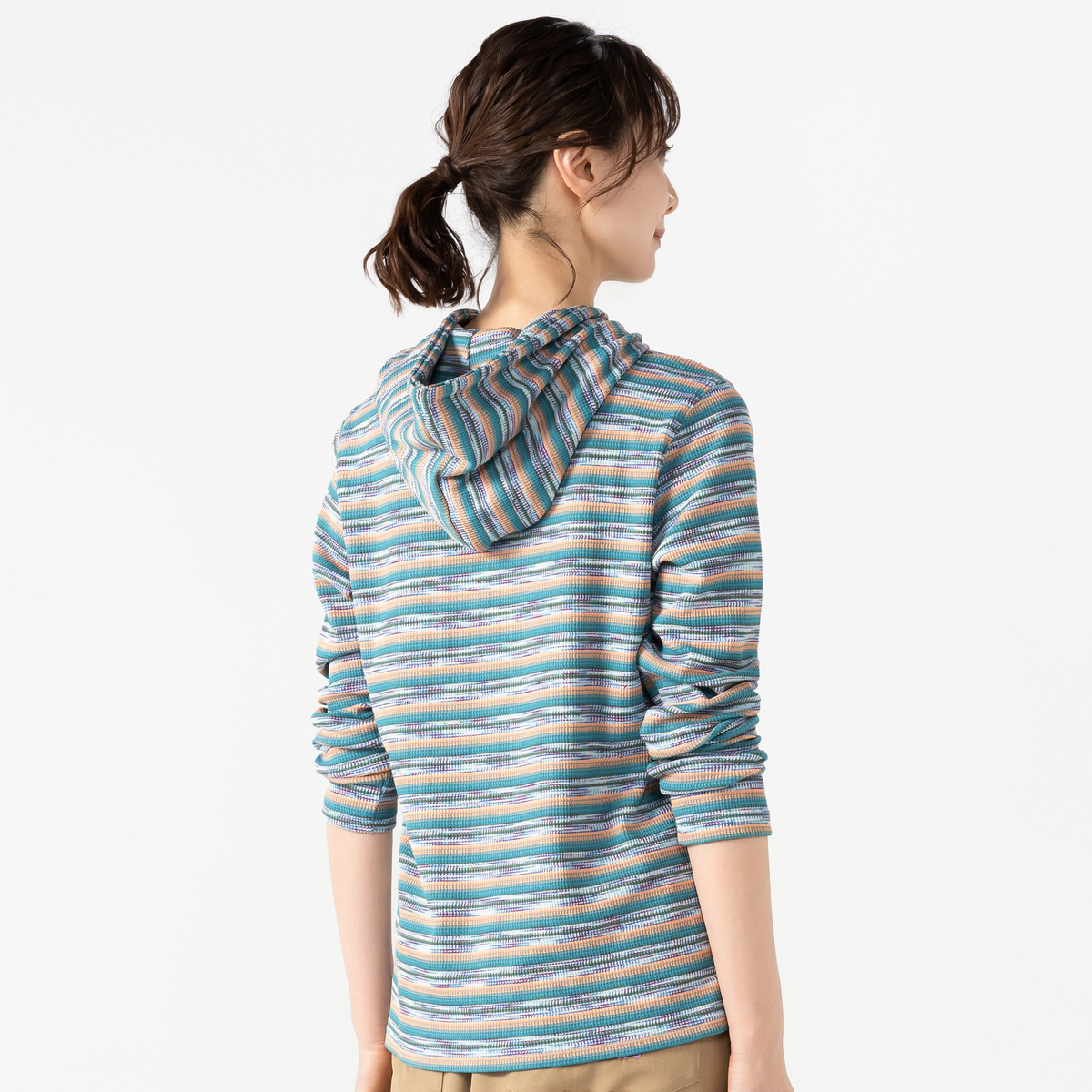 テレコ素材の多色ボーダー柄が目を引くパーカーです。フード付きで、重ね着すると鮮やかなカラーが映えます