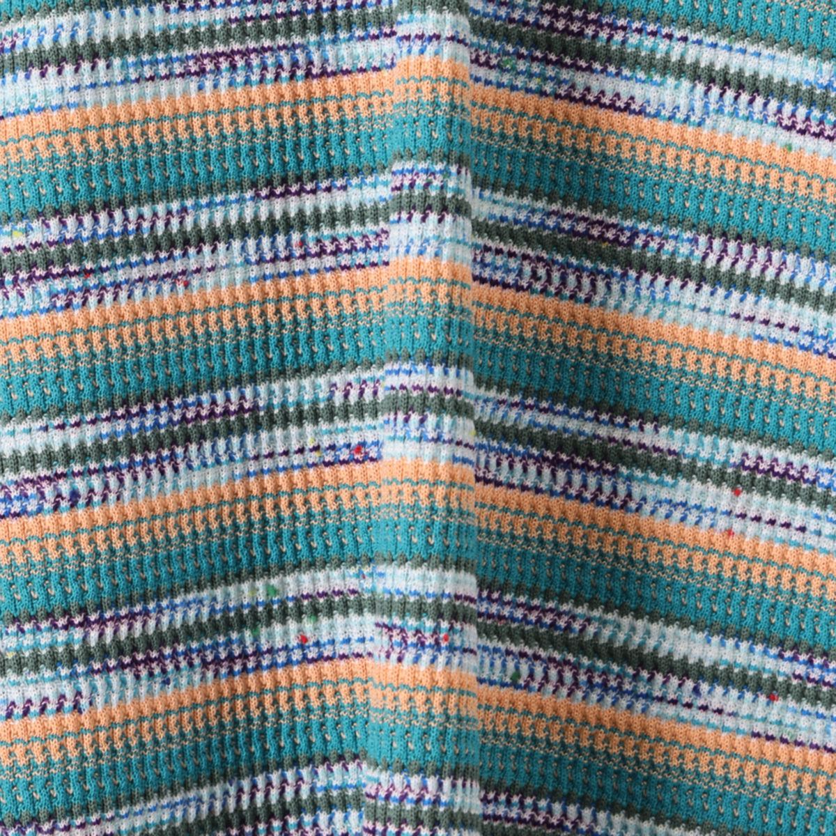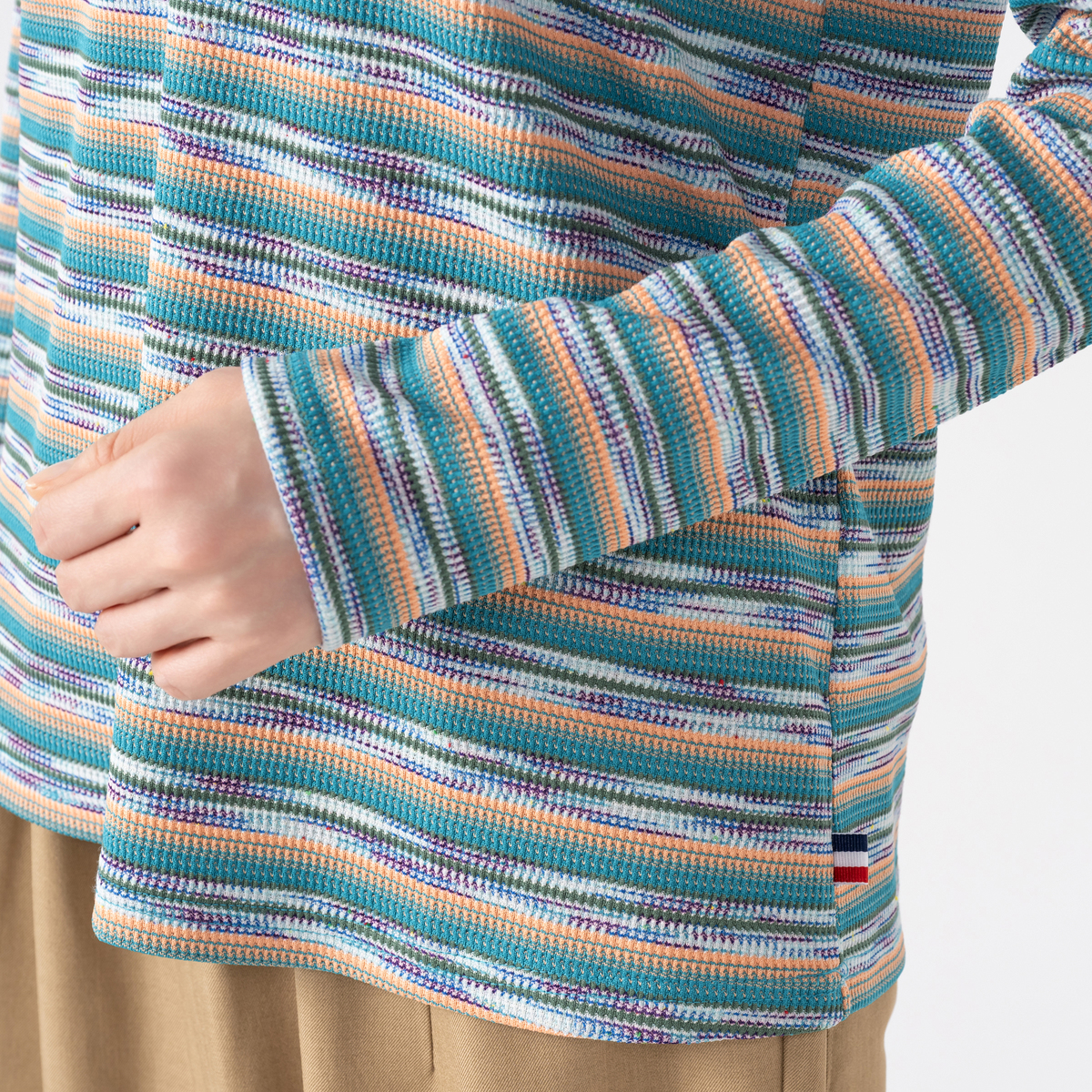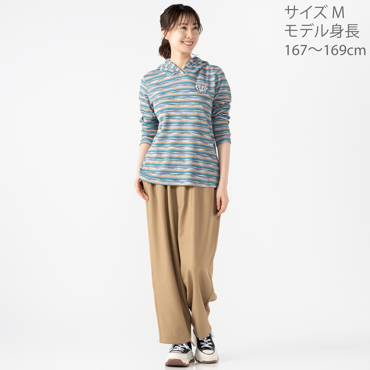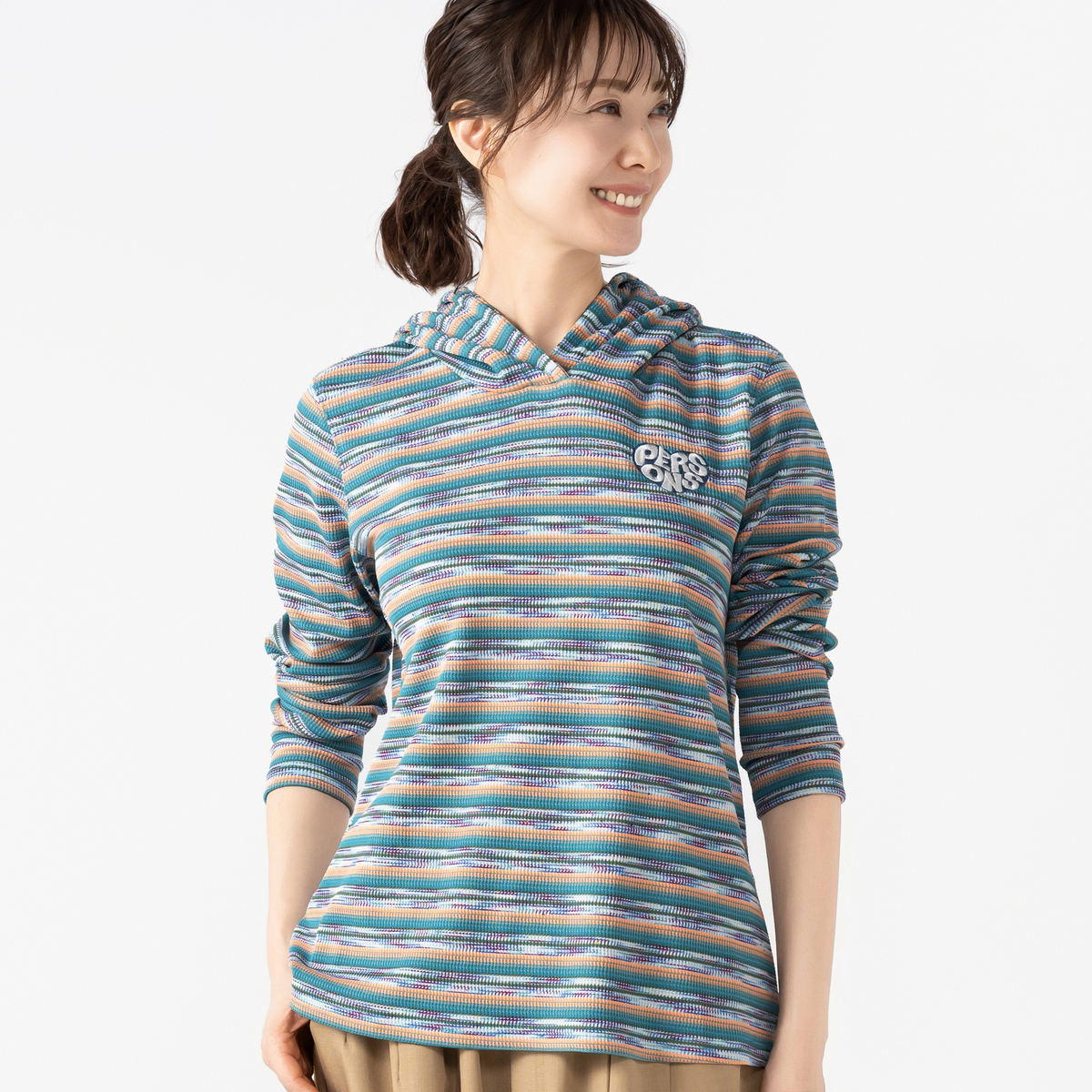 テレコ素材の多色ボーダー柄が目を引くパーカーです。フード付きで、重ね着すると鮮やかなカラーが映えます