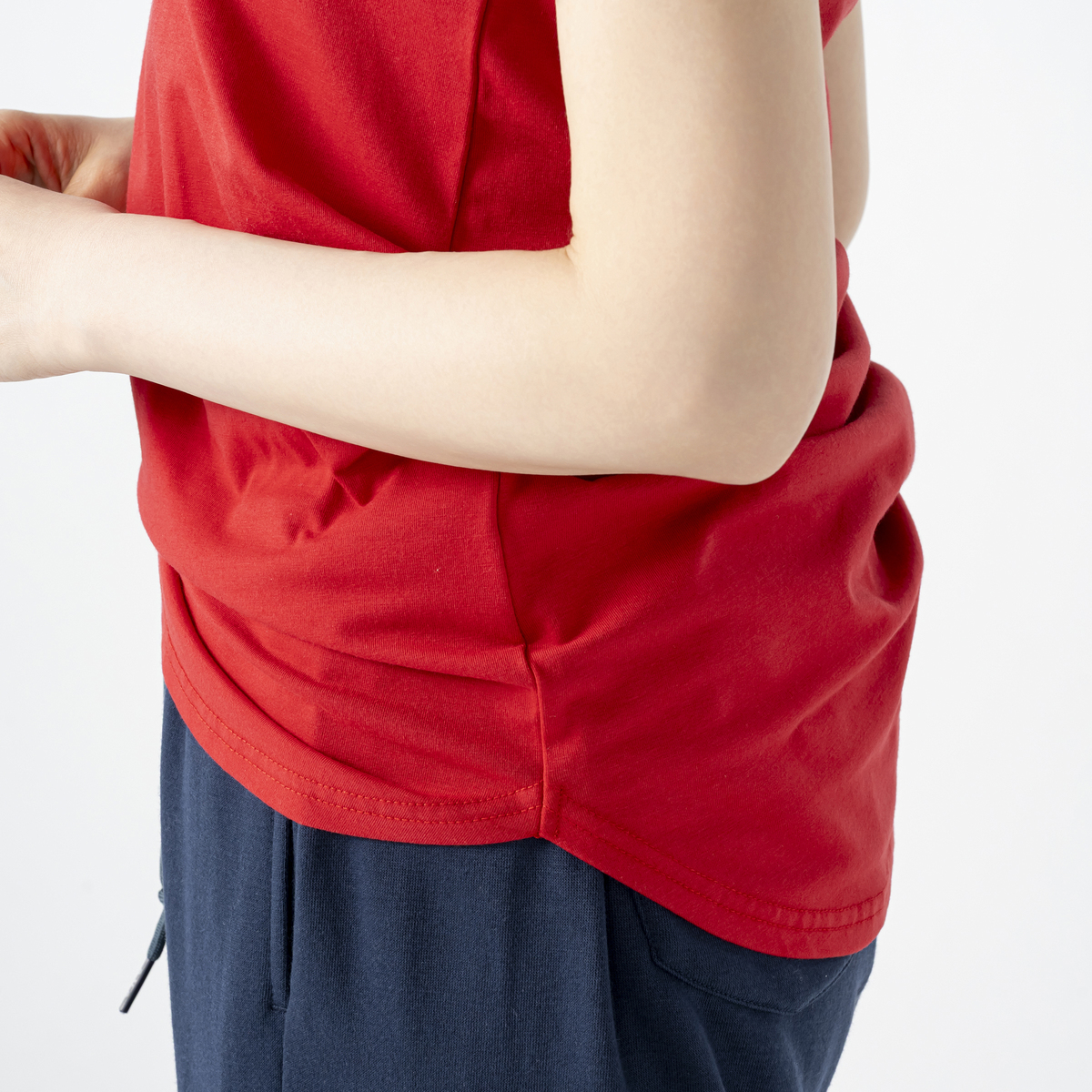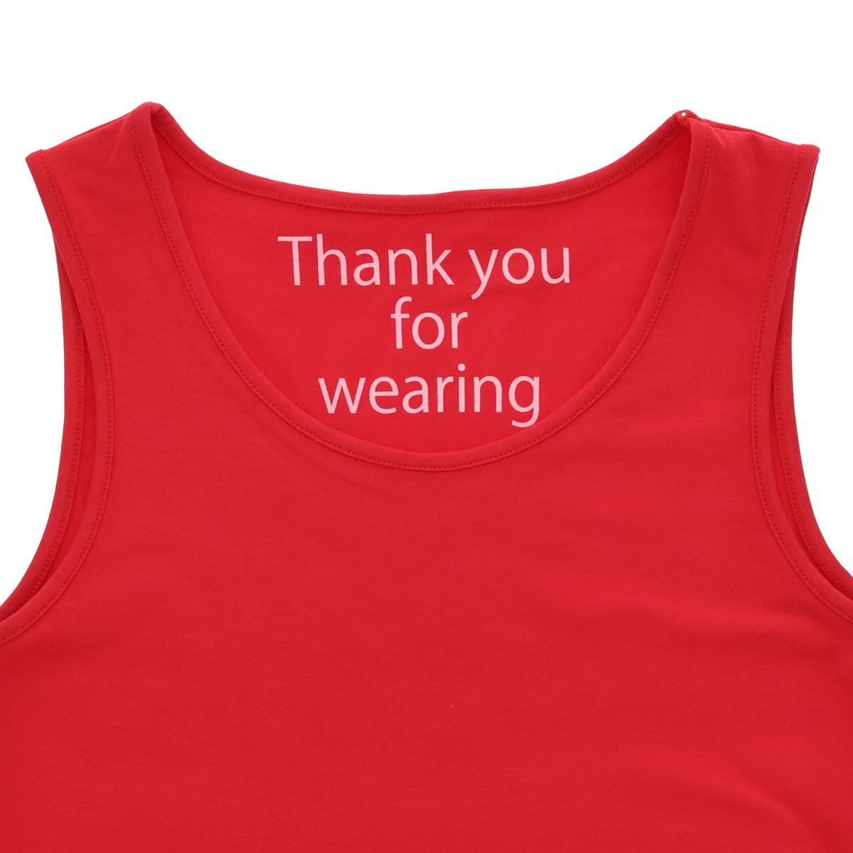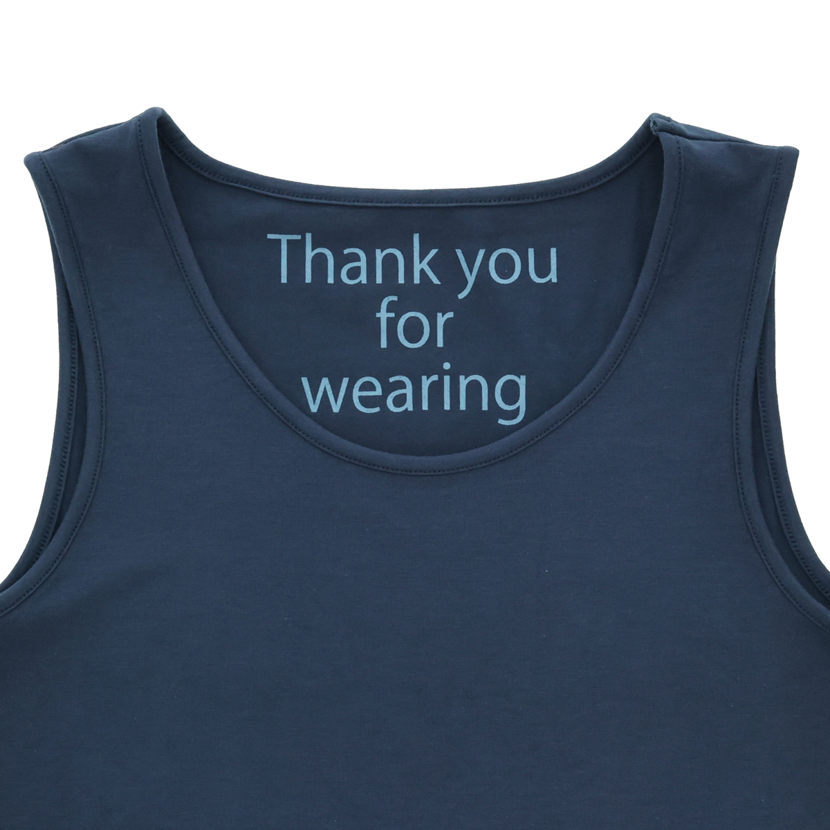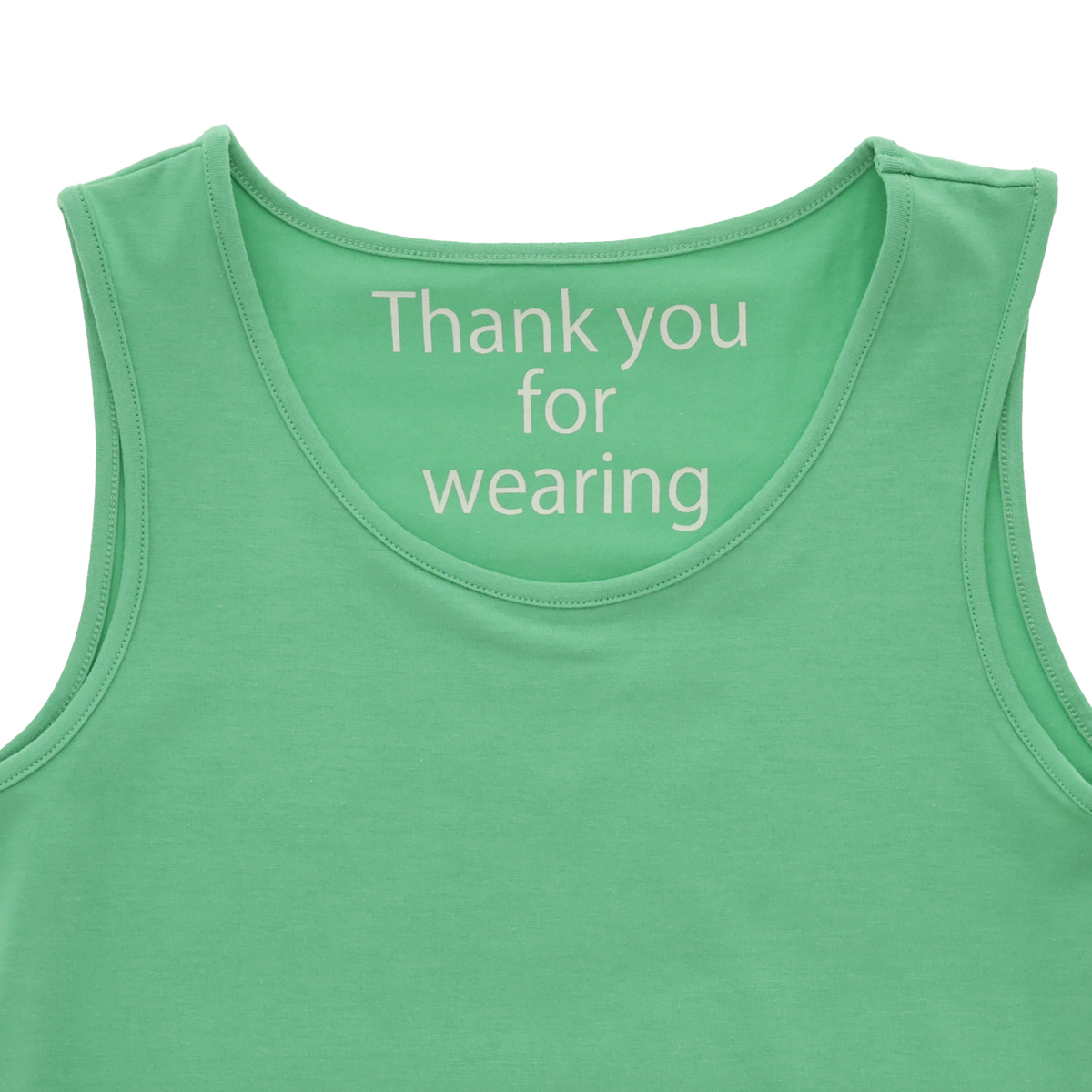ネック裏の「Thank you for wearing」のメッセージが、毎日の装いにあたたかみを添えるデザイン。ショート丈トップスやカーディガンともマッチし、様々なコーディネートを楽しめます
