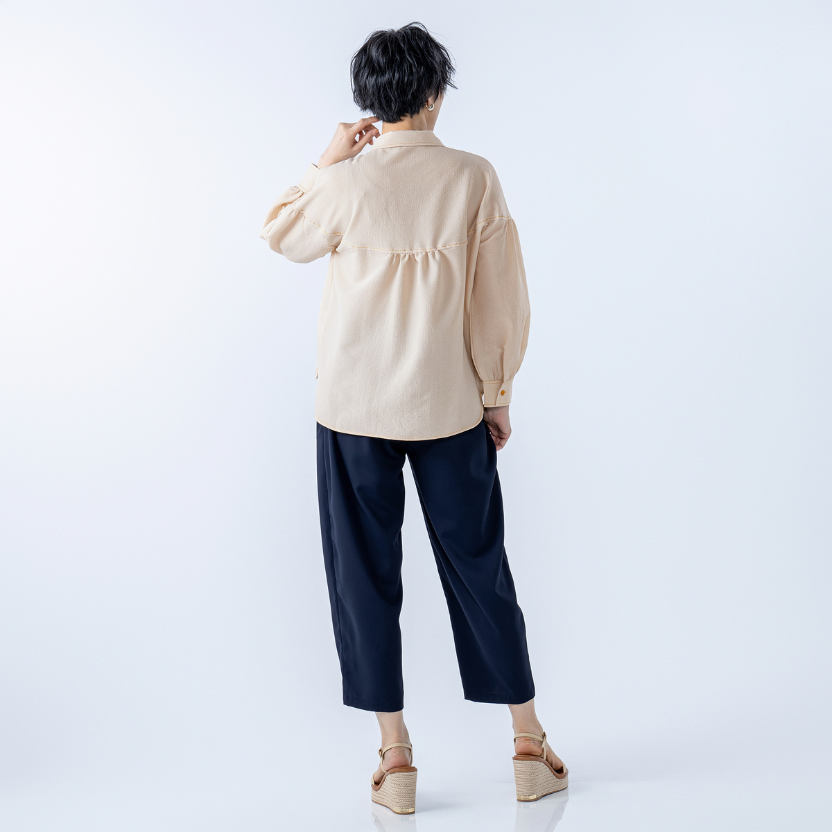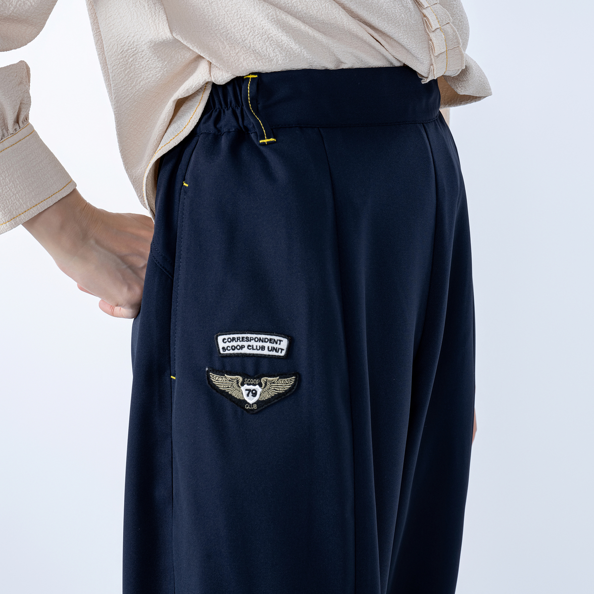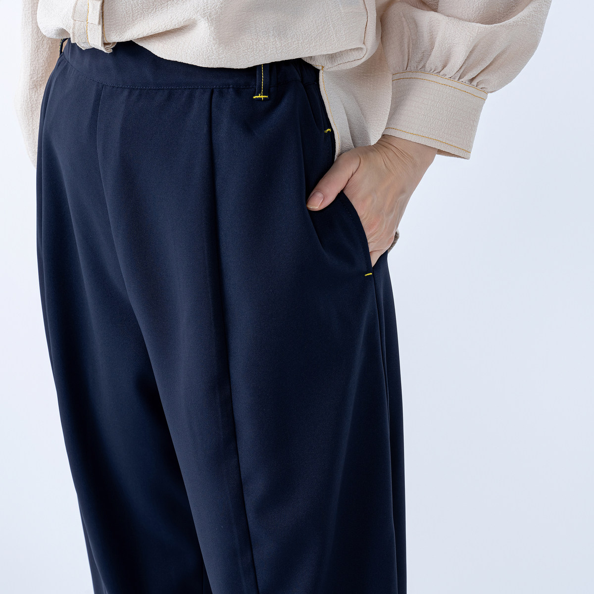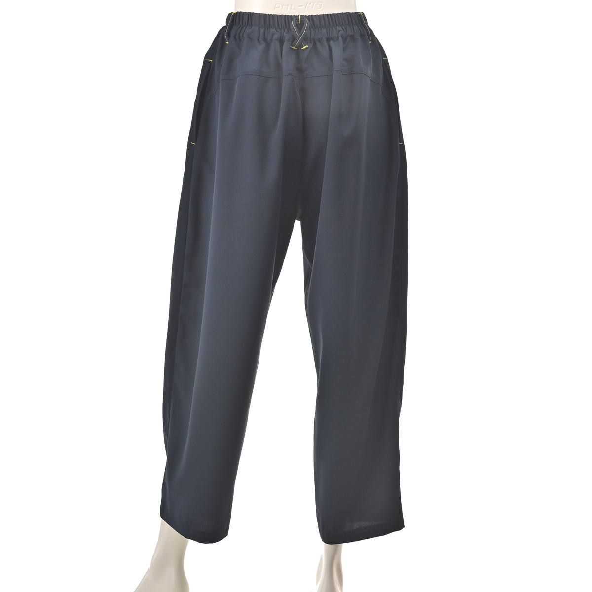 立体裁断によるコクーンシルエットのパンツです。計算された切り替えや深めの股上が気になる腰まわりをやさしく包み、スタイルアップを狙いつつ、リラックス感のある穿き心地。イエローステッチがさりげなく個性を引き立てます