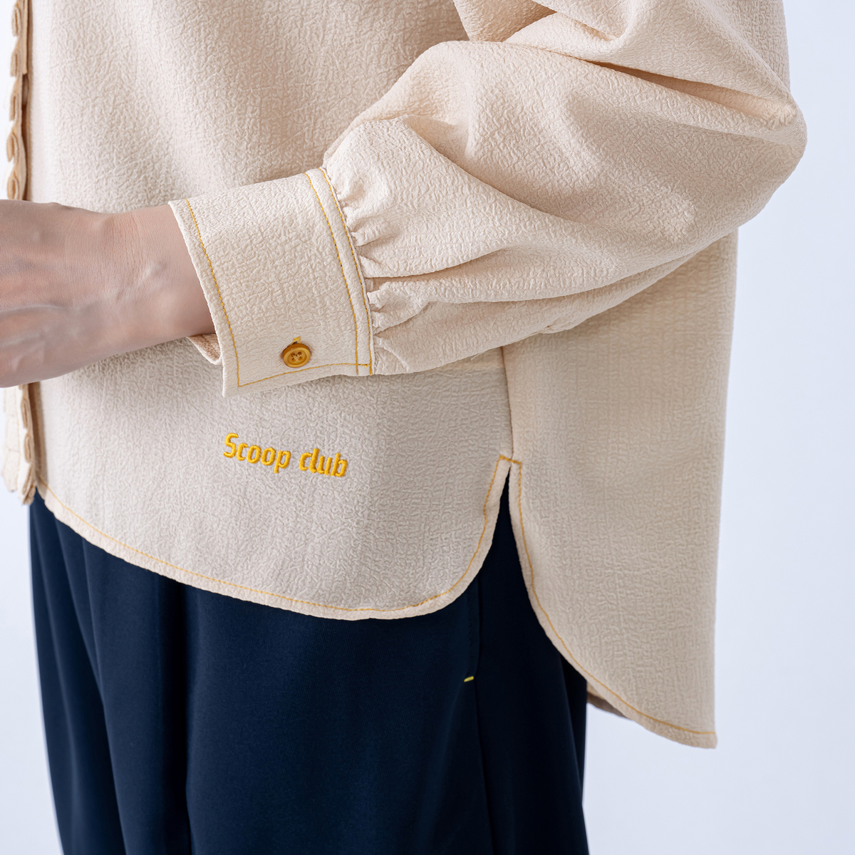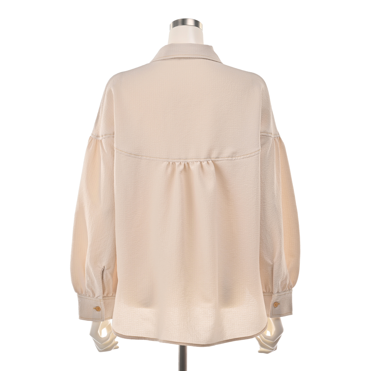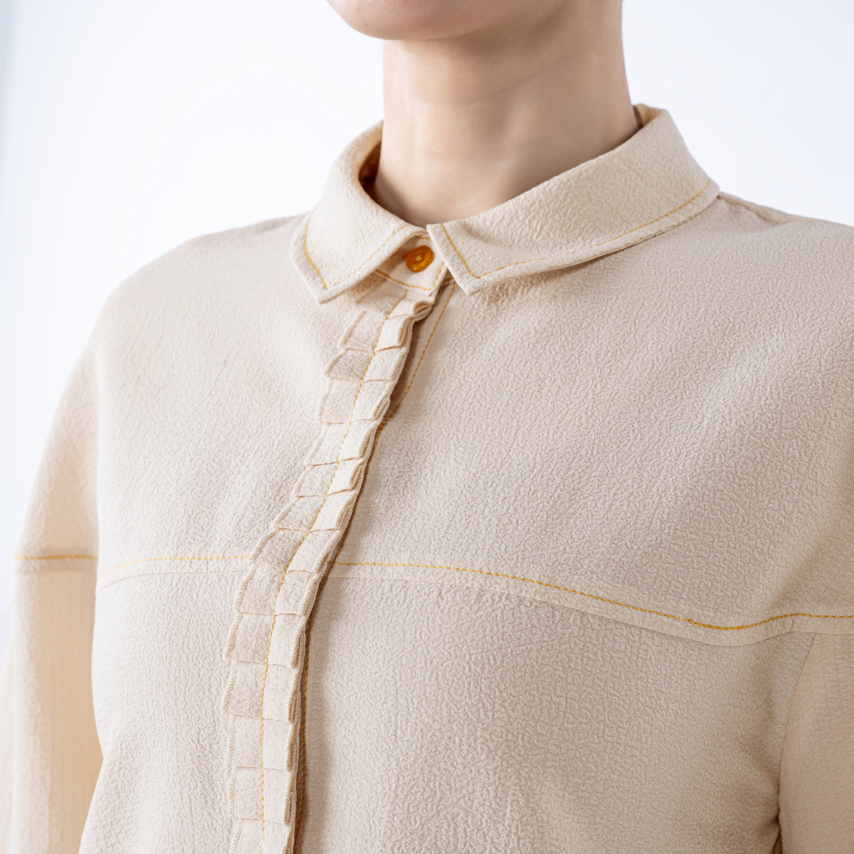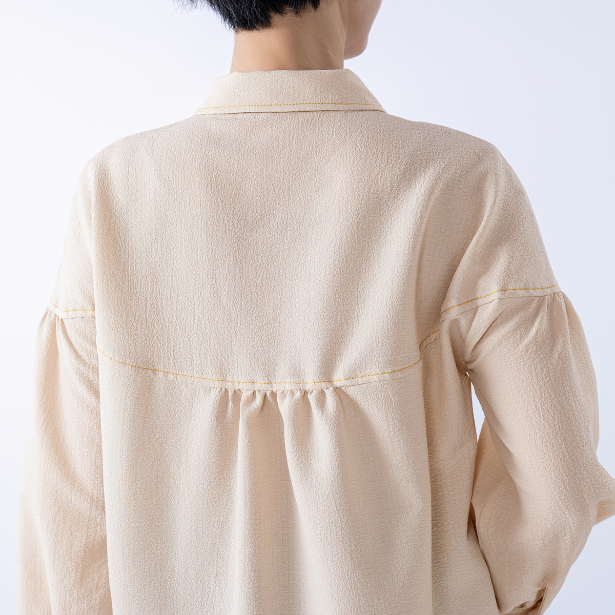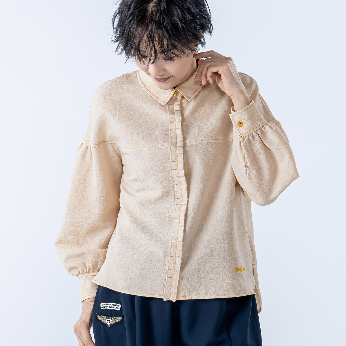 小さめの衿が品のよさを引き立てるデザイン。前中心は手作業で施したプリーツ仕様で、第一ボタン下はプリーツに隠れたスナップ留め。配色のボタンやステッチがさりげないアクセントに。ラウンドヨークとギャザー袖、前後差のある着丈で、スカートにもパンツにも合わせやすいバランスです