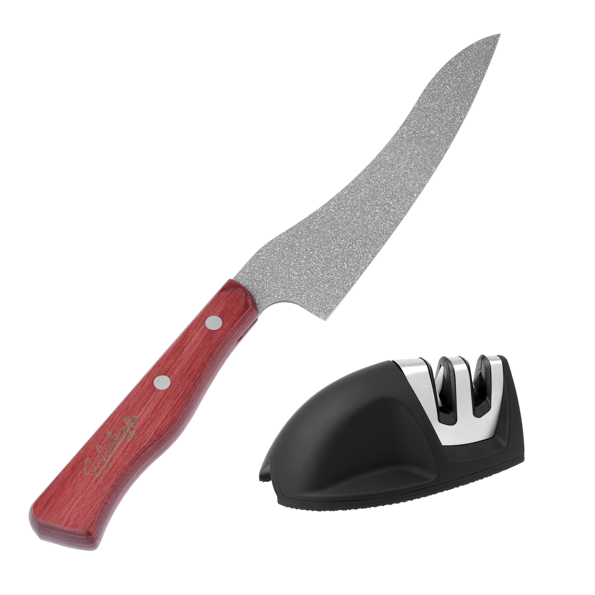 握りやすいソフトグリップで研ぎやすく、底面には滑りにくいラバー素材を採用。「城咲仁のSコーティング包丁」向けの包丁シャープナーです(シャープナー自体は城咲氏監修ではありません)